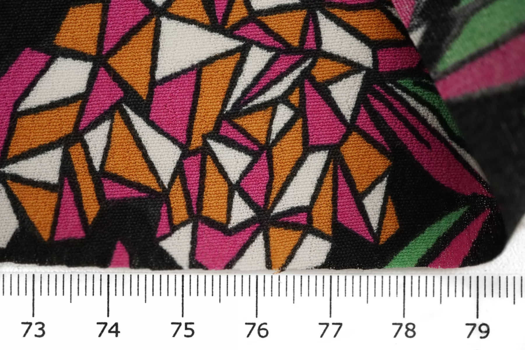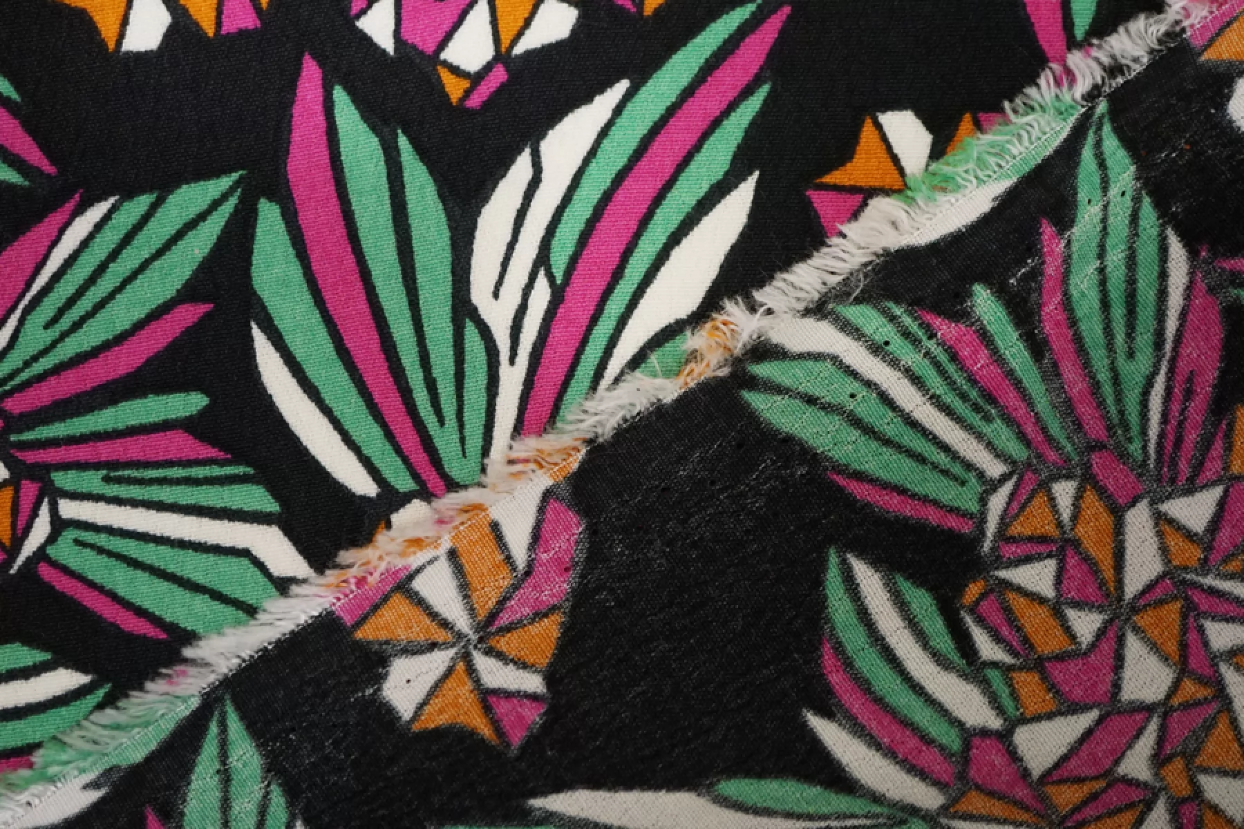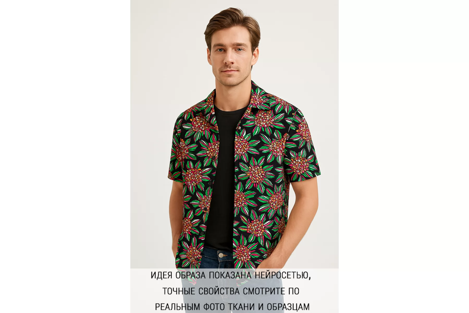 Креповая вискоза, плательно-блузочной плотности, с абстрактным ягодным принтом в оттенках зеленого, розового, молочного и рыже-терракотового. Тактильно ощущается зернистость. Просвечивает силуэт на просвет. Не мнется. Практически не держит форму. Не тянется, но пружинит за счет плетения. Шьем платья, блузки или юбки. Обязательно учитывайте усадку 5-10%. При необходимости используйте подкладочный материал.