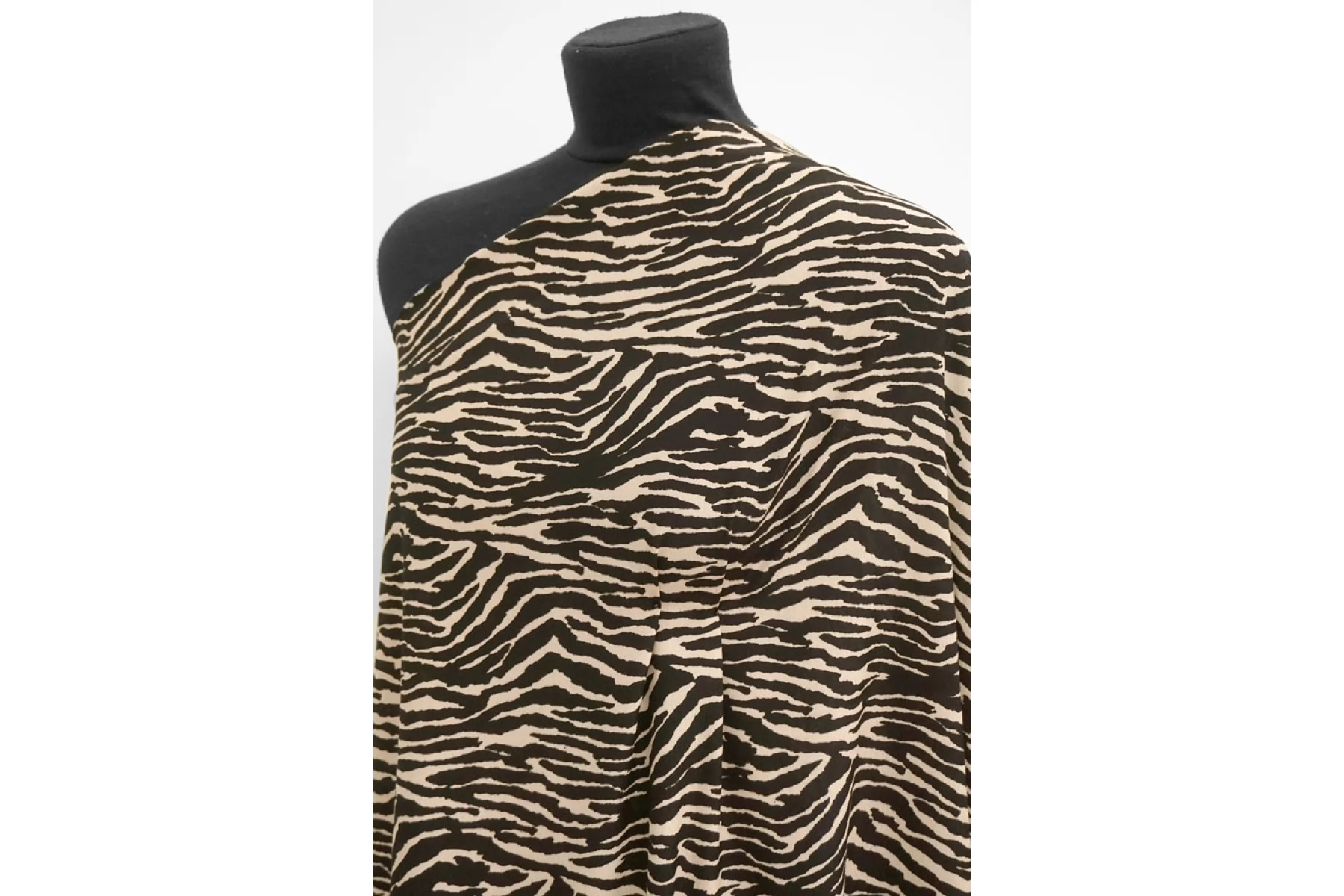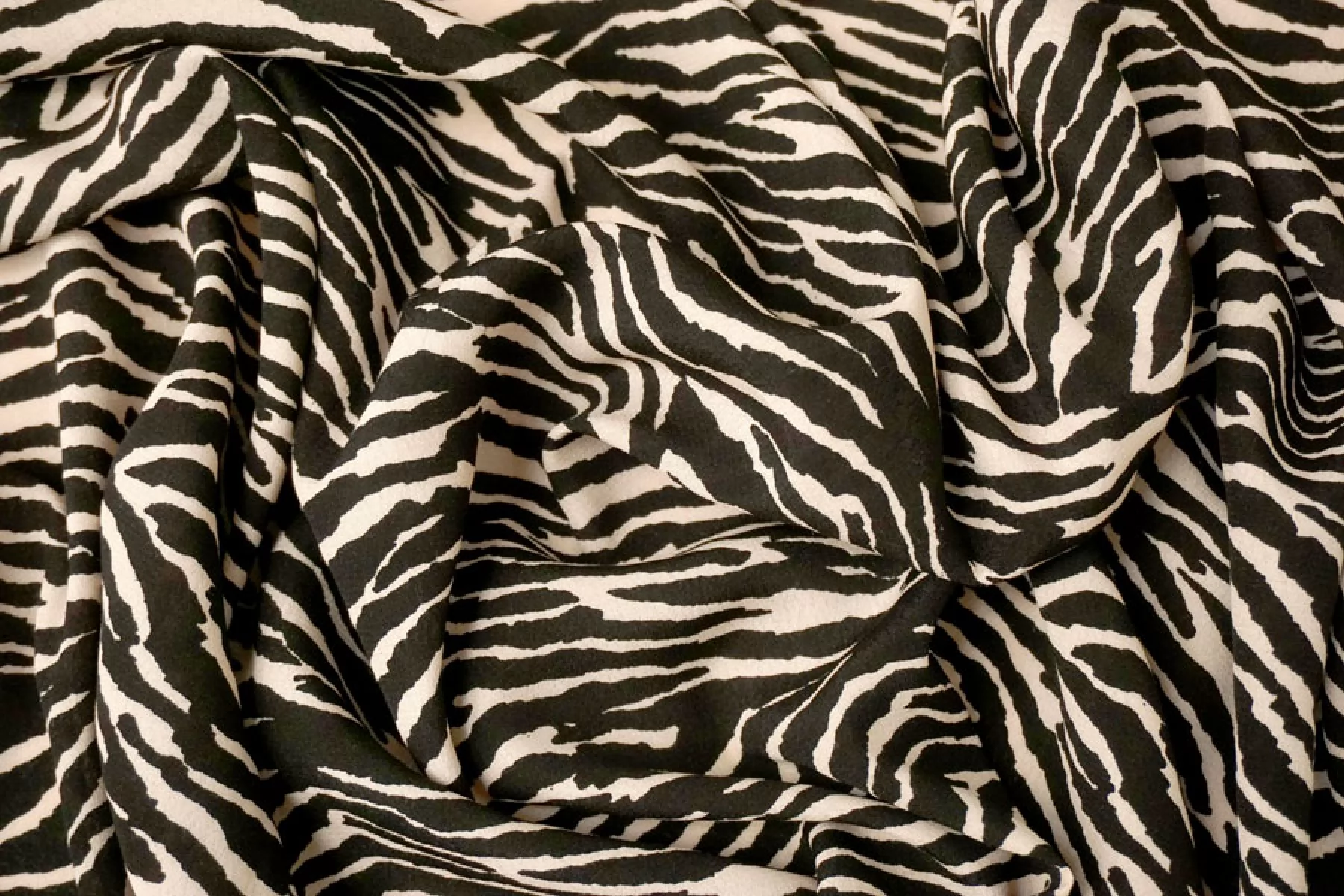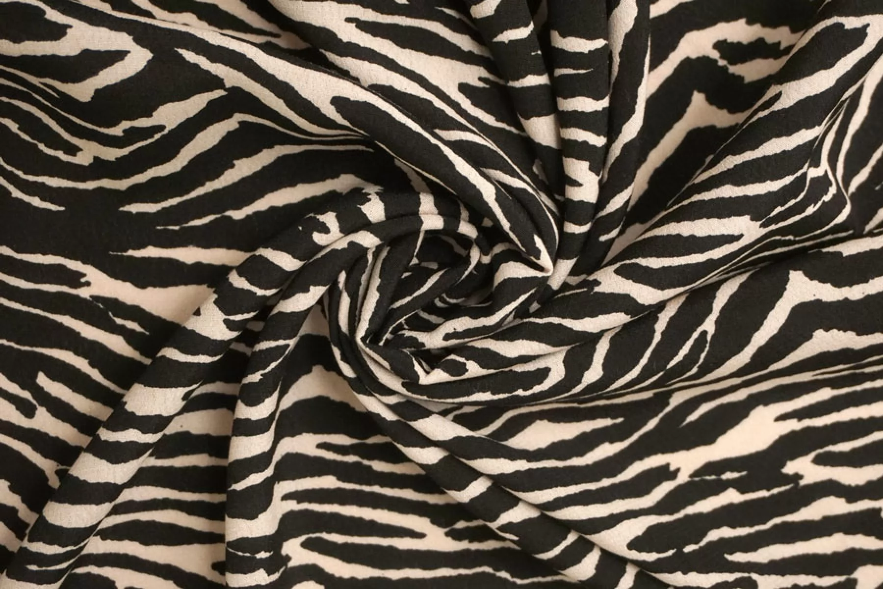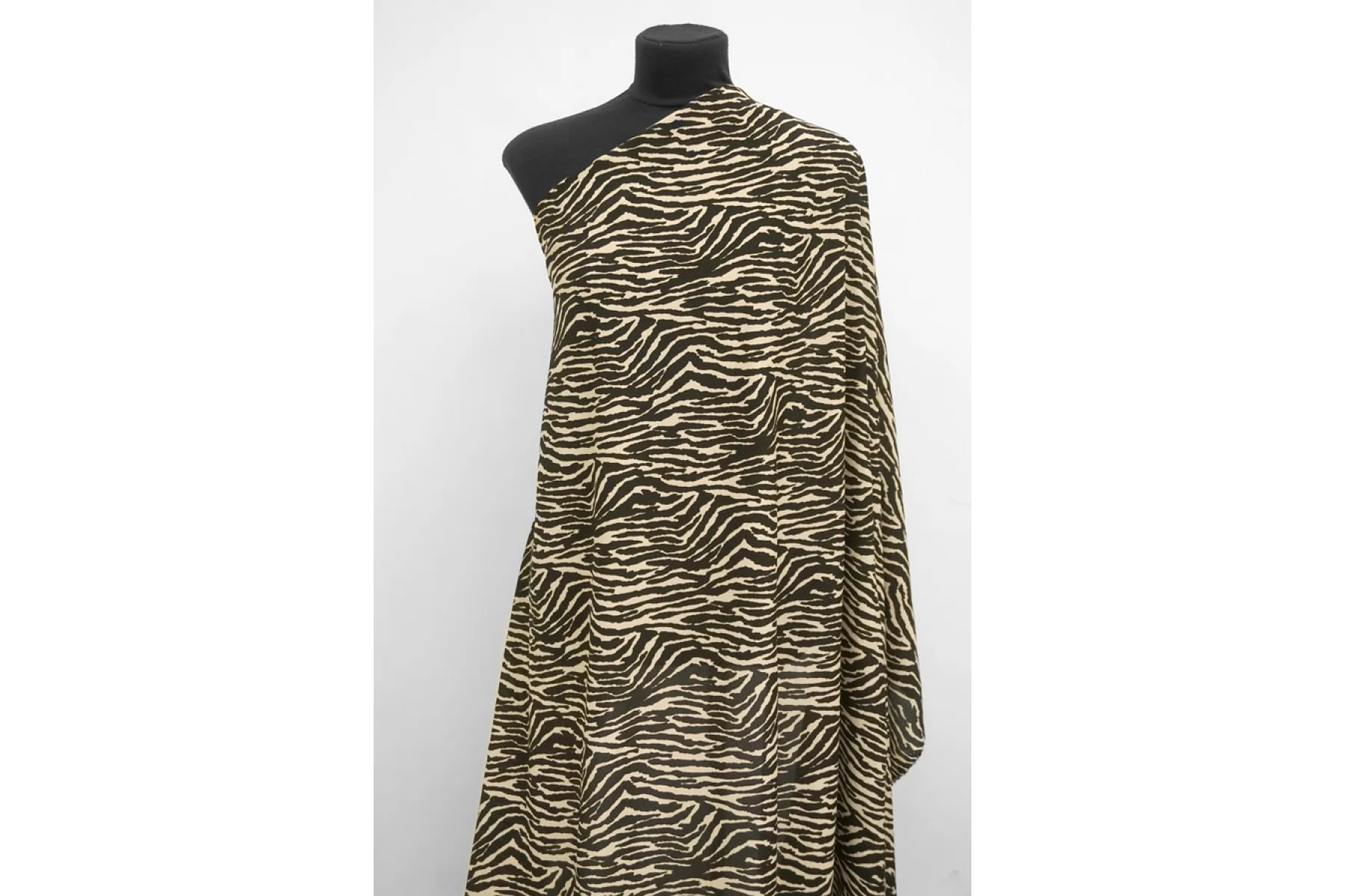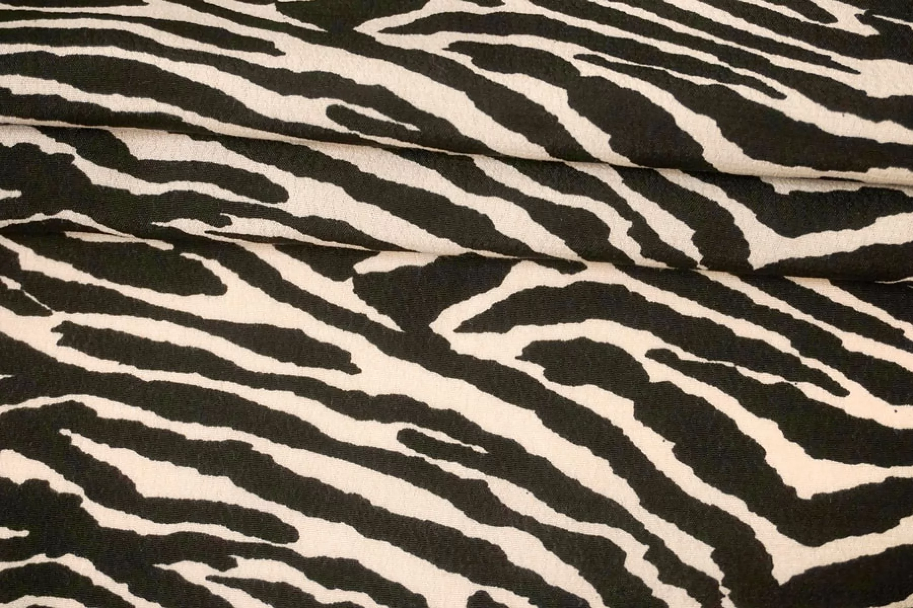 Креповая вискоза черного оттенка с анималистичными полосами зебры бежевого оттенка. Тактильно шероховатая, мягкая, приятная. Не тянется, но пружинит за счет плетения. Просвечивает силуэт на просвет. Нетолстая. Сминается совсем немного, но восстанавливается. Хорошо смотрится в своей пластике. Подойдет для пошива платья, блузки или юбки, а также одежды в пижамном стиле. Обязательно учитывайте усадку 5-10%. При необходимости используйте подкладочный материал.