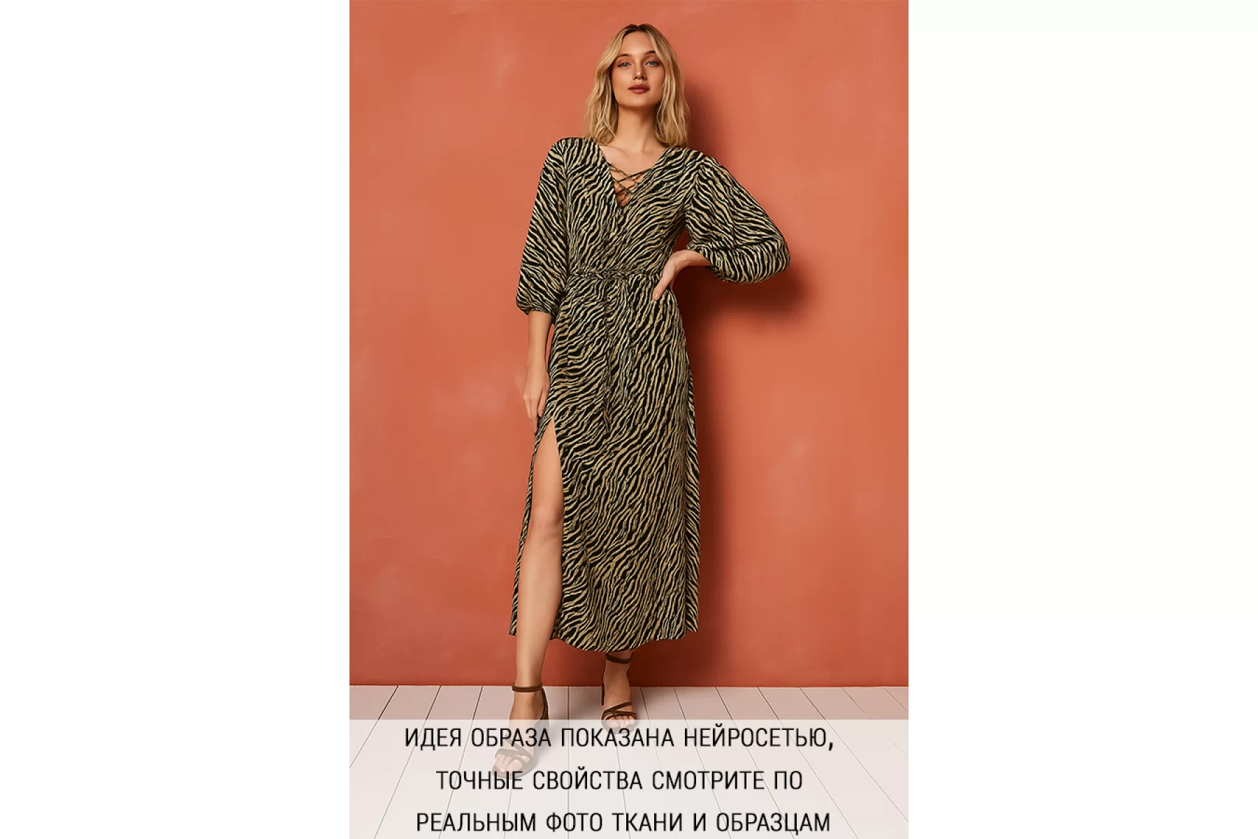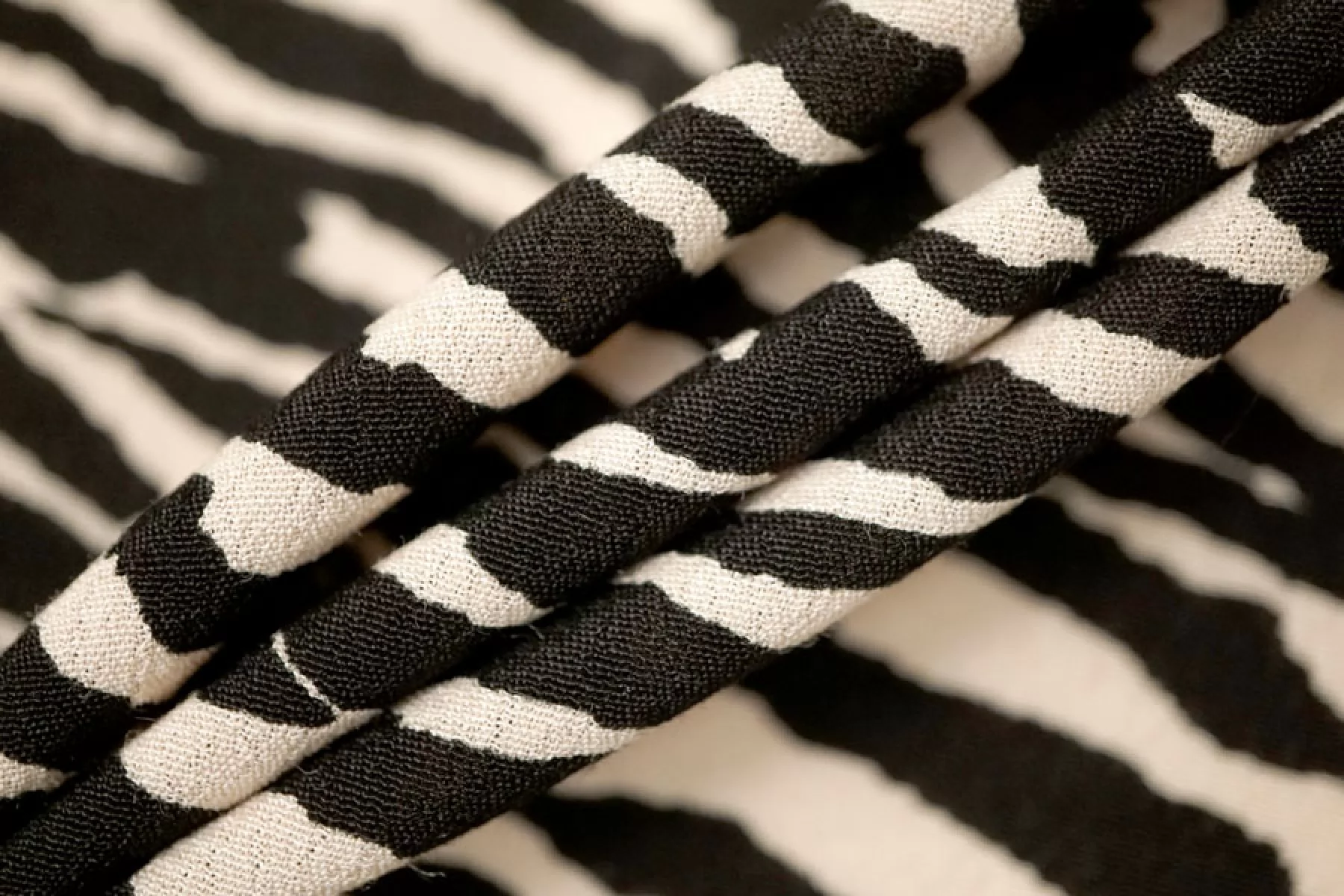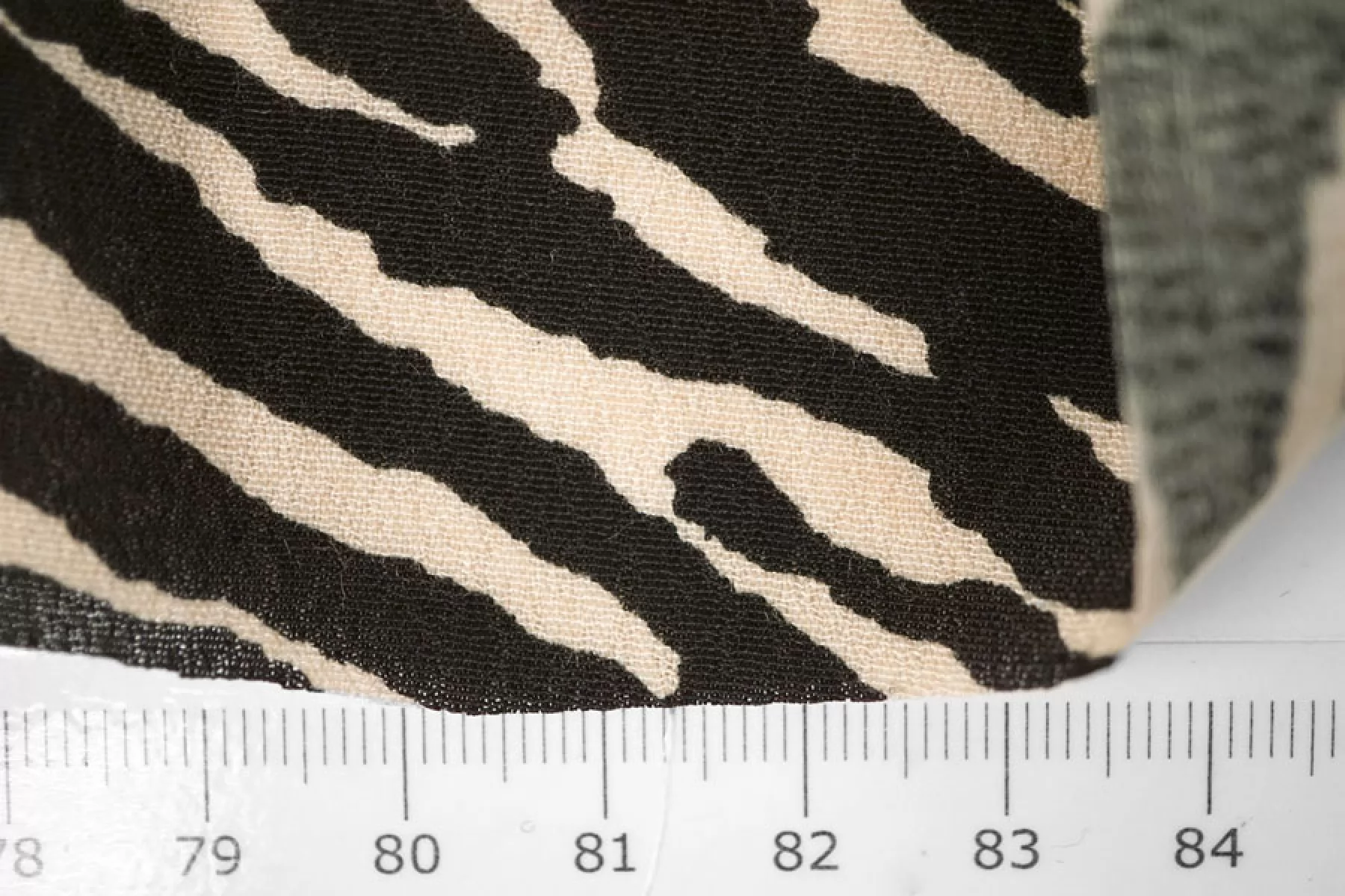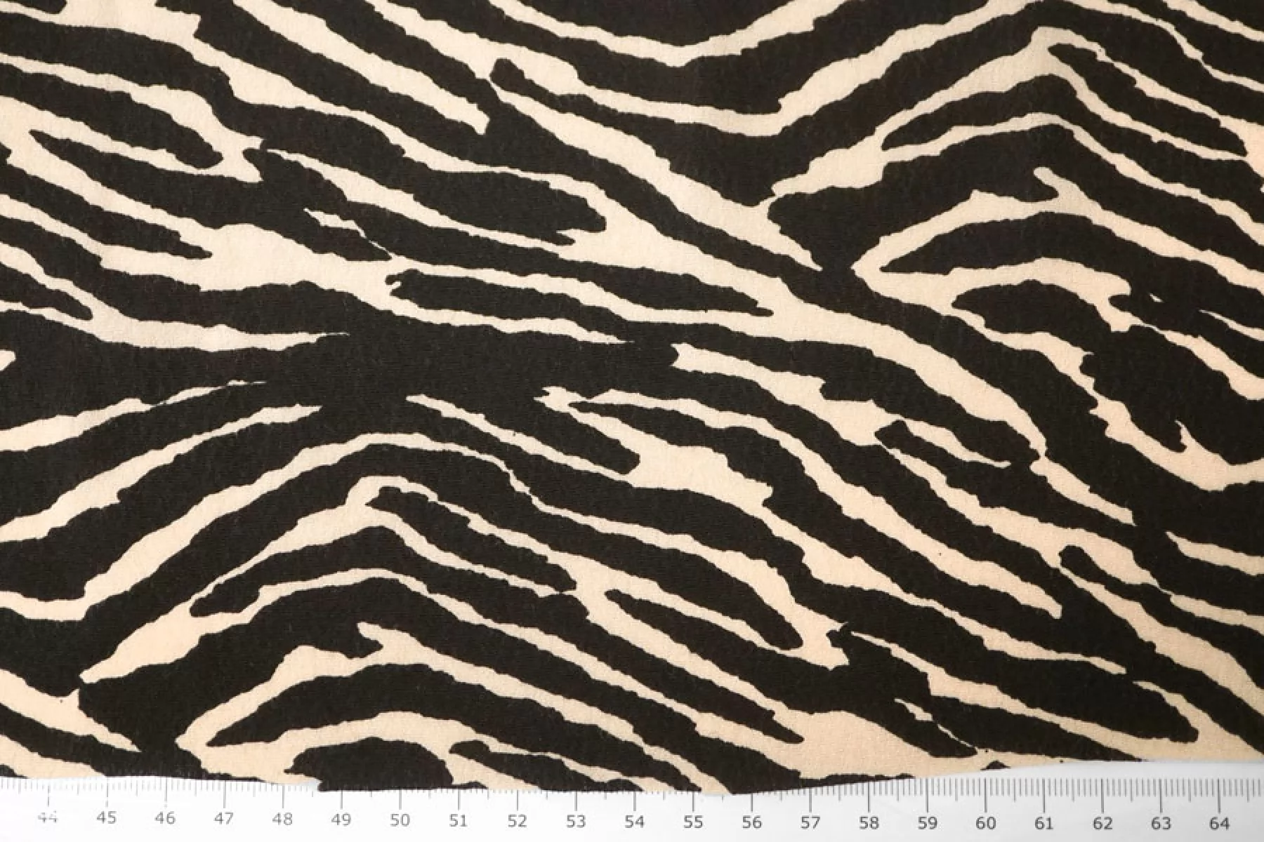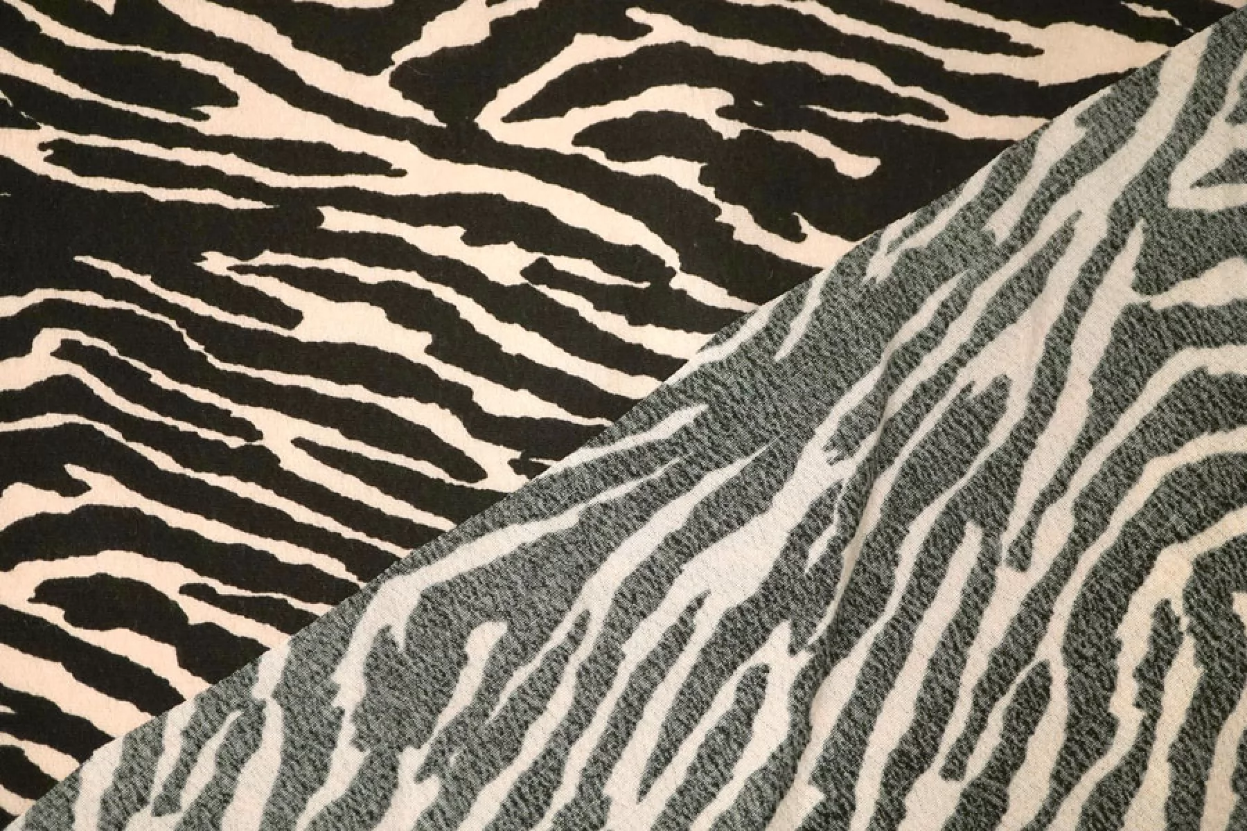 Креповая вискоза черного оттенка с анималистичными полосами зебры бежевого оттенка. Тактильно шероховатая, мягкая, приятная. Не тянется, но пружинит за счет плетения. Просвечивает силуэт на просвет. Нетолстая. Сминается совсем немного, но восстанавливается. Хорошо смотрится в своей пластике. Подойдет для пошива платья, блузки или юбки, а также одежды в пижамном стиле. Обязательно учитывайте усадку 5-10%. При необходимости используйте подкладочный материал.