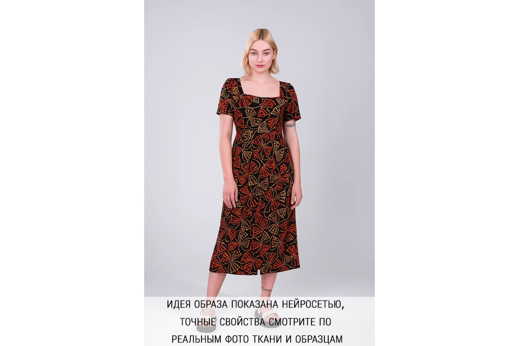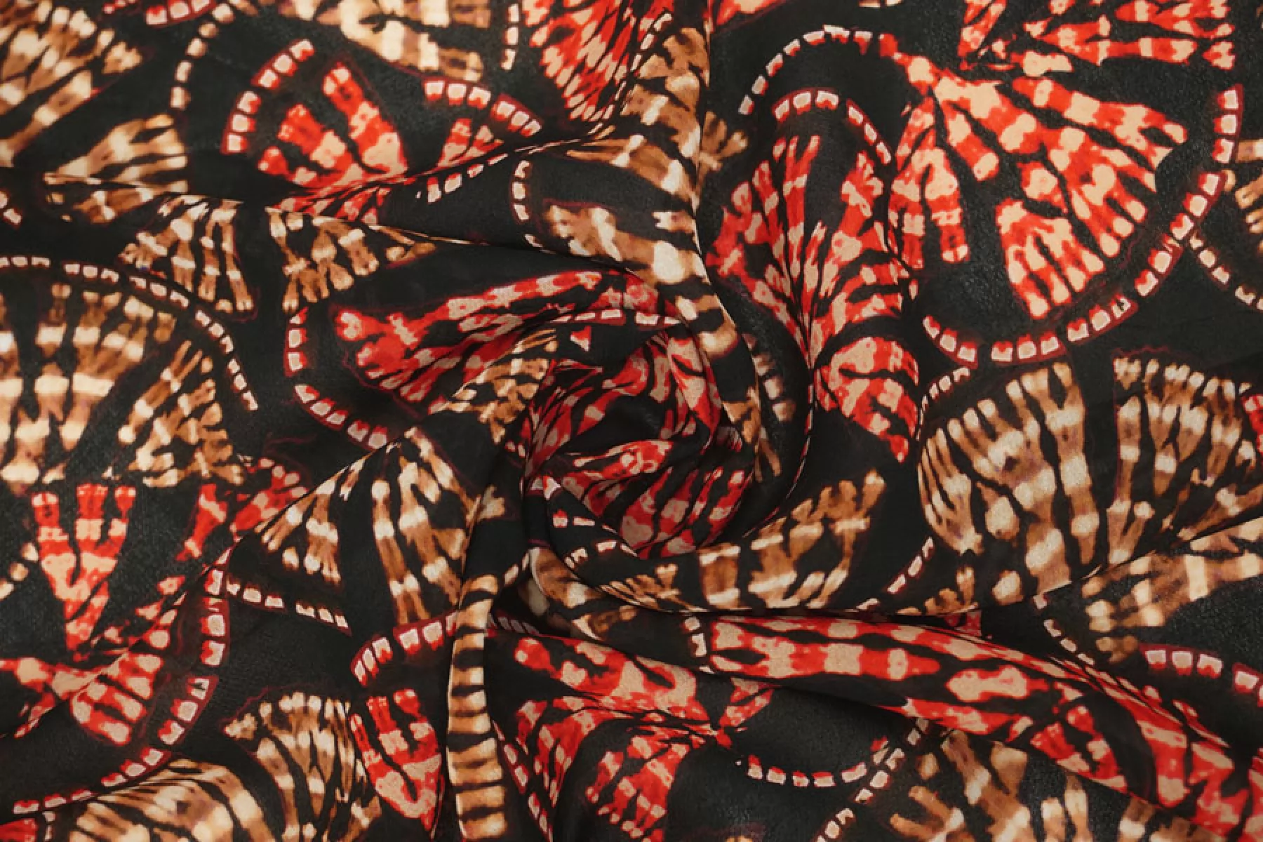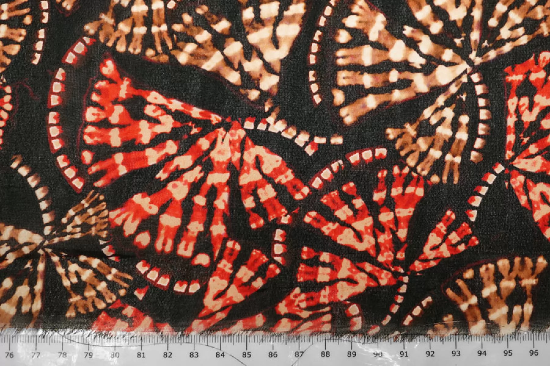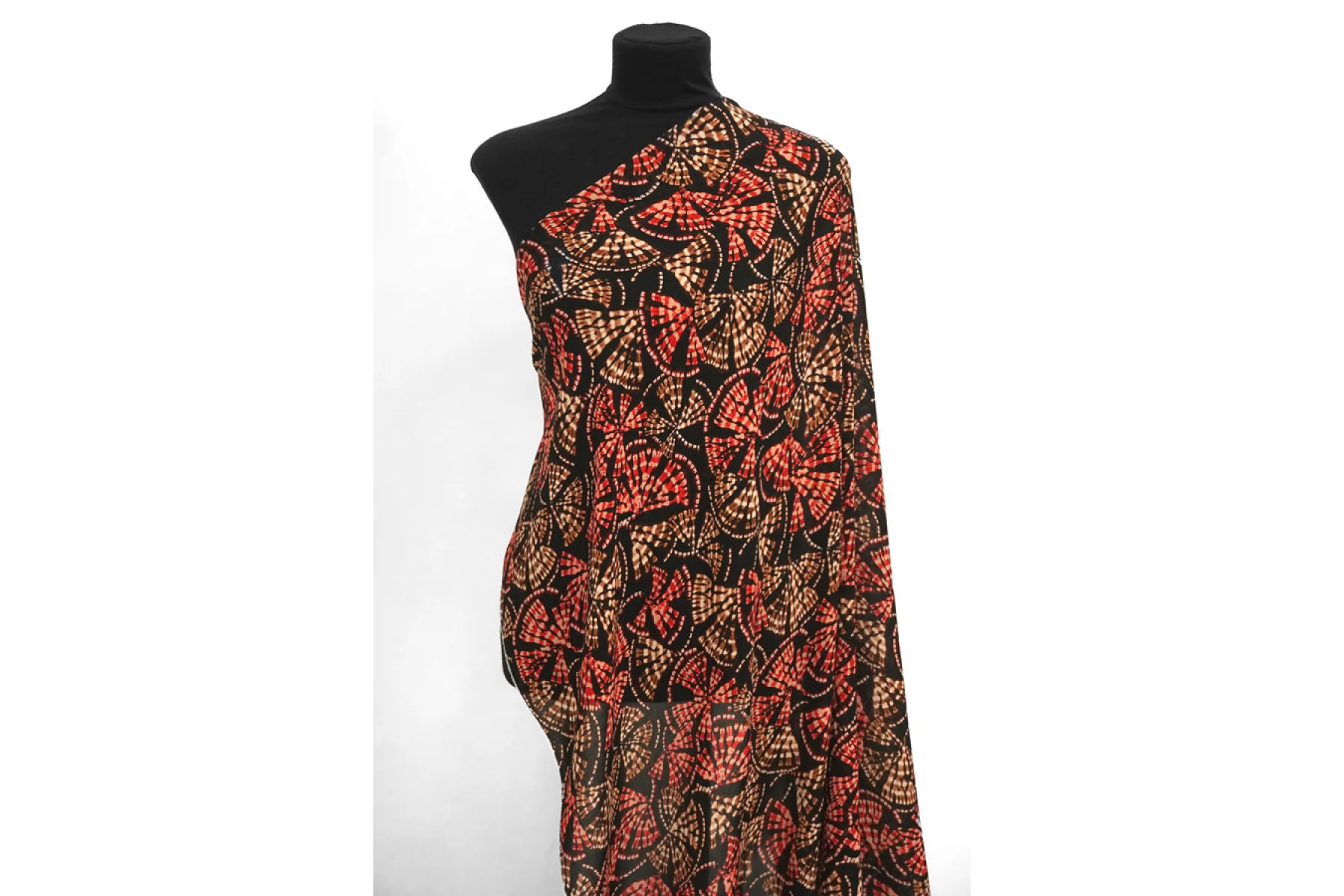 Тонкая креповая вискоза блузочно-плательной плотности в черном оттенке с абстрактным принтом, напоминающим цветы, в оттенках красного, винного, коричневого и не только. Тактильно шероховатая. Не тянется, но слегка пружинит за счет плетения. Просвечивает силуэт. Немного мнется, но восстанавливается. Хороша в складках. Отлично подойдет на платья, блузки или юбки. Обязательно учитывайте усадку 5-10%. При необходимости используйте подкладочный материал.