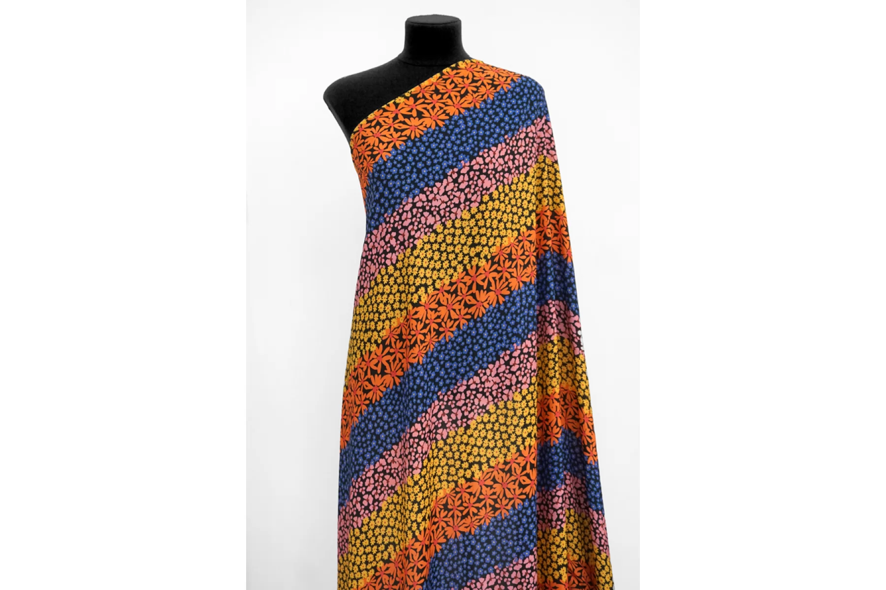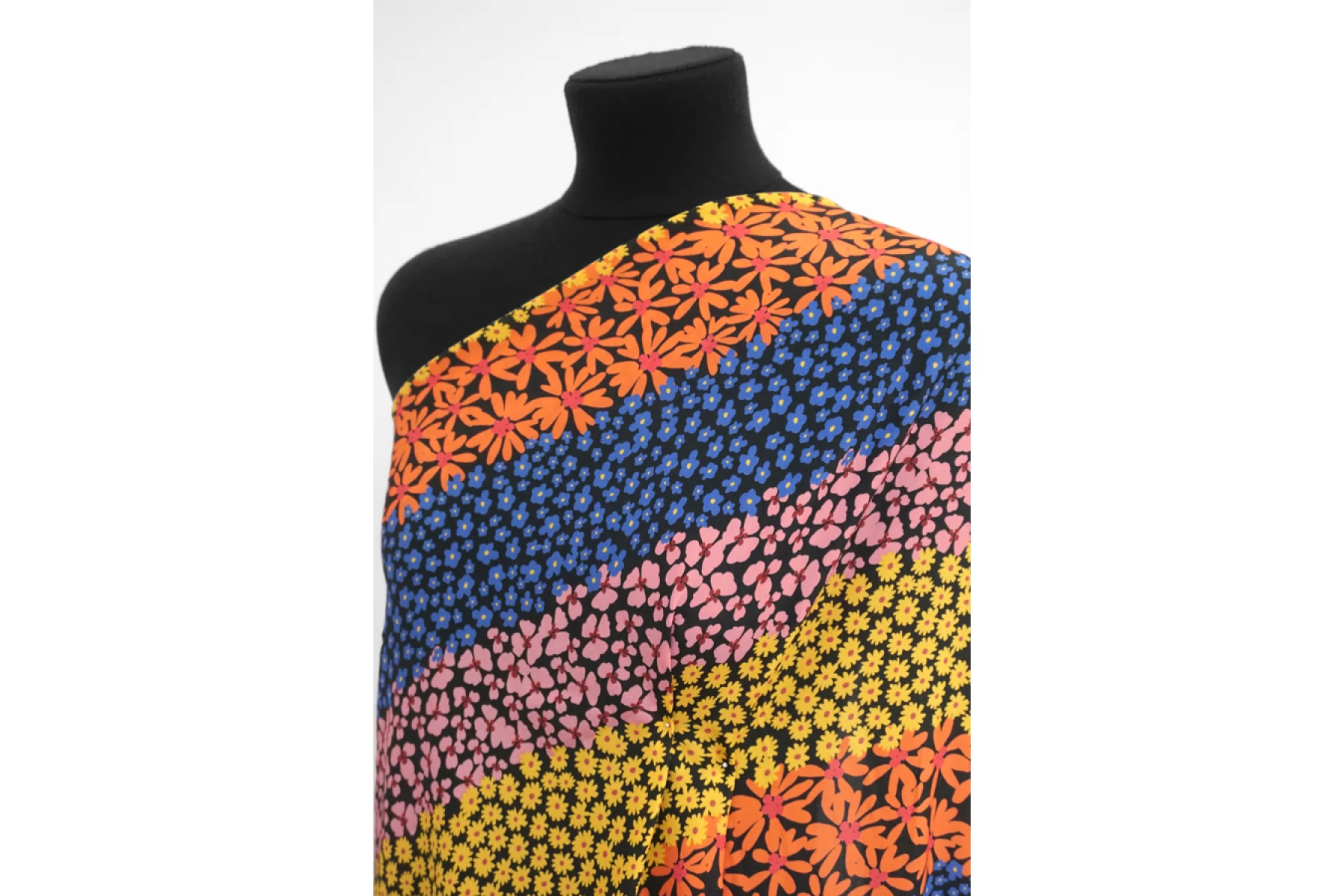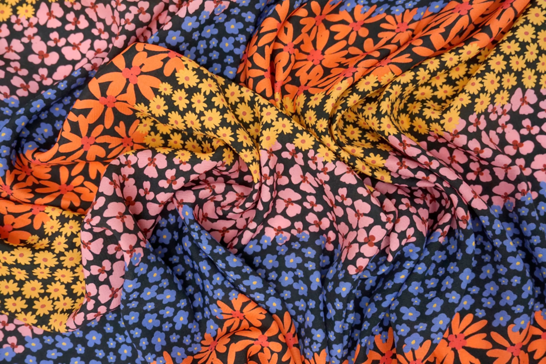 Плательно-блузочная креповая вискоза черного цвета с необычным принтом: разные цветы по цвету и форме, которые располагаются полосами по ширине(желтые, розовые, синие, оранжевые оттенки). Материал тактильно приятный, мягкий, гладкий, еле-еле ощущается шероховатость. Просвечивает силуэт, если смотреть на просвет. Легкая и струящаяся. Форму не держит, но красива в складке. Не тянется Отличный и необычный вариант на блузки, платья, юбки. Обязательно учитывайте усадку 5-10%. При необходимости используйте подкладочный материал