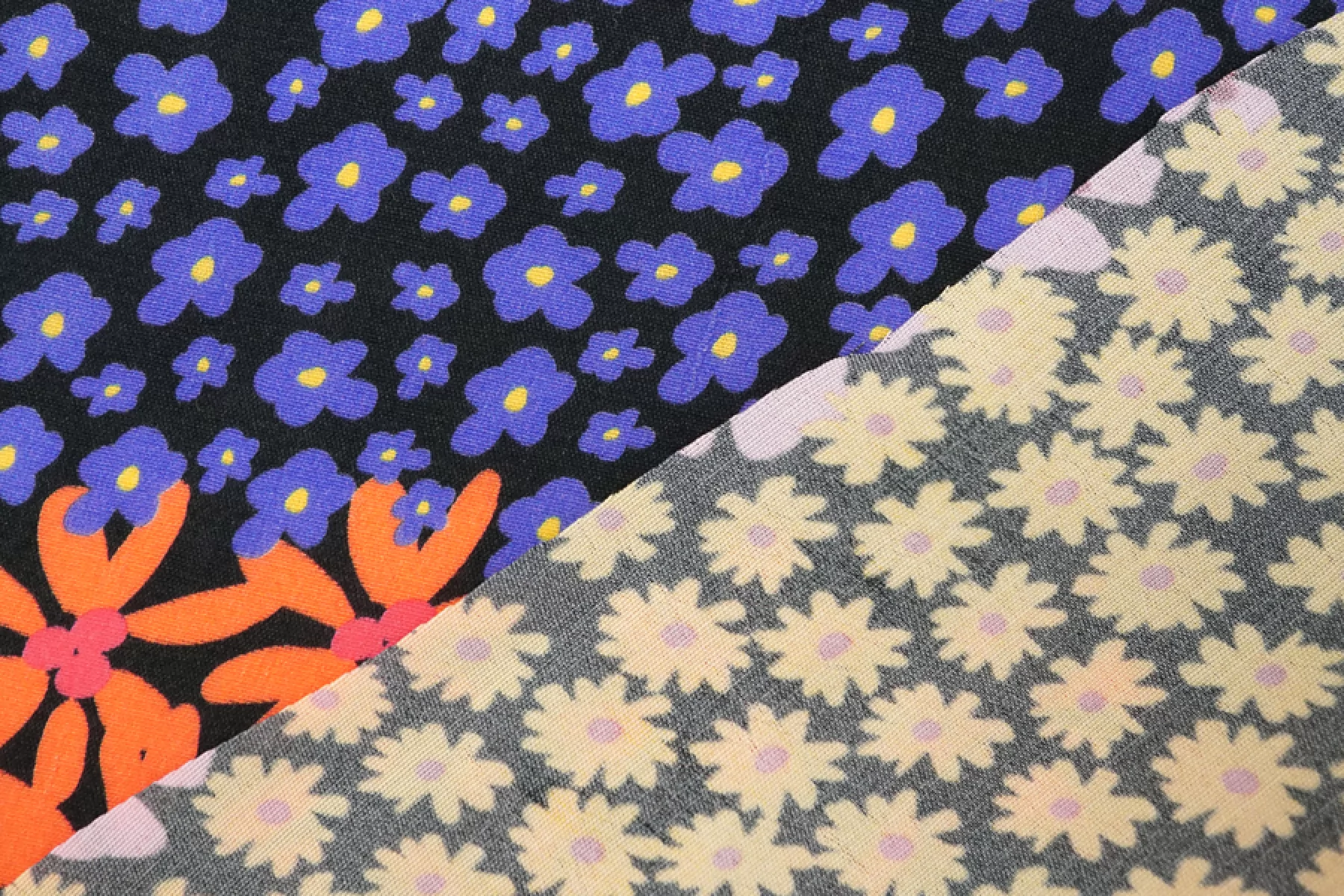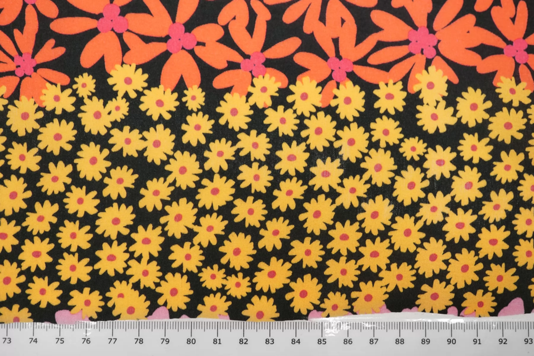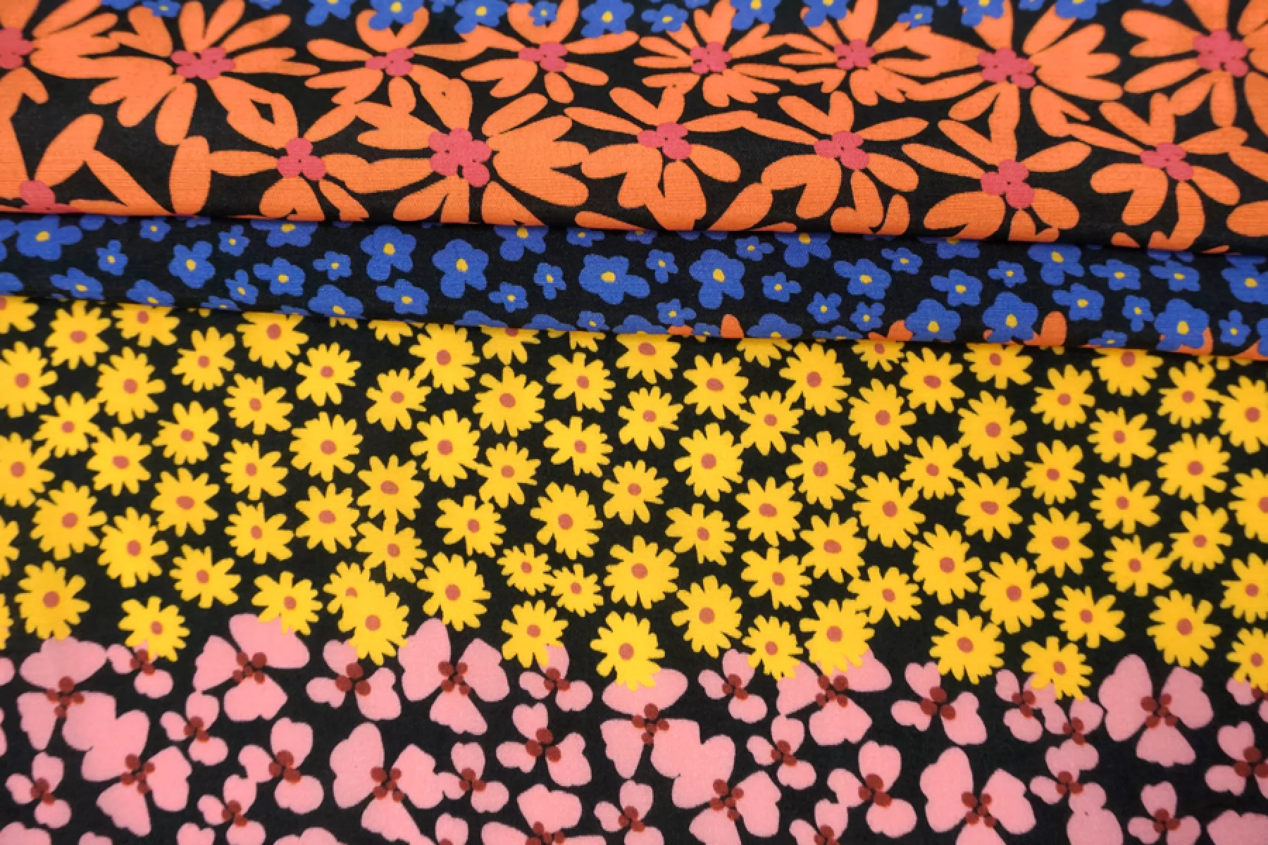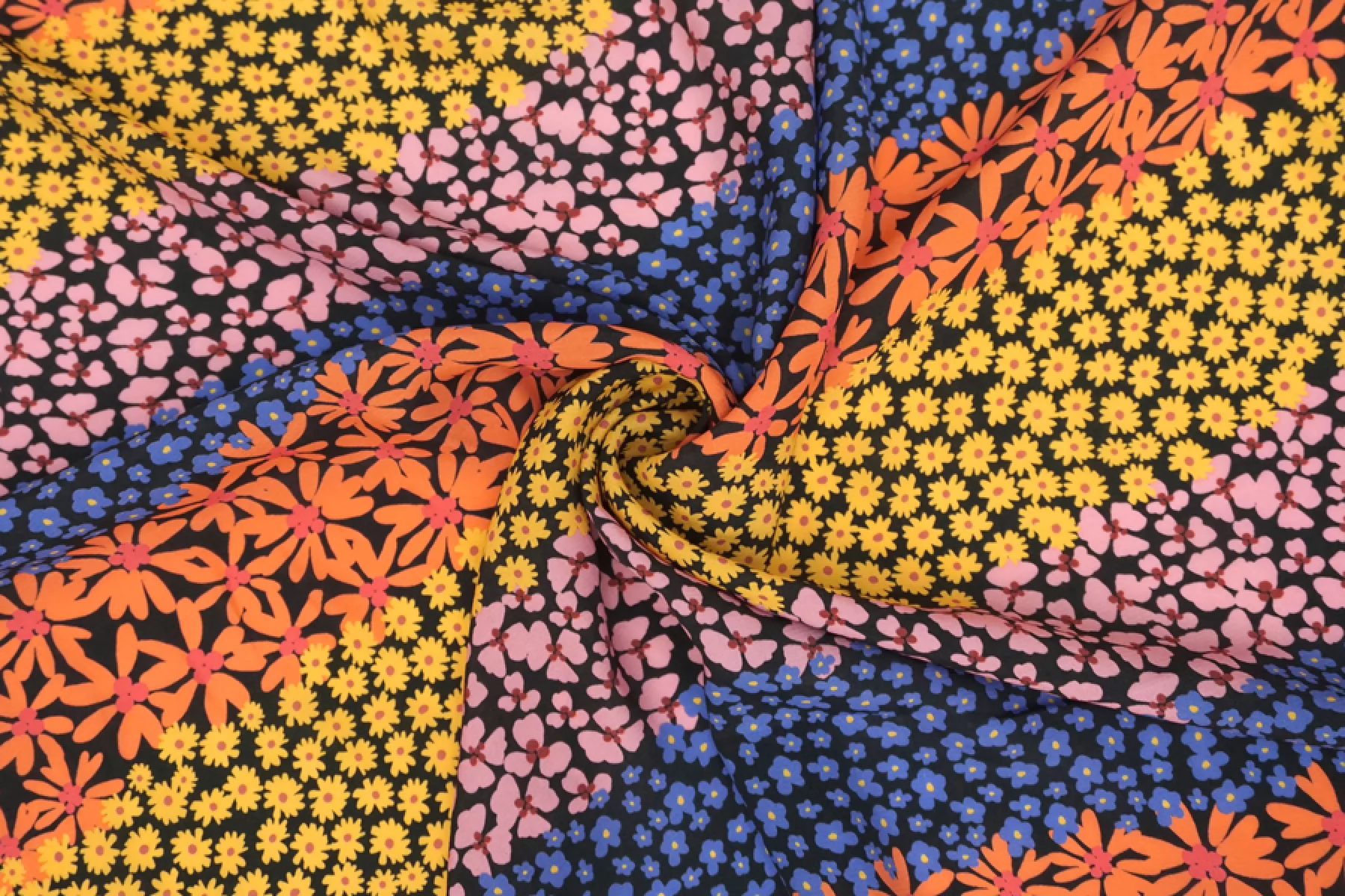 Плательно-блузочная креповая вискоза черного цвета с необычным принтом: разные цветы по цвету и форме, которые располагаются полосами по ширине(желтые, розовые, синие, оранжевые оттенки). Материал тактильно приятный, мягкий, гладкий, еле-еле ощущается шероховатость. Просвечивает силуэт, если смотреть на просвет. Легкая и струящаяся. Форму не держит, но красива в складке. Не тянется Отличный и необычный вариант на блузки, платья, юбки. Обязательно учитывайте усадку 5-10%. При необходимости используйте подкладочный материал