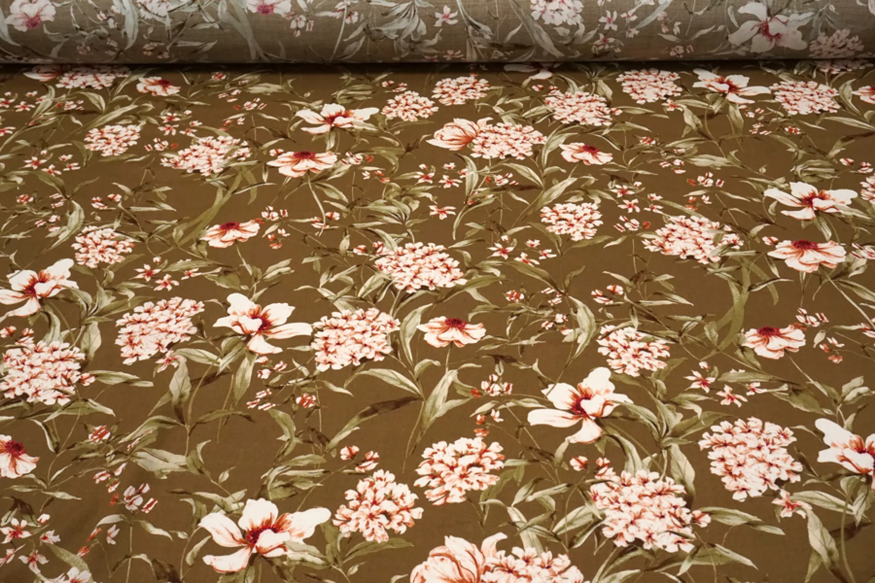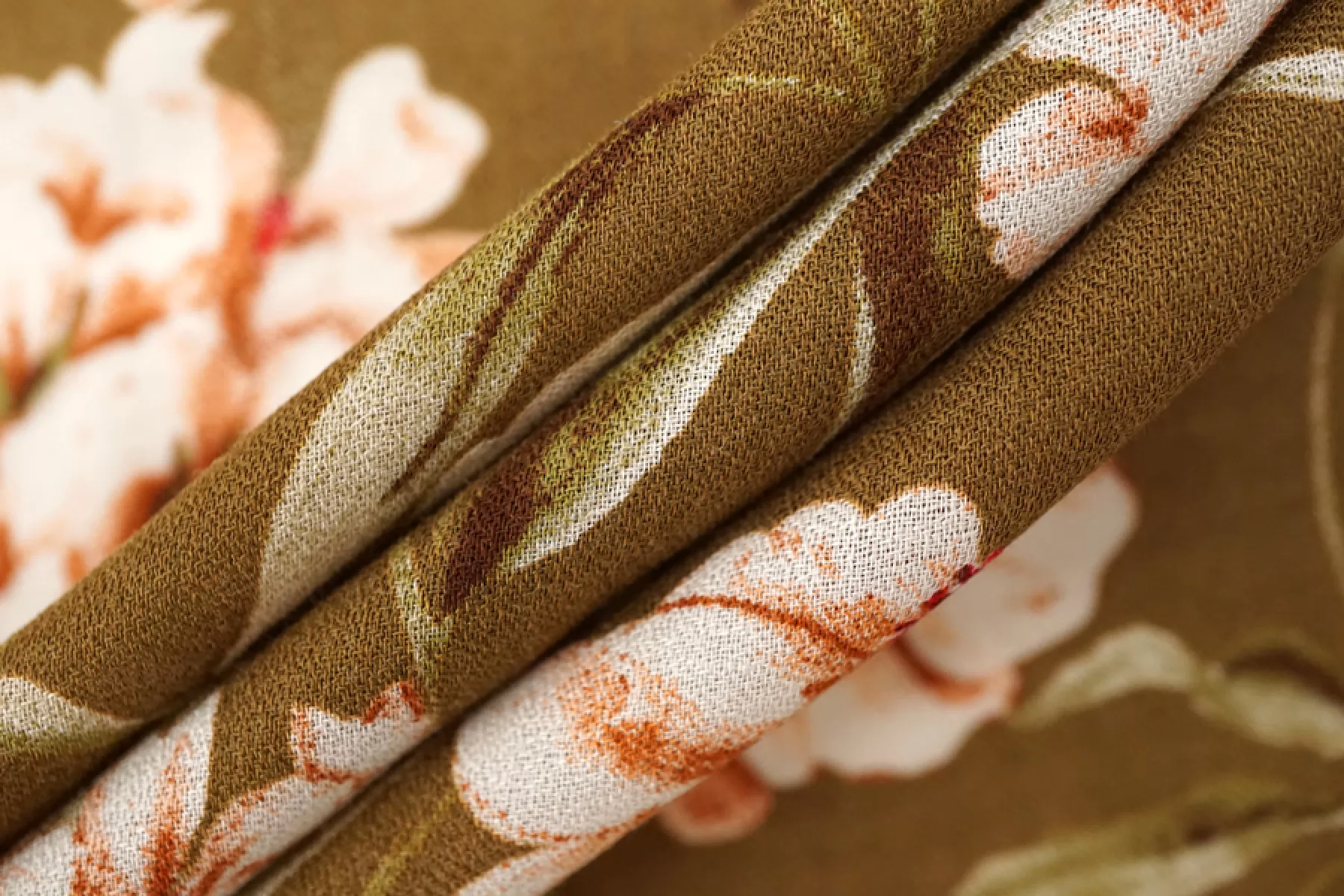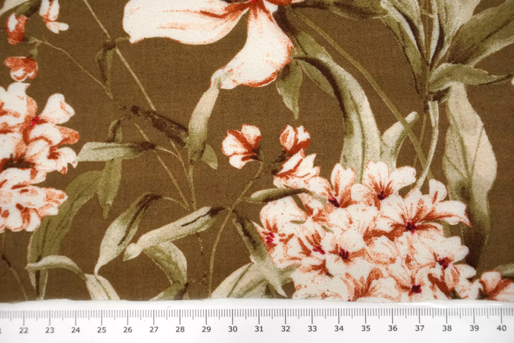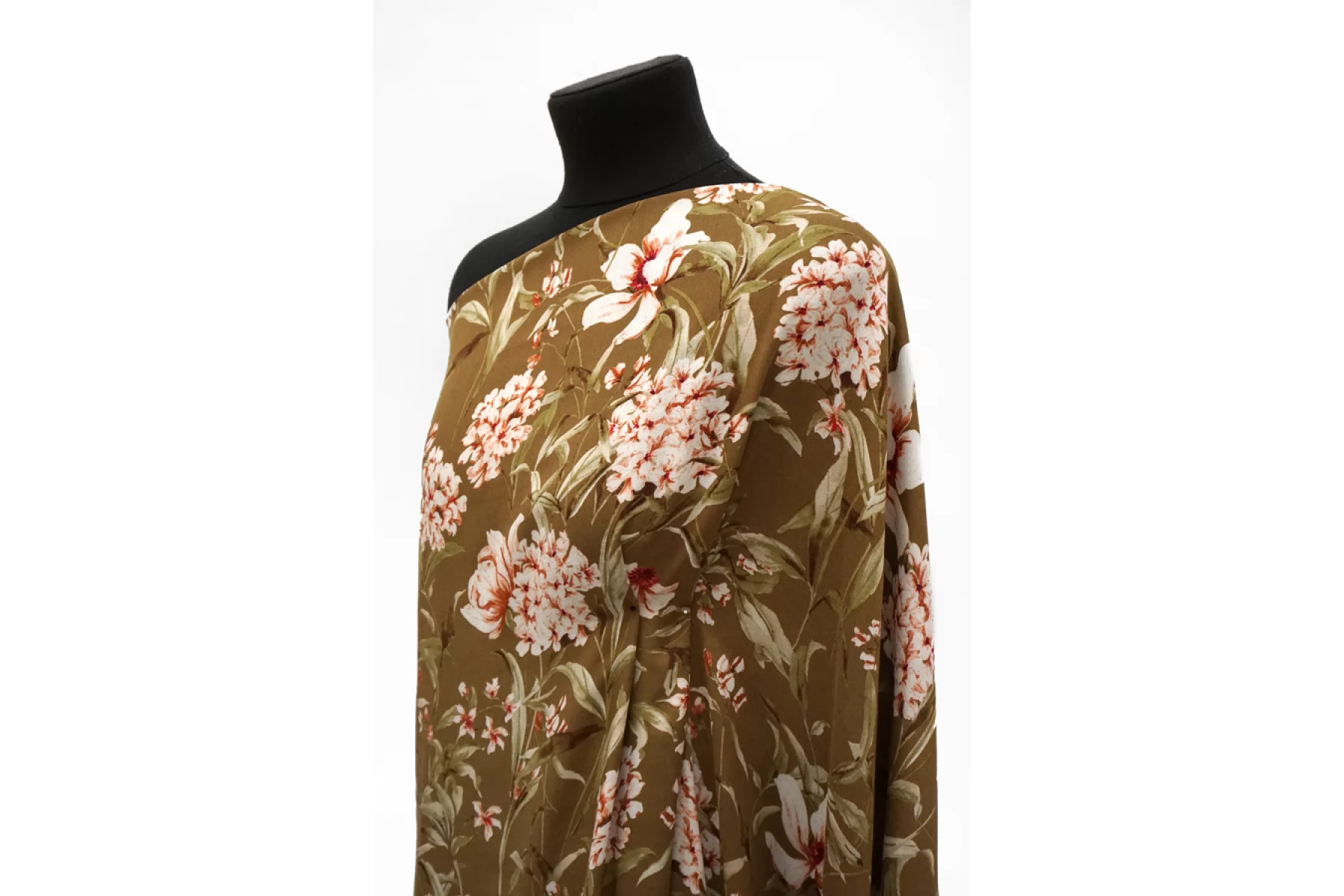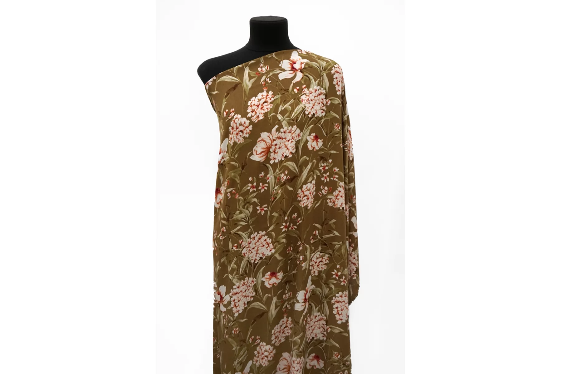Плательная вискоза с креповой поверхностью. Цветочный принт на фоне цвета хаки. Имеется бордюр в 26 см вдоль кромки справа. Шероховатый материал, струящийся. Подойдет для пошива платья, топа, блузки, юбки. Тонкий, пластичный, просвечивает темное, при пошиве платья или юбки советуем телесное белье или подкладку. При работе с этой тканью советуем использовать тонкие иглы и нитки.