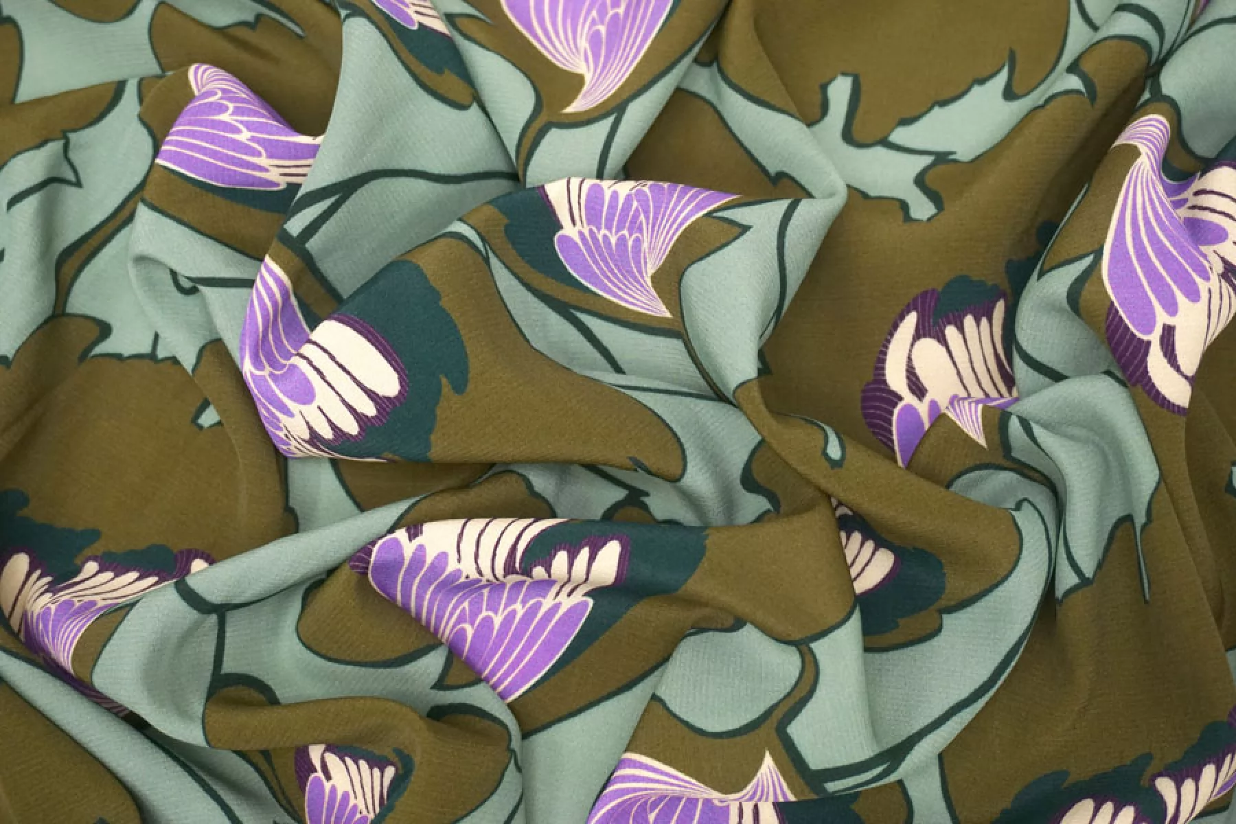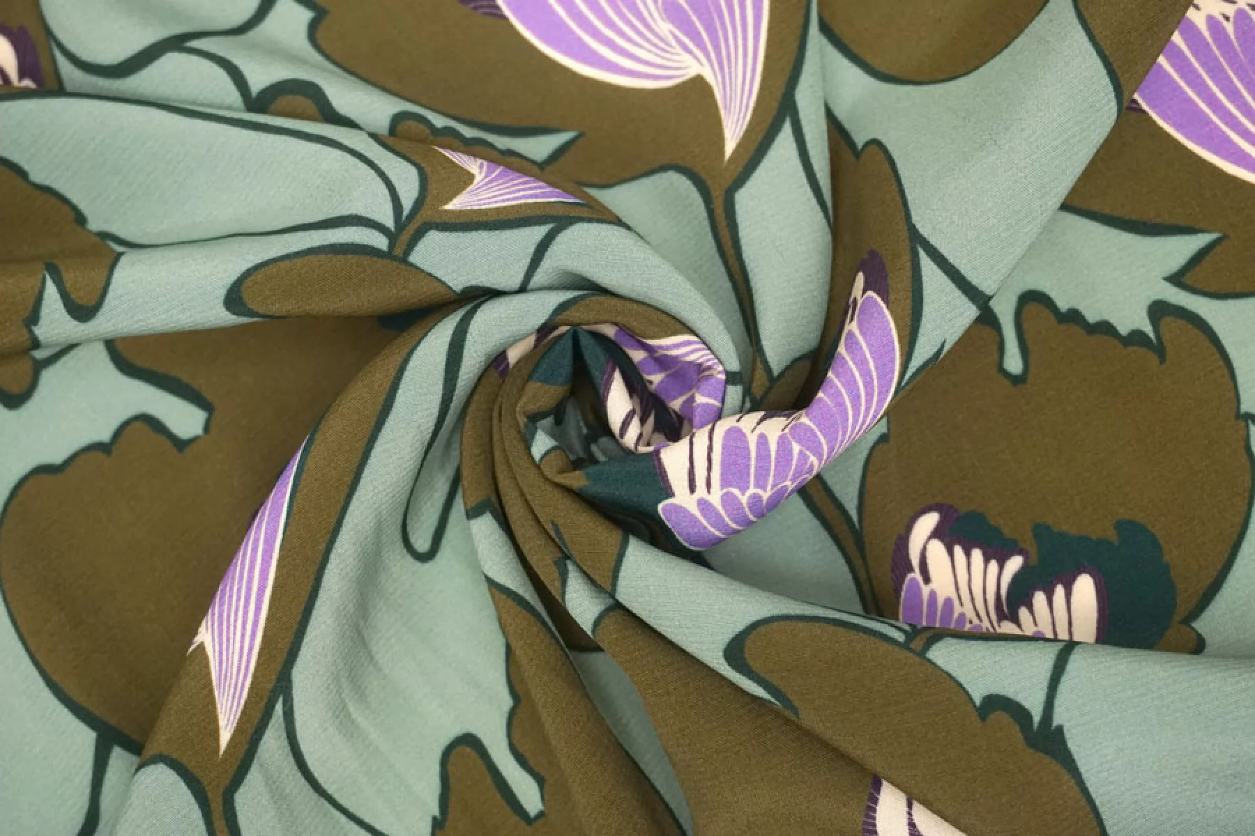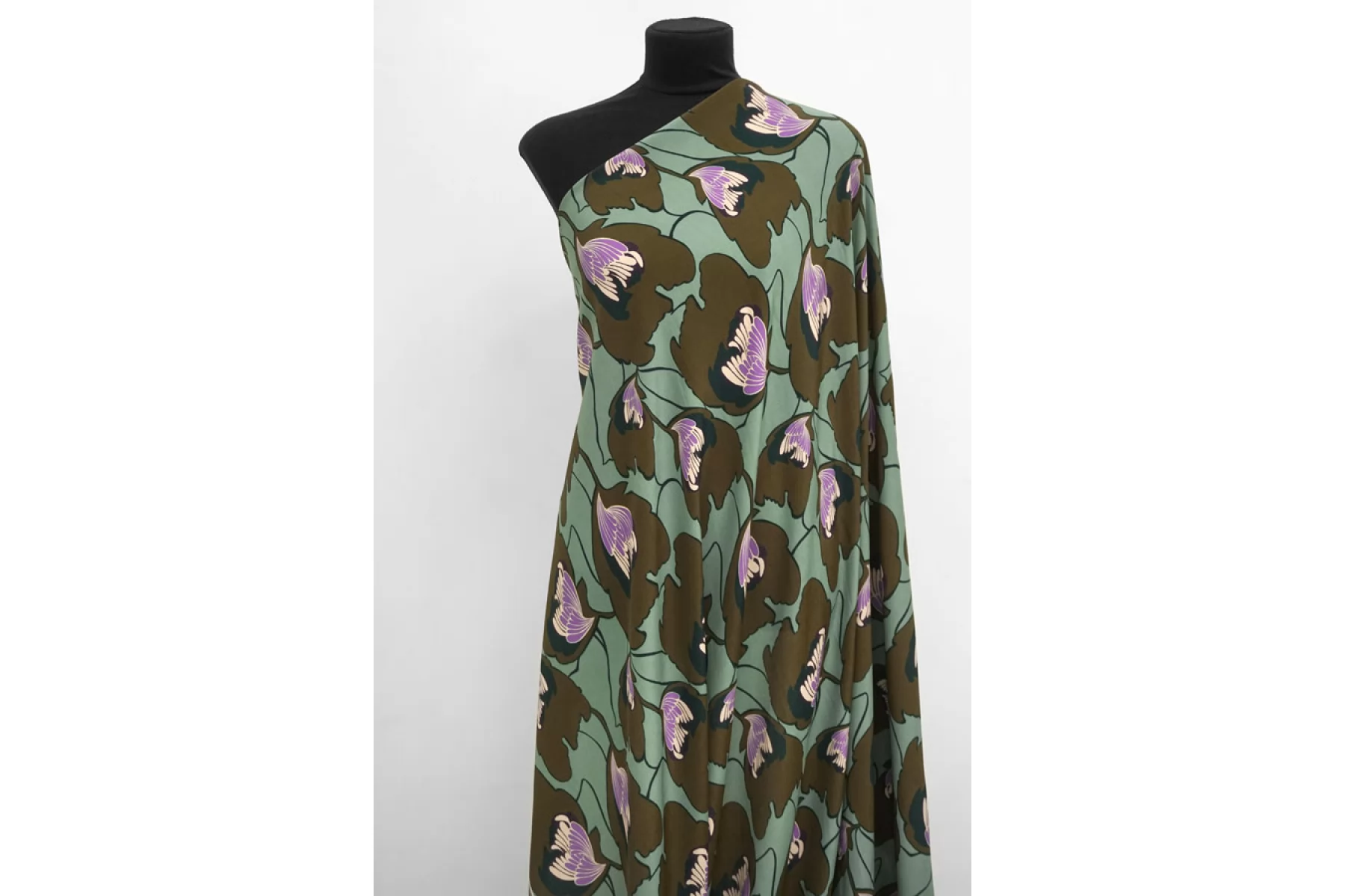 Креповая плательно-блузочная вискоза оттенка темного хаки с абстрактно-цветочным принтом в оттенках зелено-бирюзового, сиреневого, молочно-персикового, серо-бирюзового и фиолетового. Тактильно слегка шероховатая, при этом мягкая и приятная. Не тянется. Просвечивает силуэт на просвет. Сминается. Хороша в складках и своей пластике. Прекрасно подойдет на платья, блузки или юбки. Обязательно учитывайте усадку 5-10%. При необходимости используйте подкладочный материал.