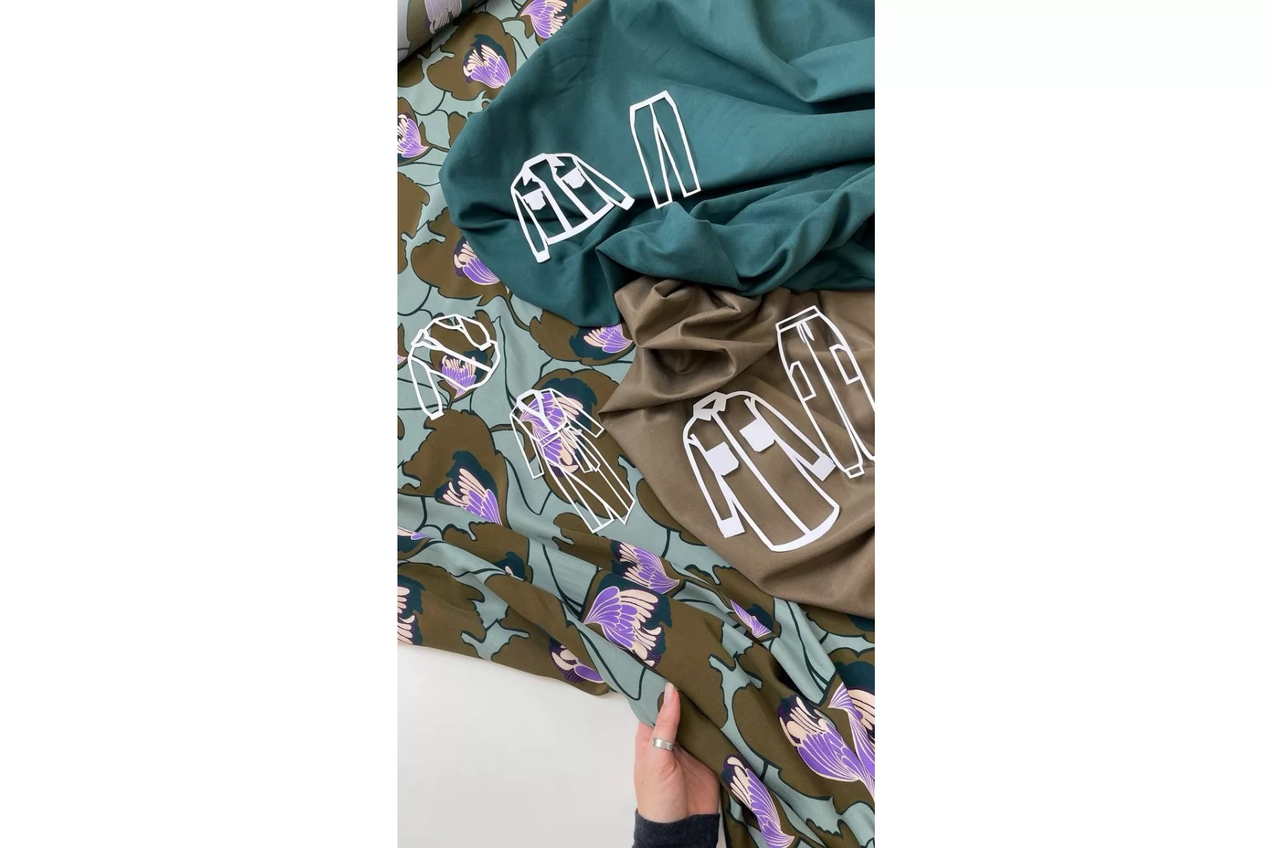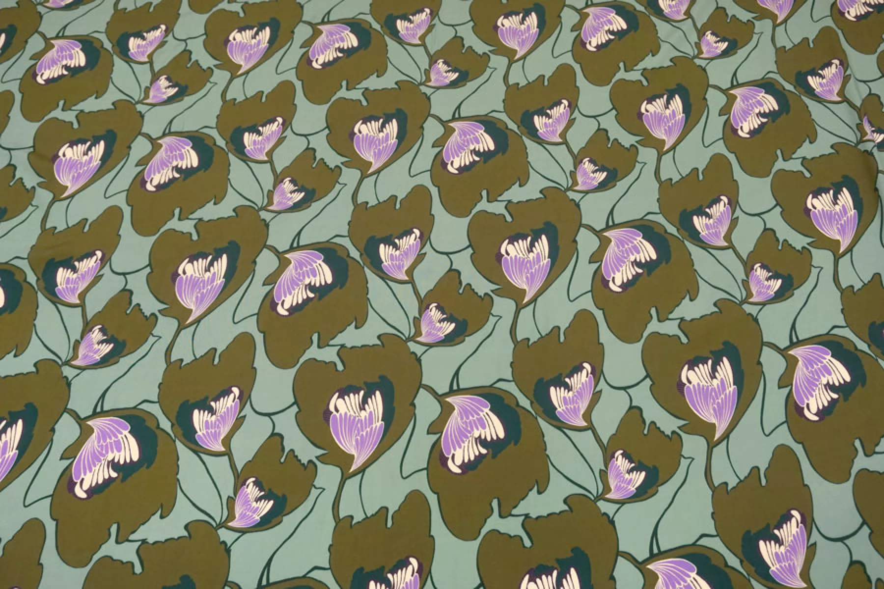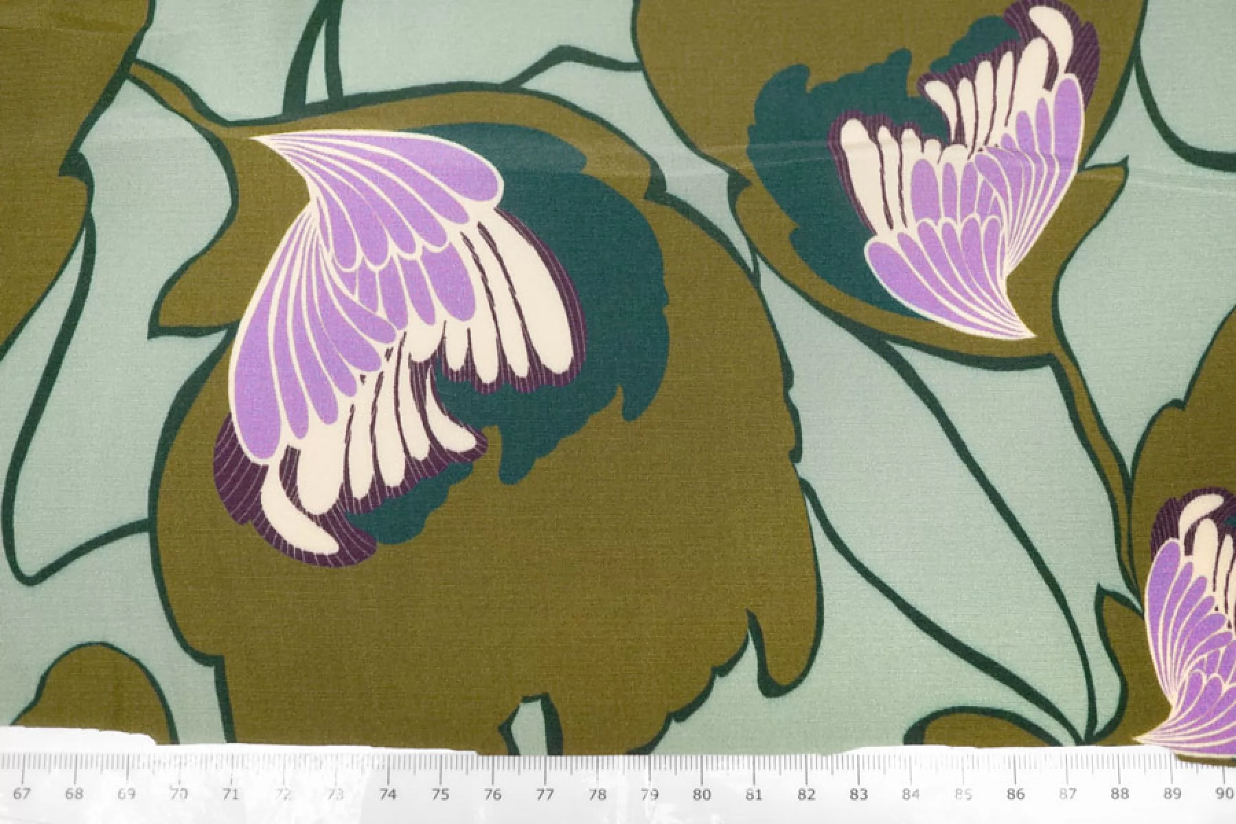 Креповая плательно-блузочная вискоза оттенка темного хаки с абстрактно-цветочным принтом в оттенках зелено-бирюзового, сиреневого, молочно-персикового, серо-бирюзового и фиолетового. Тактильно слегка шероховатая, при этом мягкая и приятная. Не тянется. Просвечивает силуэт на просвет. Сминается. Хороша в складках и своей пластике. Прекрасно подойдет на платья, блузки или юбки. Обязательно учитывайте усадку 5-10%. При необходимости используйте подкладочный материал.