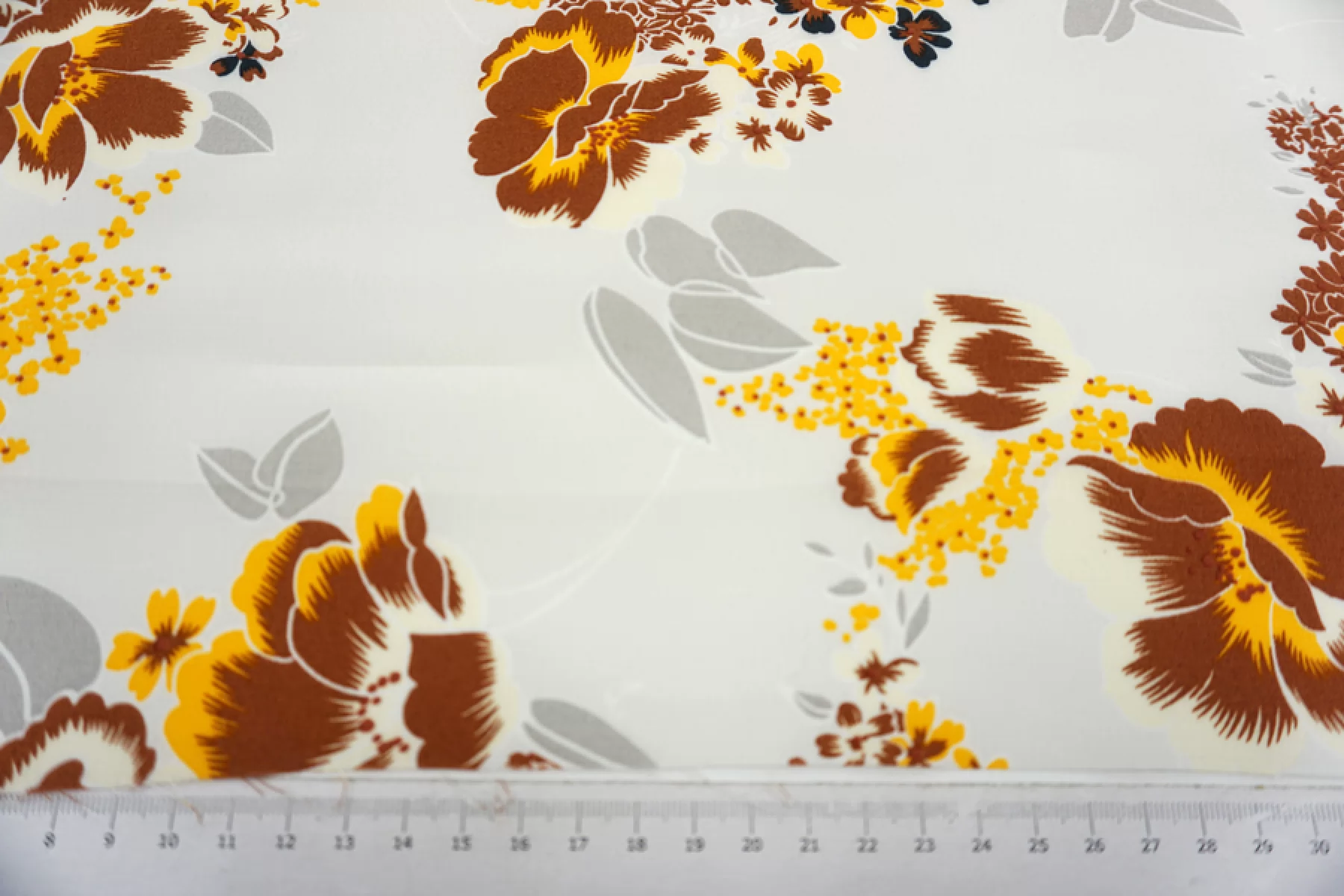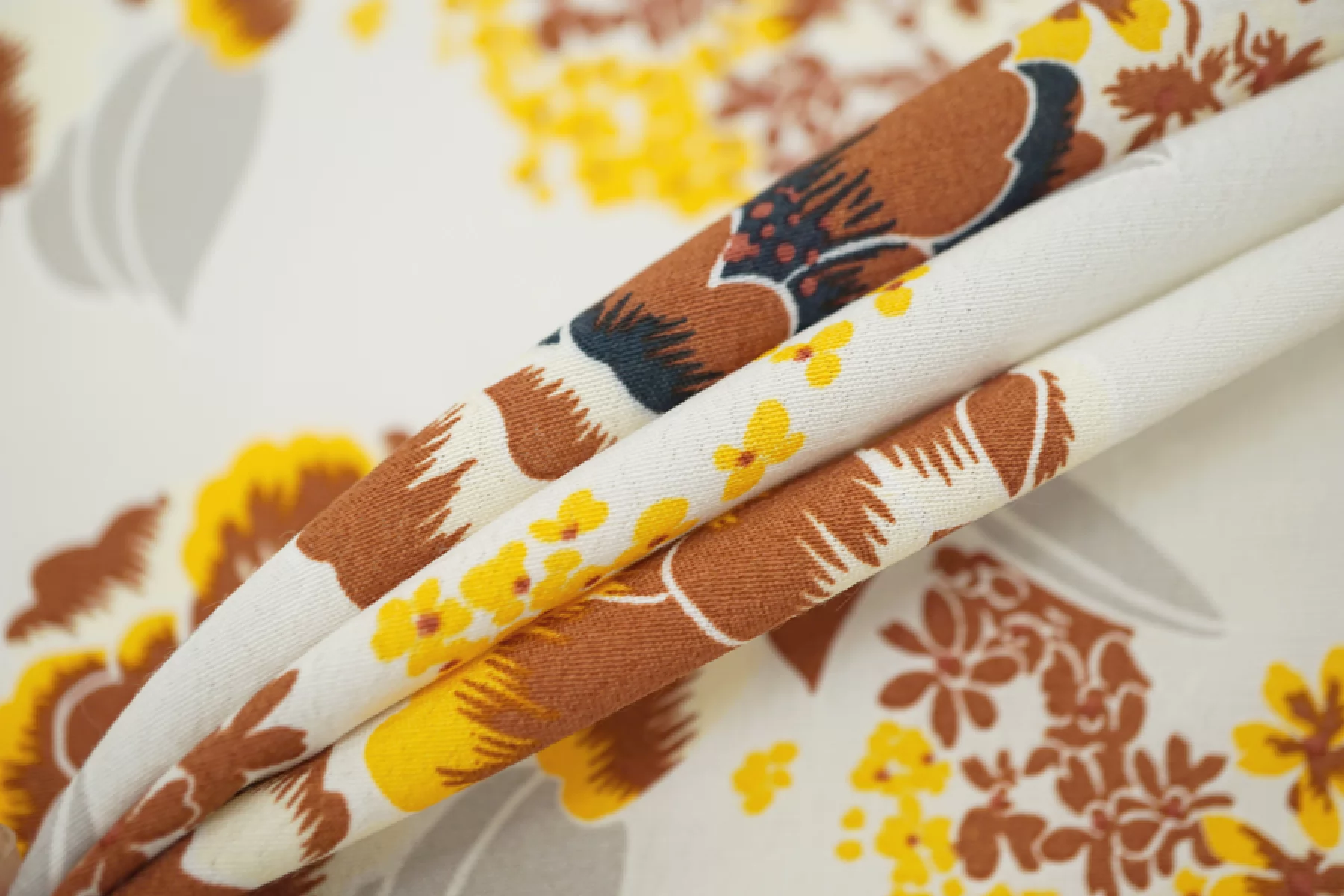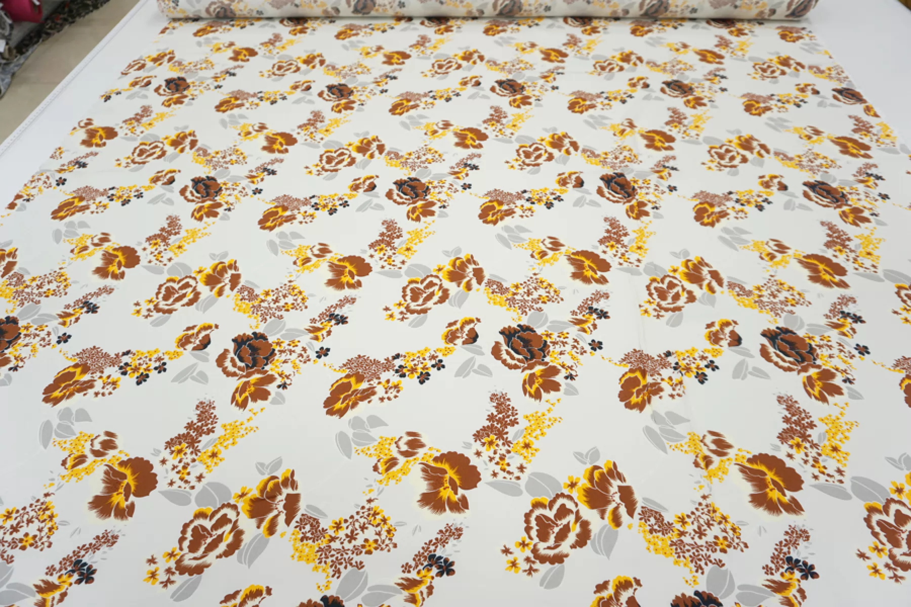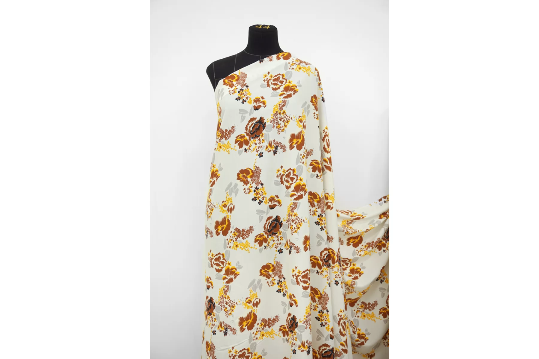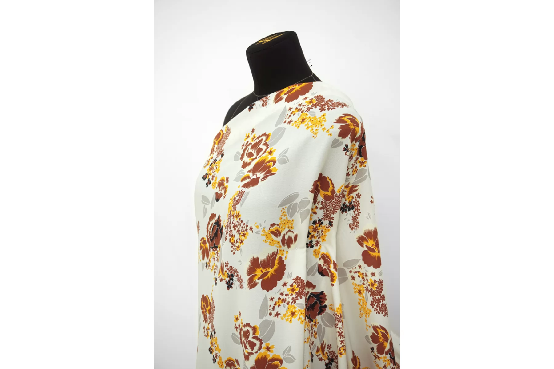 Плательная вискоза с креповой, мраморной поверхностью. Цветочный принт в коричнево-желтых тонах на светло-сером фоне. Шероховатый материал, струящийся. Подойдет для пошива платья, топа, блузки, юбки. Тонкий, пластичный, немного просвечивает темное (для юбки или платья советуем телесное белье). При работе с этой тканью советуем использовать тонкие иглы и нитки.