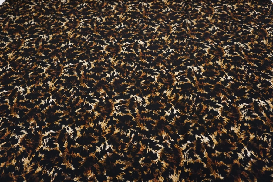 Плательная вискоза с креповой поверхностью от бренда MAX MARA с принтом напоминающим расцветку мех, сочетание чёрного, коричневого и бежевого. Шероховатый материал, струящийся. Тонкий, пластичный, немного просвечивает в один слой, но в изделии заметно не будет. Не мнется, форму не держит, красиво драпируется. Подойдет для пошива платья, топа, блузки, юбки. При работе с этой тканью советуем использовать тонкие иглы и нитки.