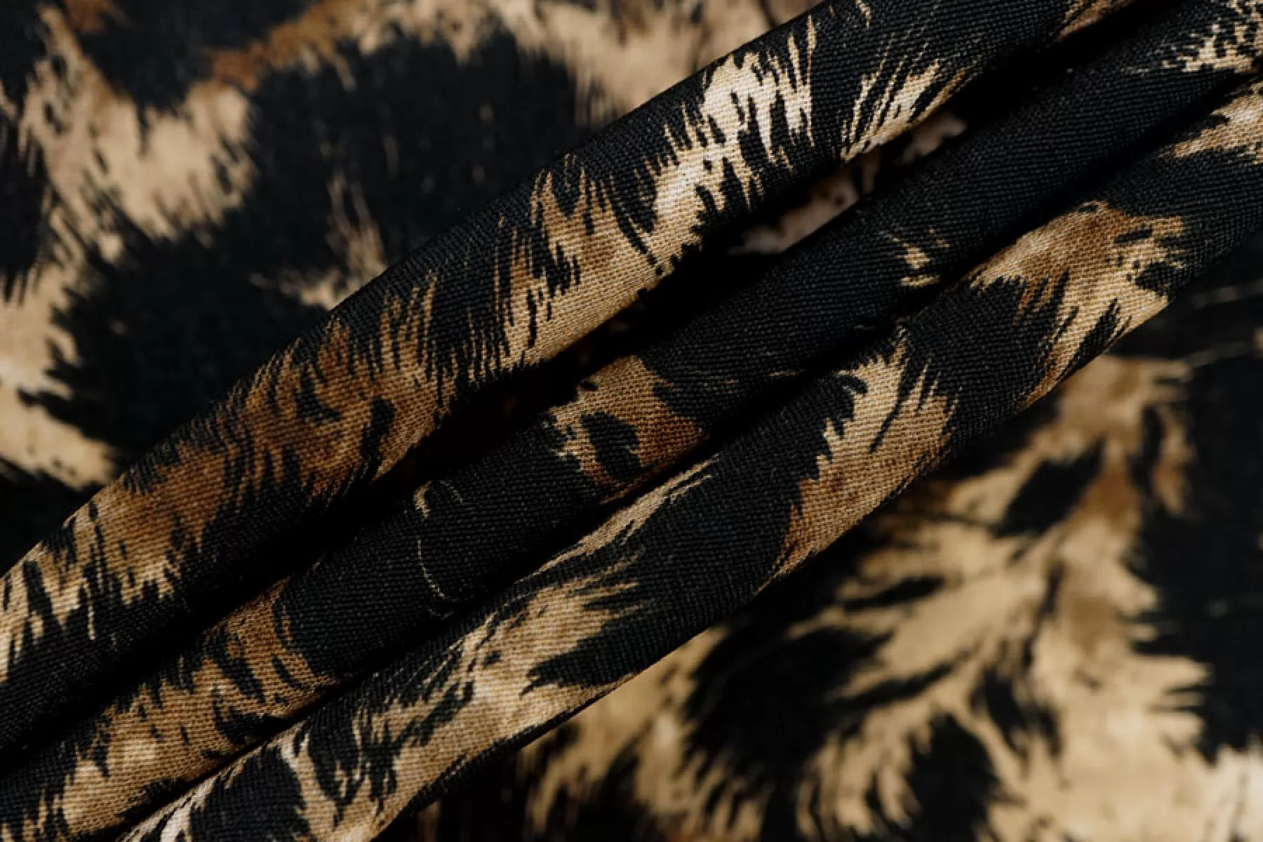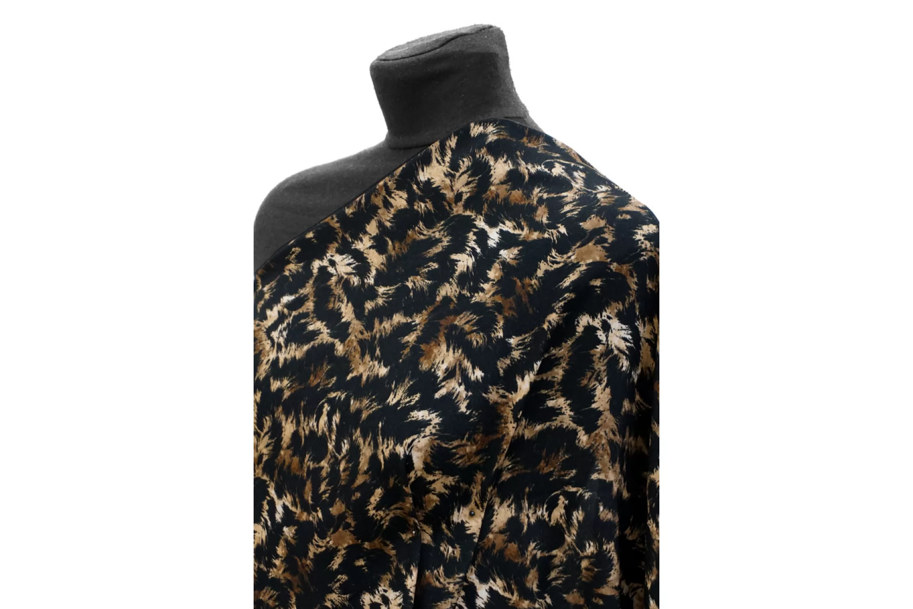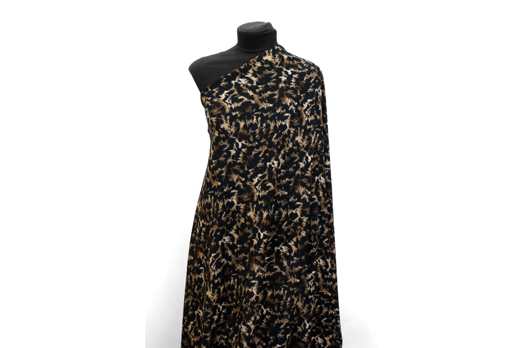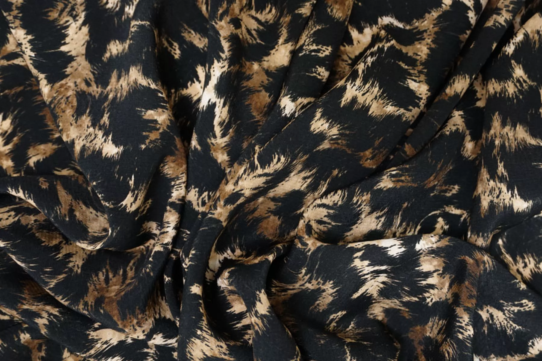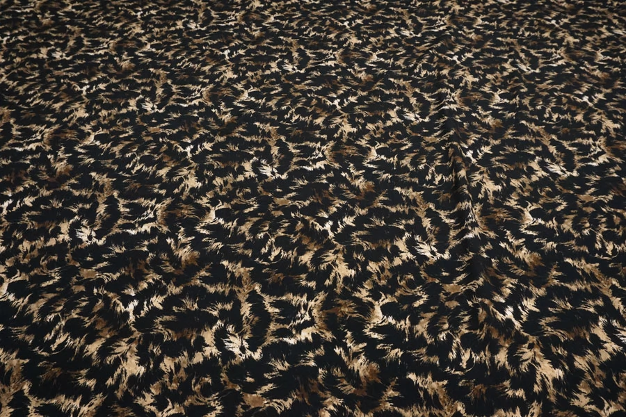Плательная вискоза с креповой поверхностью от бренда MAX MARA с принтом напоминающим расцветку мех, сочетание чёрного, коричневого и бежевого. Шероховатый материал, струящийся. Тонкий, пластичный, немного просвечивает в один слой, но в изделии заметно не будет. Не мнется, форму не держит, красиво драпируется. Подойдет для пошива платья, топа, блузки, юбки. При работе с этой тканью советуем использовать тонкие иглы и нитки.