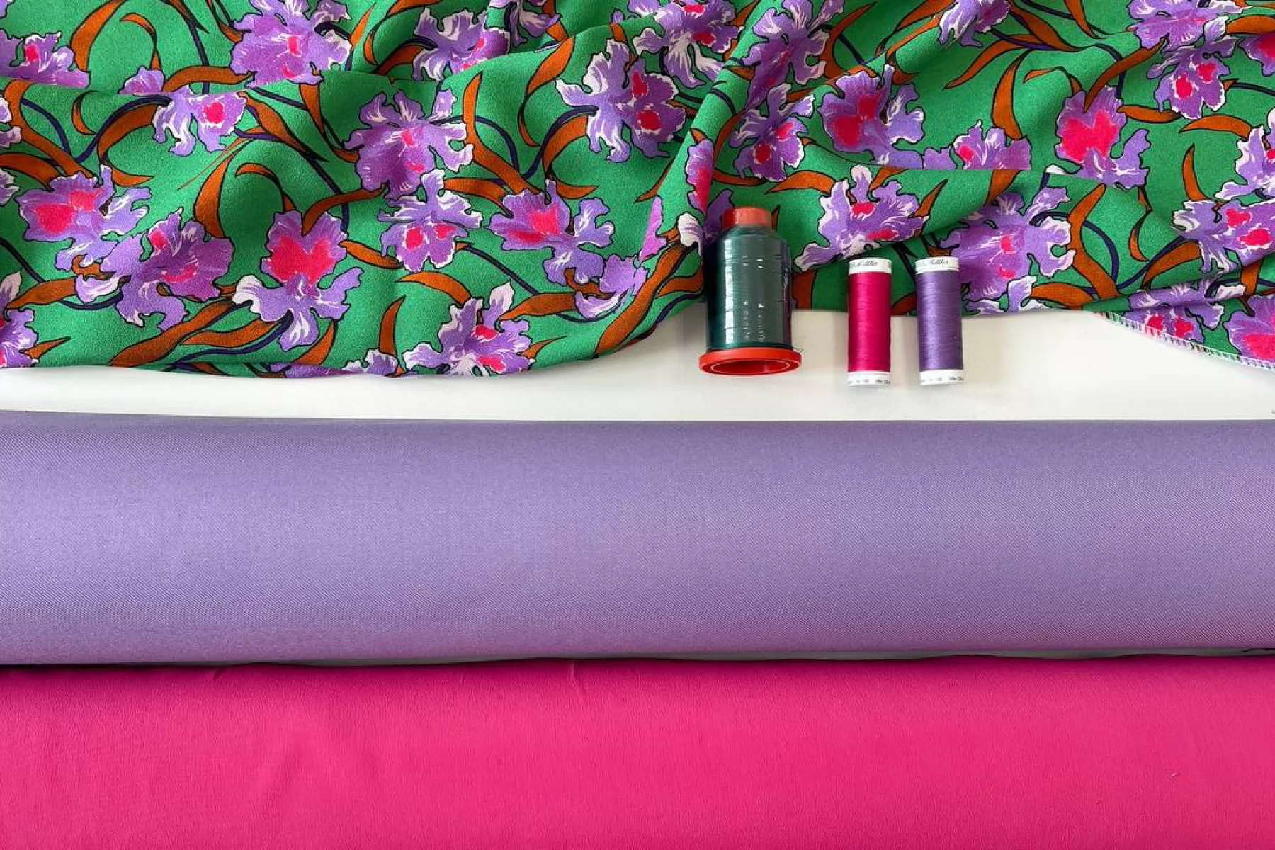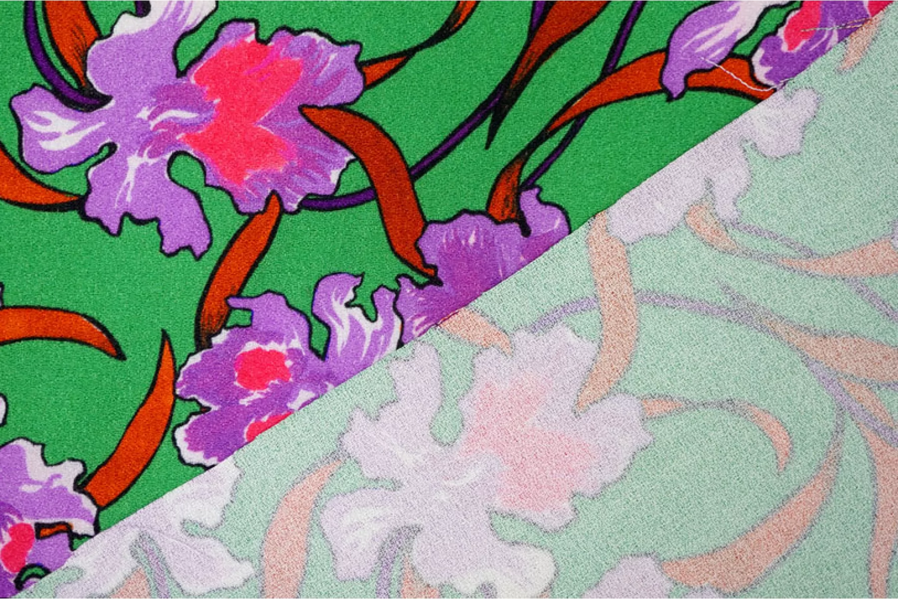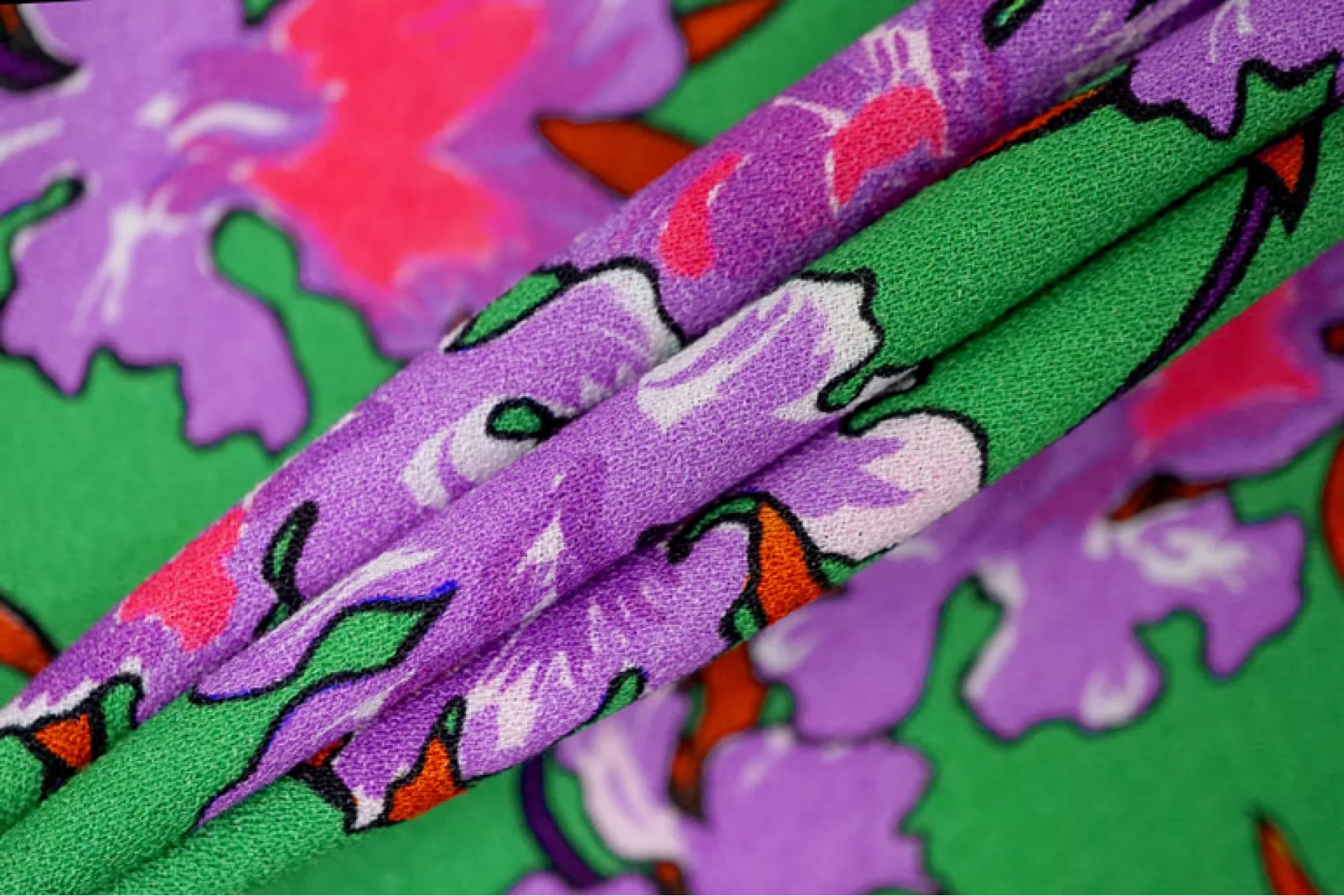 Креповая вискоза плательно-блузочной плотности в оттенке зеленого с цветочным сиреневым принтом. Тактильно шероховатая, но мягкая и пластичная. Немного мнется. Не просвечивает. Хорошо драпируется. Форму не держит. Красивый вариант на юбки, платья, блузки и не только. Обязательно учитывайте возможную усадку 5-10%