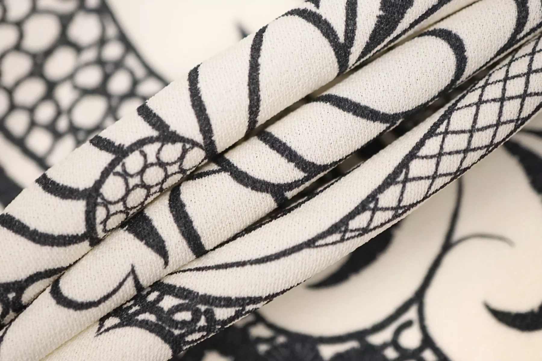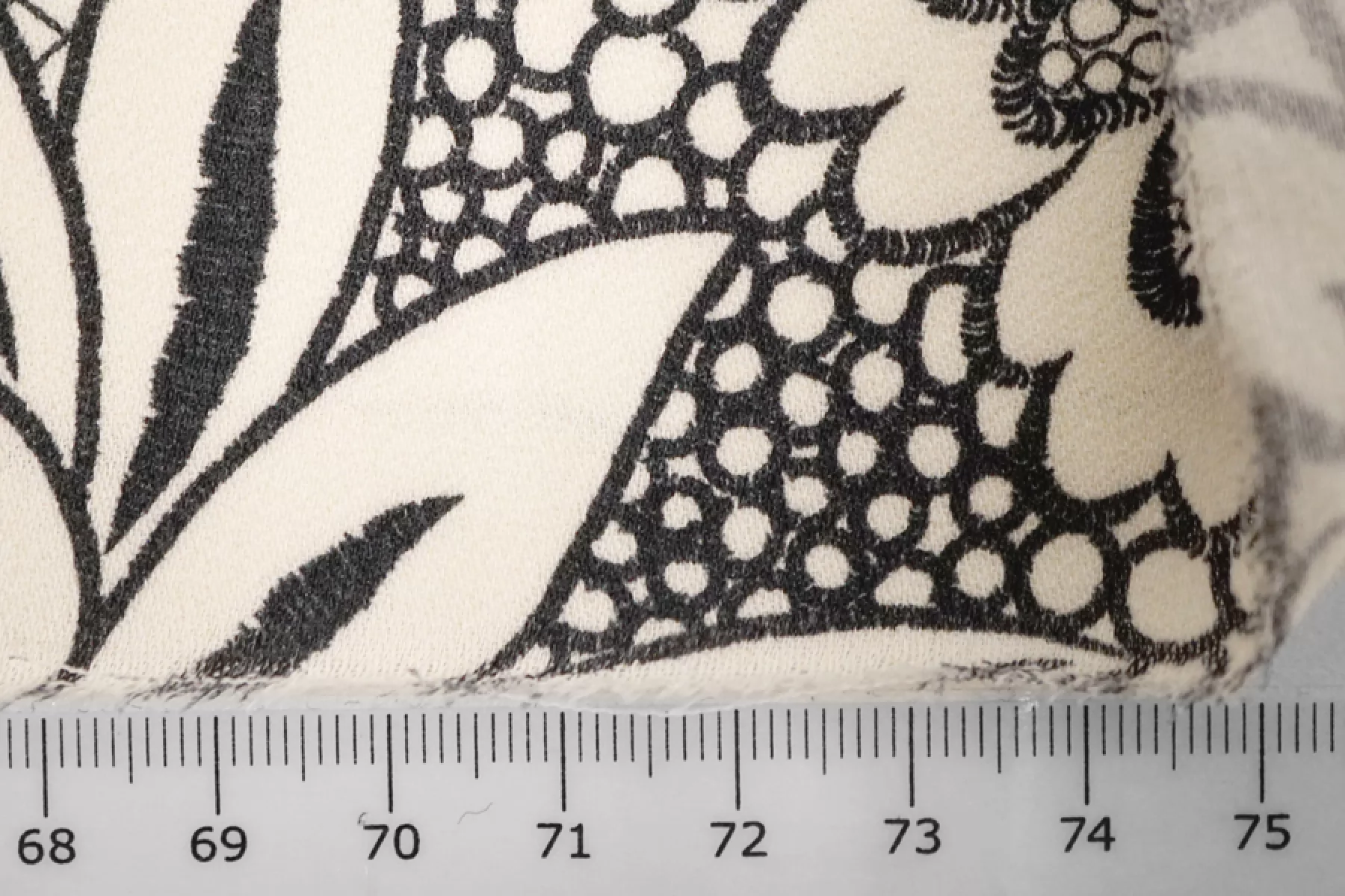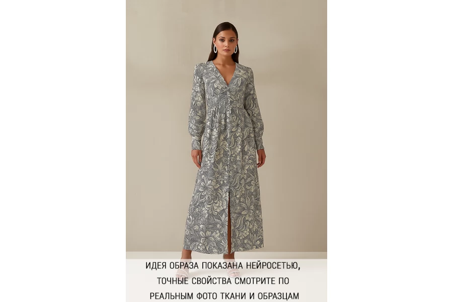 Классная вискоза с креповой, мраморной поверхностью с цветочным молочно-черным орнаментом. Шероховатый материал, струящийся. Не тянется. Форму не держит. Тонкий, но достаточно плотный, пластичный, просвечивает темное, при пошиве платья или юбки советуем телесное белье или подкладку. Подойдет для пошива платья, топа, блузки, юбки. При работе с этой тканью советуем использовать тонкие иглы и нитки.