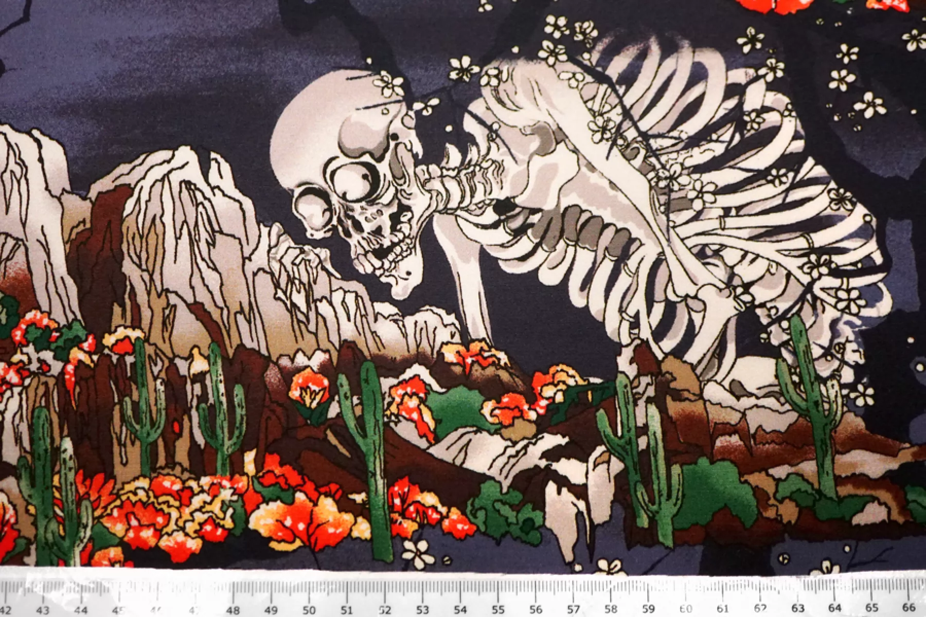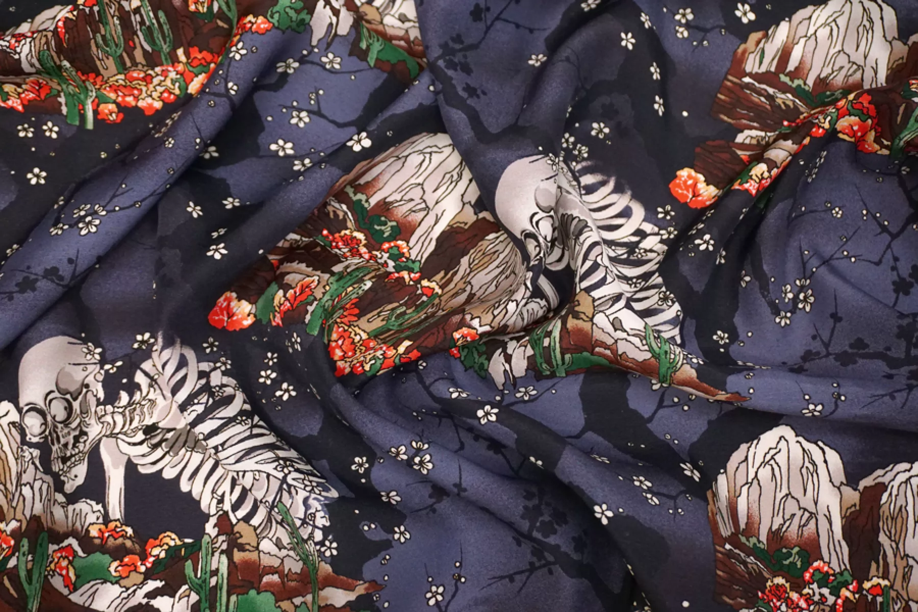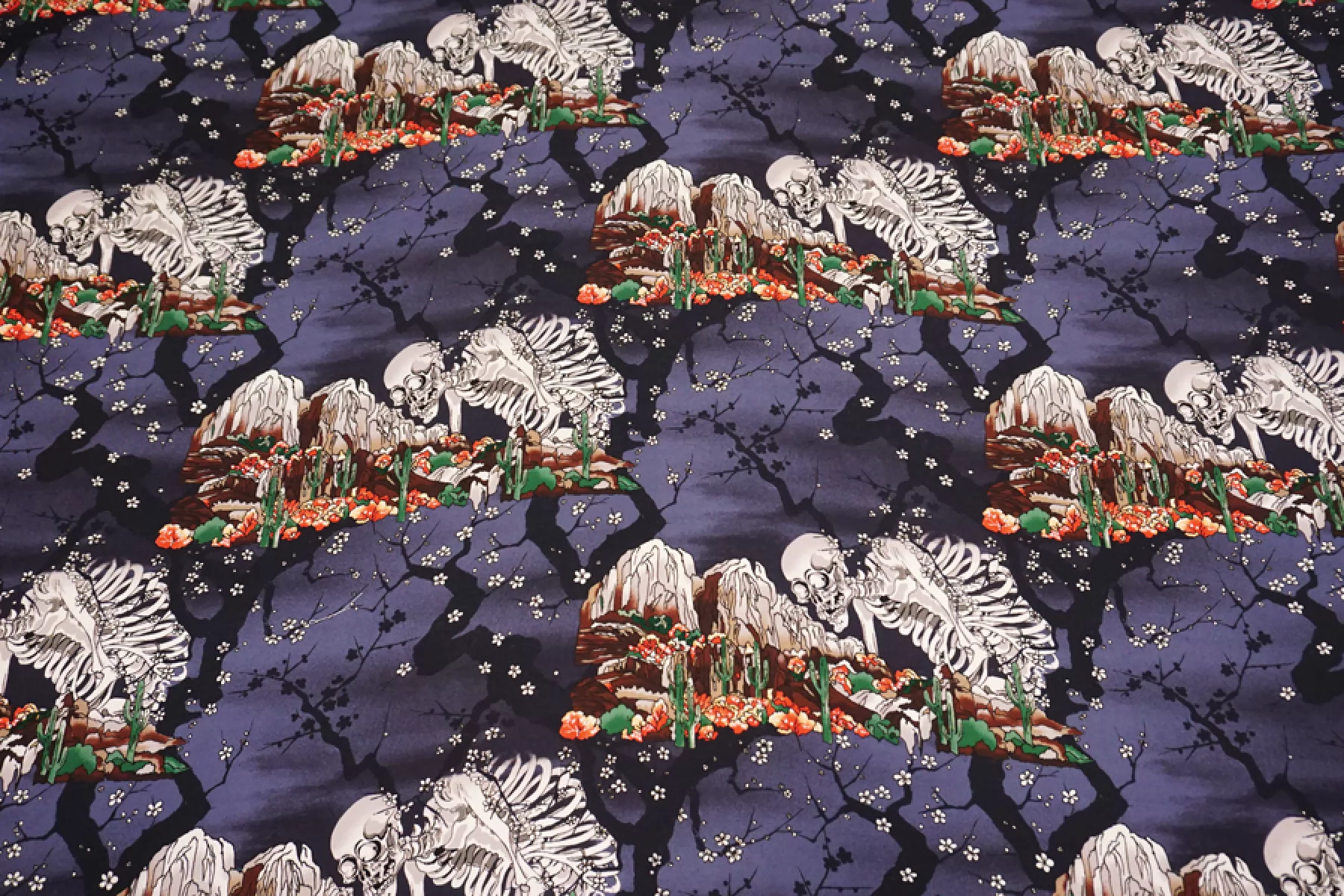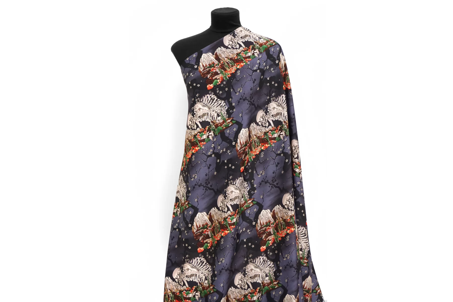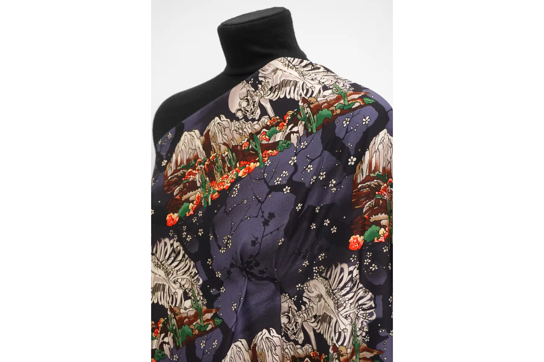 Плательная вискоза с креповой, мраморной поверхностью от бренда PALM ANGELS с принтом в виде скелета и горы с кактусами и сакурой на приглушенном темно-сиреневом фоне. Принт повторяется каждые 30 см. Гладкий, чувствуется легкая креповость, струящийся. Подойдет для пошива платья, топа, блузки, юбки. Тонкий, пластичный, немного просвечивает. При работе с этой тканью советуем использовать тонкие иглы и нитки. Учитывайте усадку материала.