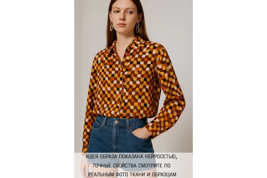 Креповая вискоза с геометрическим принтом некрупного размера в оттенках коричневого, терракотового, молочного, красно-коричневого и шалфея. Приятная, мягкая, пластичная, слегка читается контур силуэта на просвет. Не тянется, но пружинит за счет плетения. Красиво струится. Слегка мнется. Красива в складках. Отличный вариант на платья, блузки или юбки, а также одежду в пижамном стиле. Обязательно учитывайте усадку 5-10%. Уход деликатный.