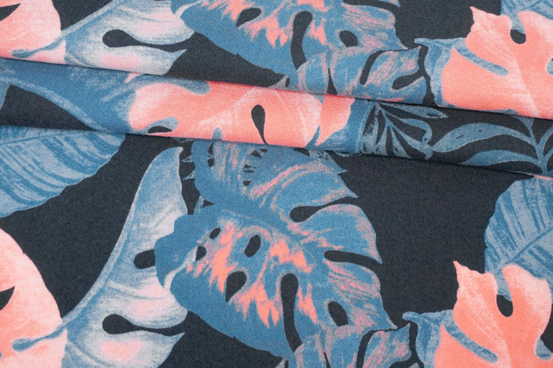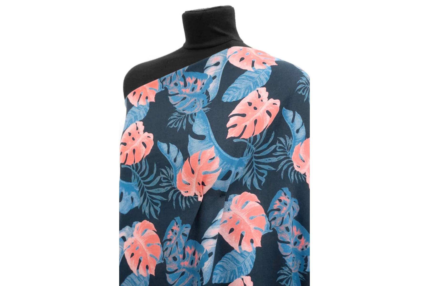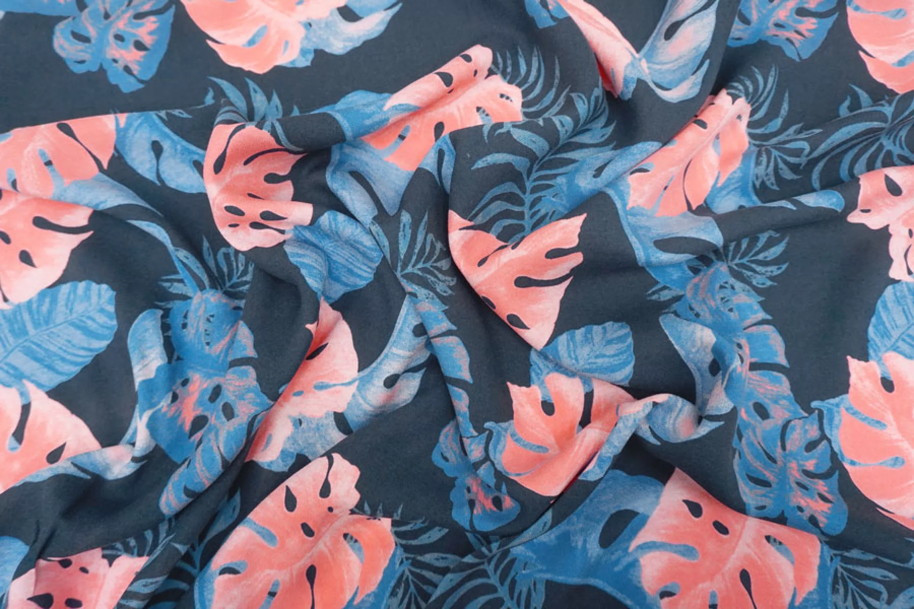 Прекрасная, пластичная, мягкая и приятная креповая плательная вискоза темно-синего оттенка с принтом в виде тропических листьев кораллового, синего оттенков и оттенка петроль. Шероховатая, что свойственно крепу. Не тянется, но слегка пружинит за счет плетения. Не просвечивает. Практически не мнется. Форму не держит, но красива в складках. Отличный вариант на платья, блузки или юбки, а также одежду в пижамном стиле. Обязательно учитывайте усадку 5-10%. Уход деликатный.