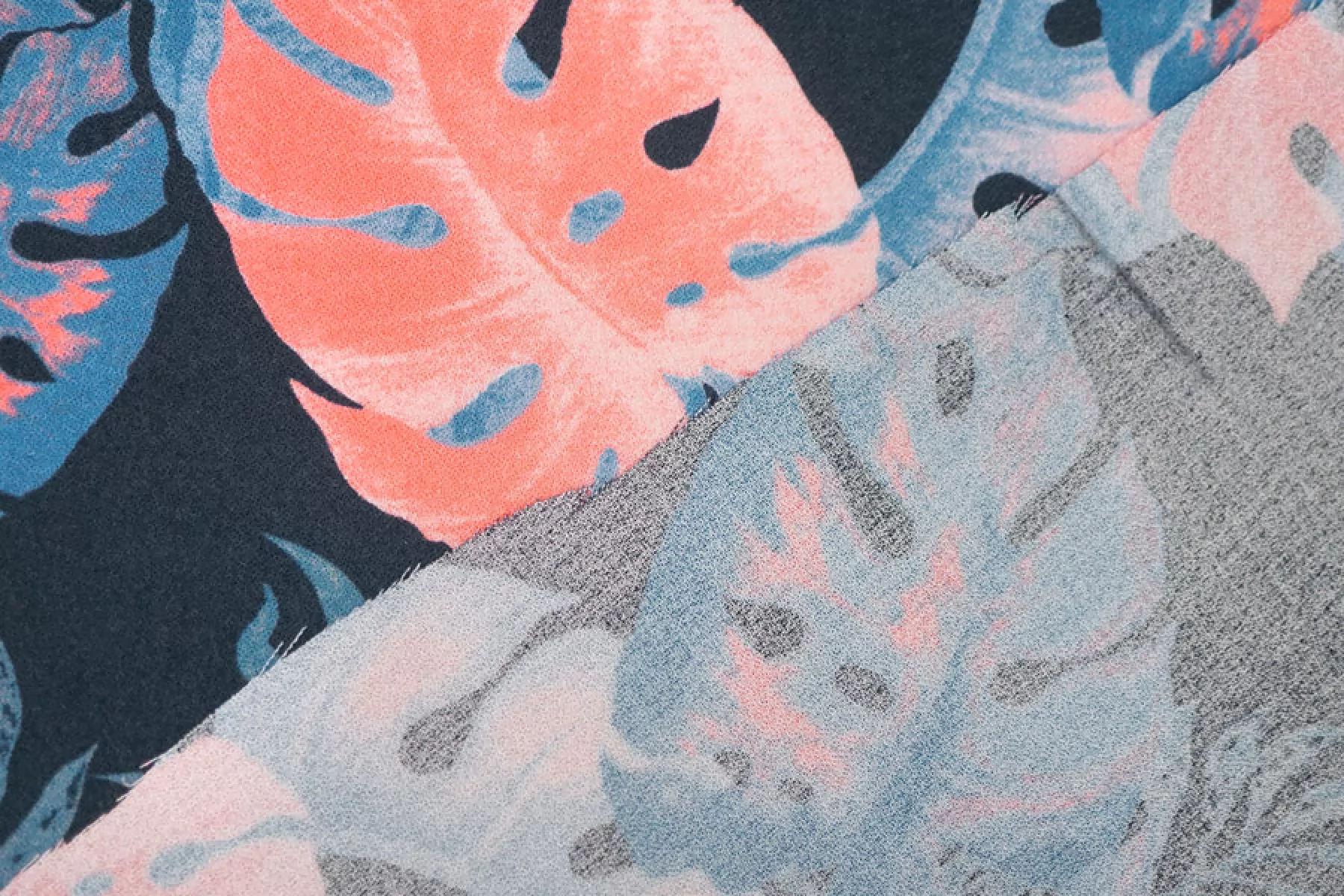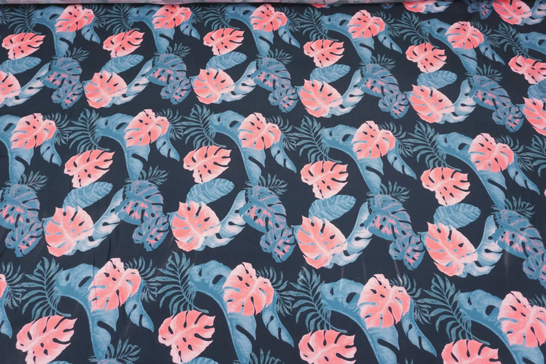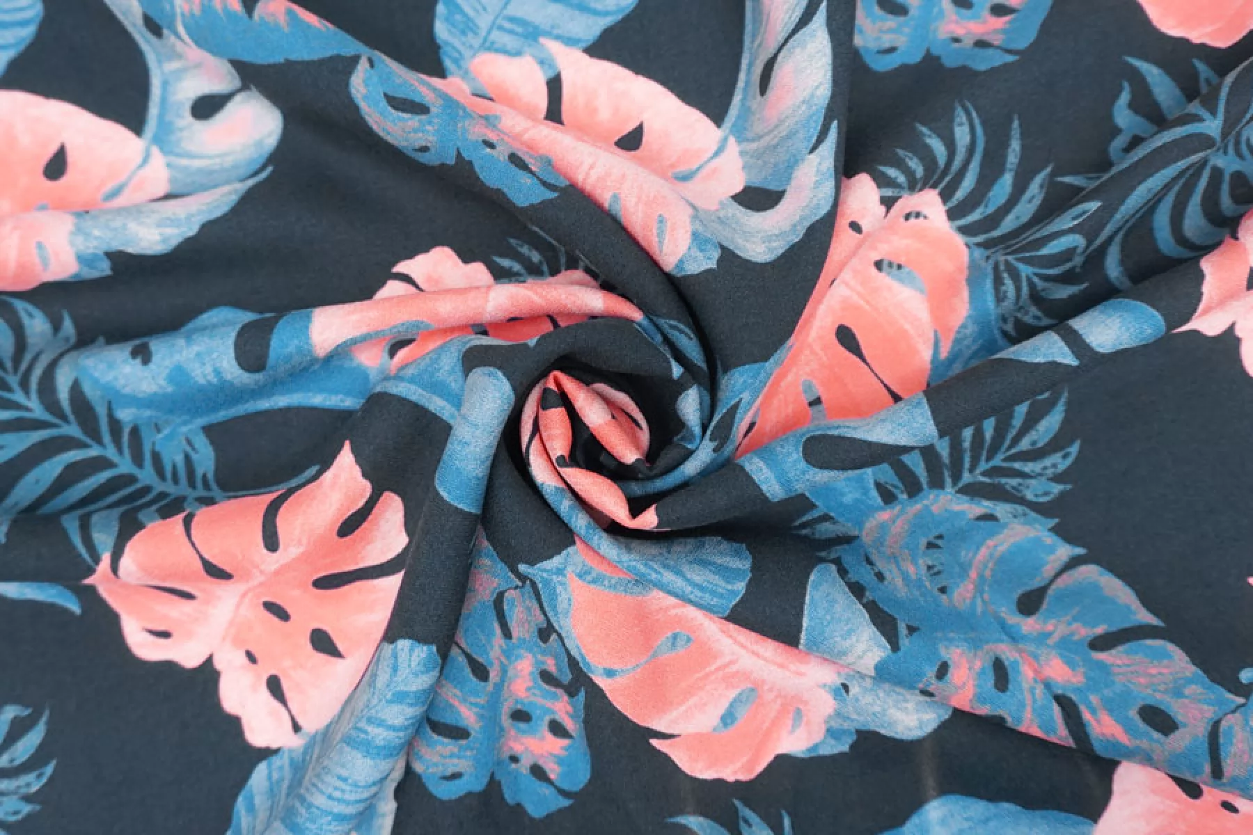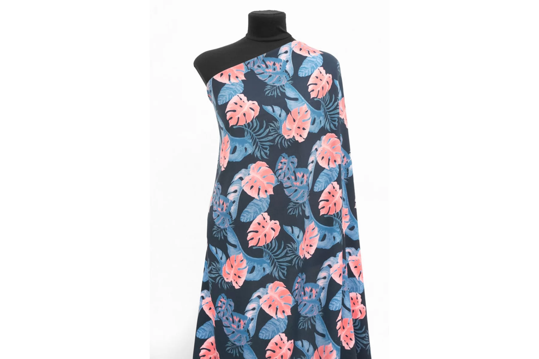 Прекрасная, пластичная, мягкая и приятная креповая плательная вискоза темно-синего оттенка с принтом в виде тропических листьев кораллового, синего оттенков и оттенка петроль. Шероховатая, что свойственно крепу. Не тянется, но слегка пружинит за счет плетения. Не просвечивает. Практически не мнется. Форму не держит, но красива в складках. Отличный вариант на платья, блузки или юбки, а также одежду в пижамном стиле. Обязательно учитывайте усадку 5-10%. Уход деликатный.