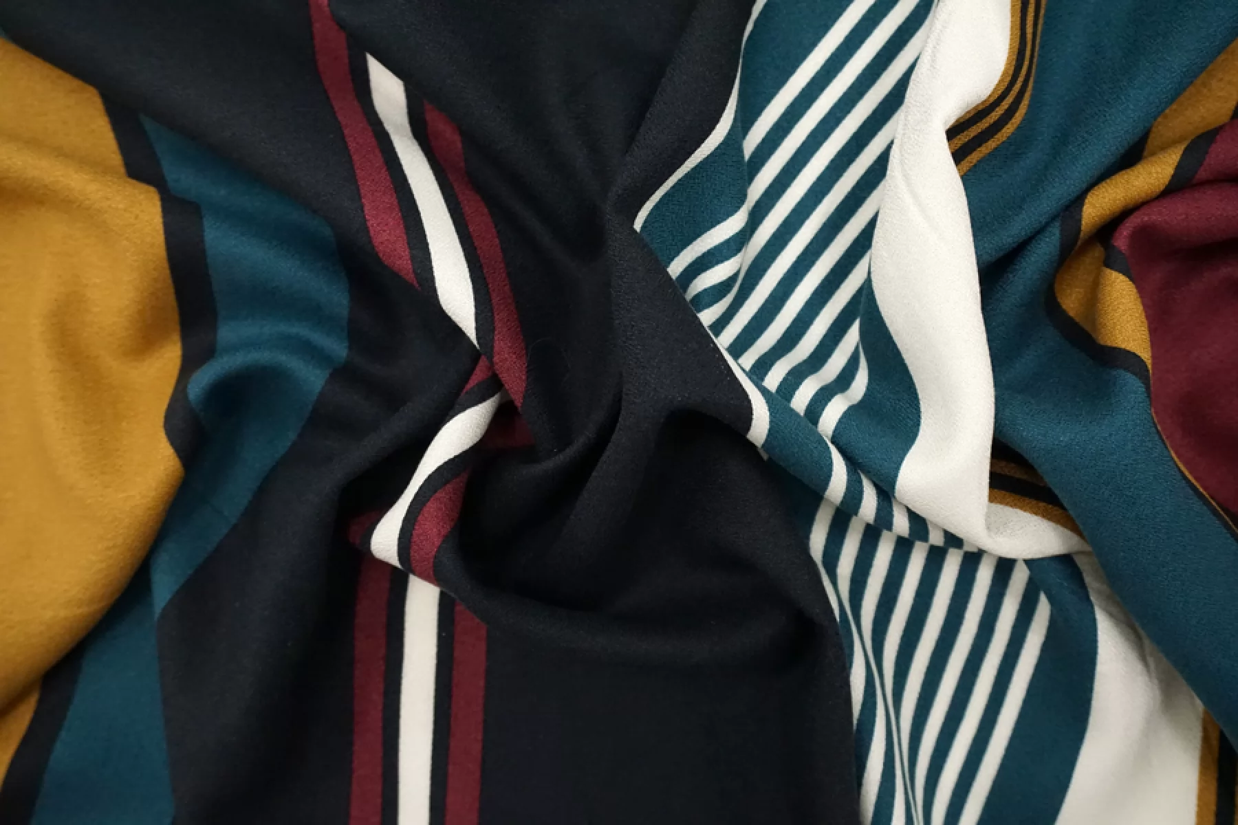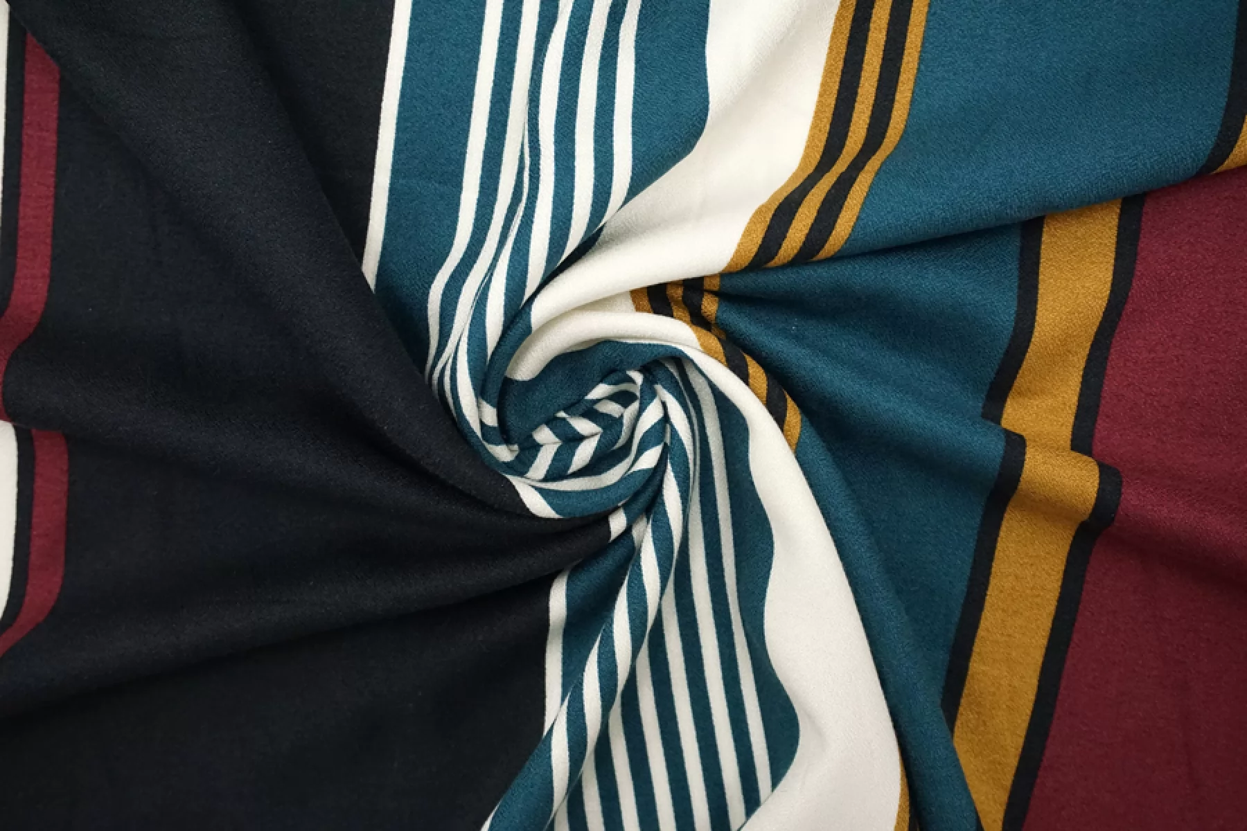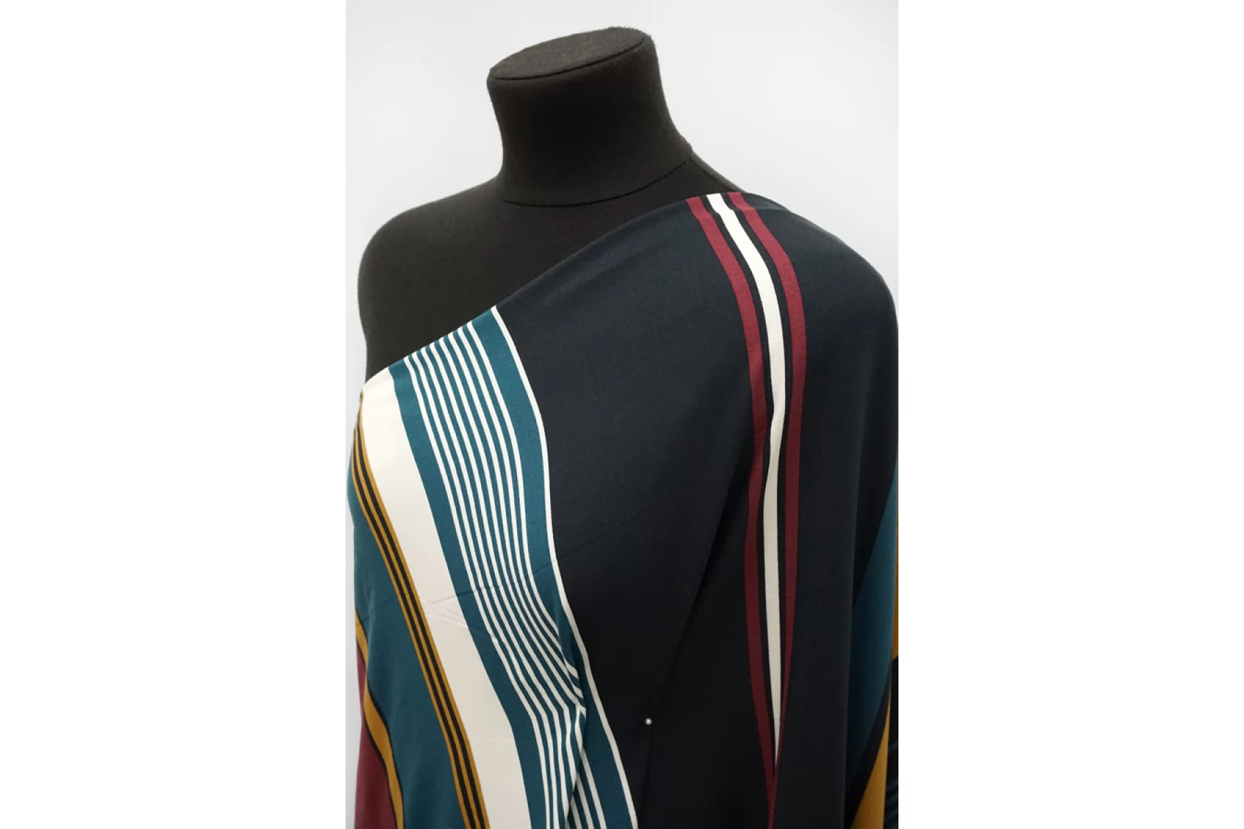 Плательная вискоза с креповой поверхностью. Полосы бирюзового, бордового, белого, горчичного и черного цветов. Шероховатый материал, струящийся. Подойдет для пошива платья, топа, блузки, юбки. Тонкий, пластичный, при пошиве платья или юбки советуем телесное белье или подкладку. При работе с этой тканью советуем использовать тонкие иглы и нитки.