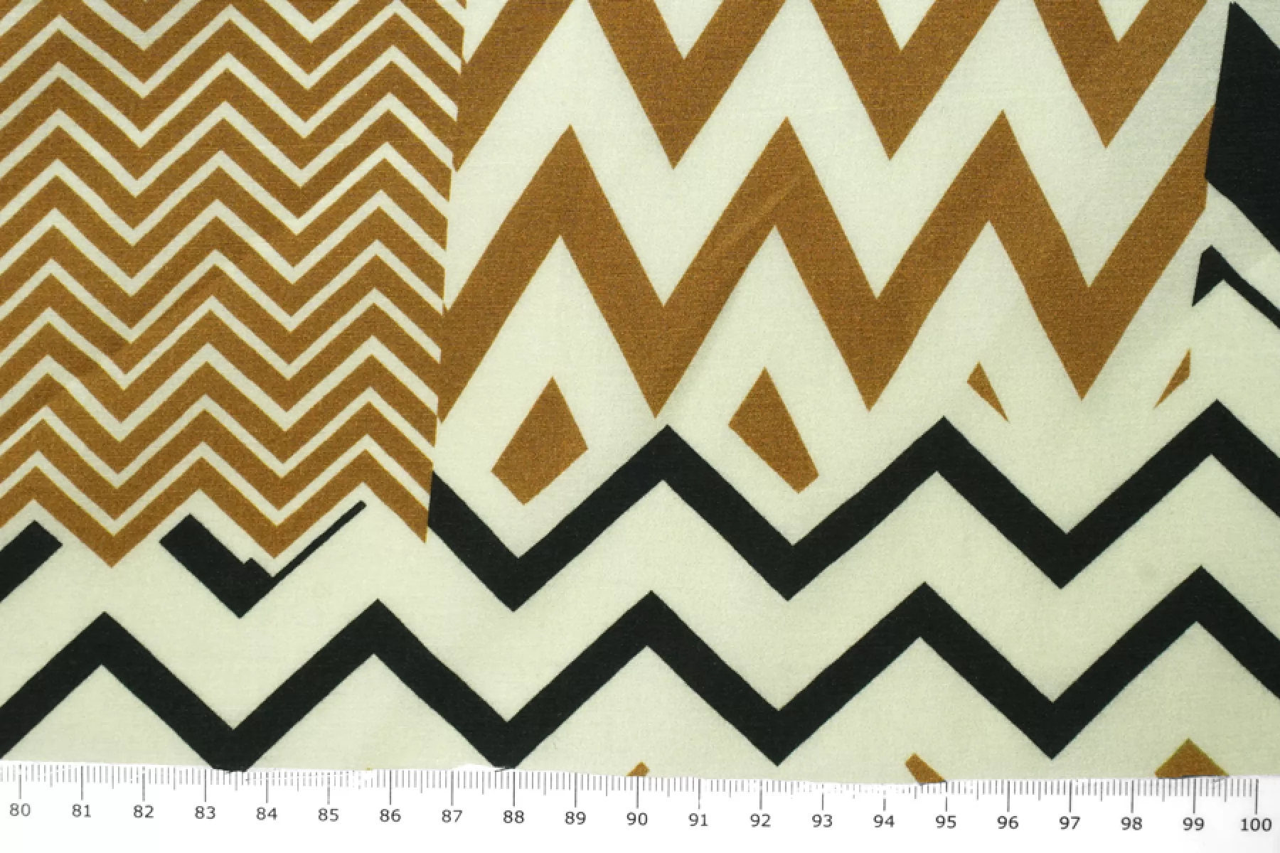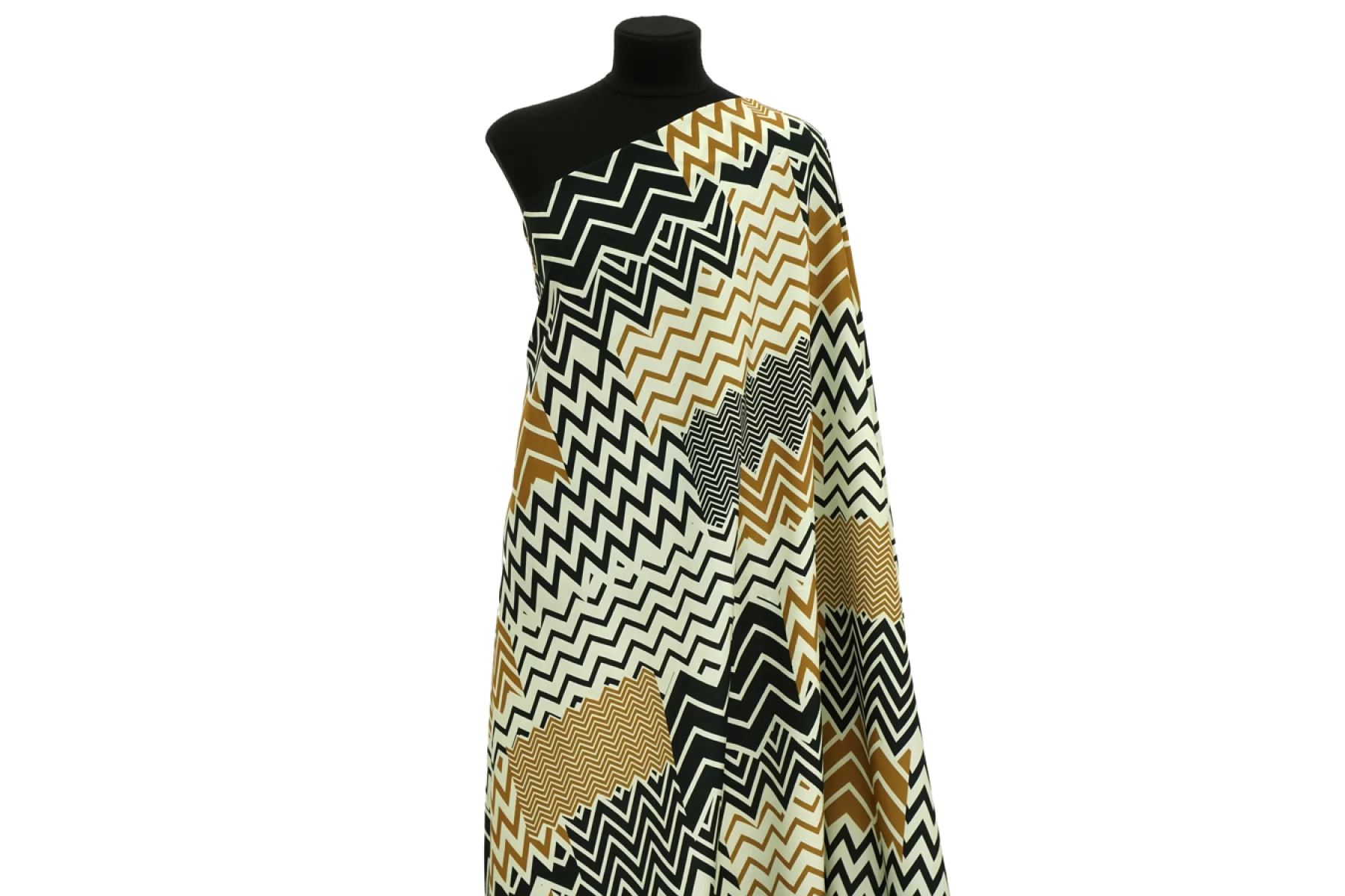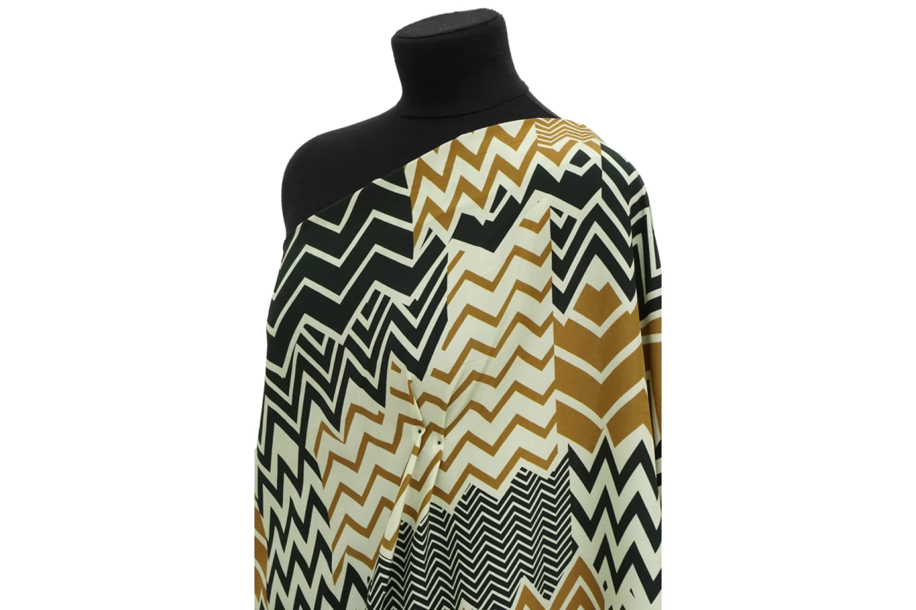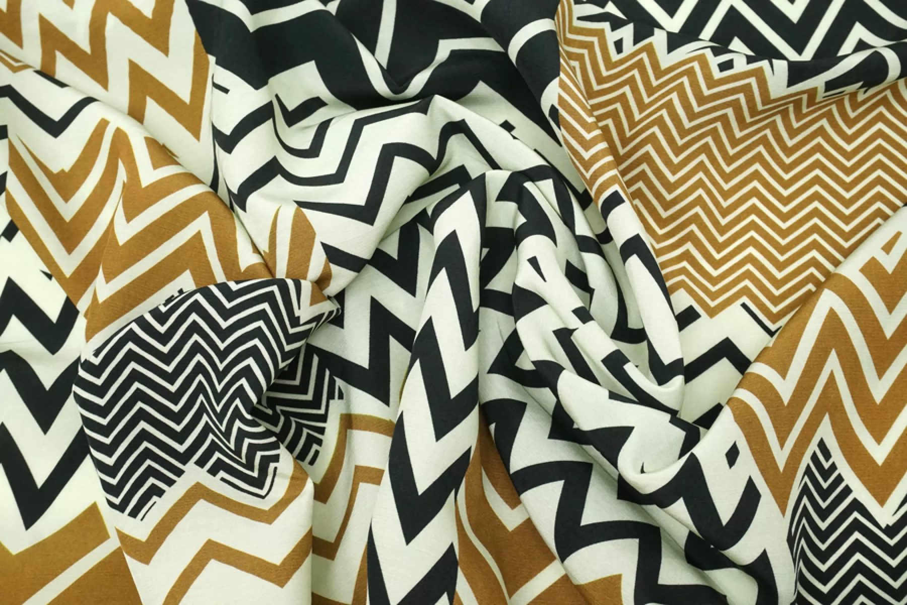 Интересная креповая вискоза фисташкового оттенка с зигзагами в коричневых и черных оттенках. Материал тактильно совсем слегка шероховатый, как любой креп, но при этом скользящий, гладкий. Слегка просвечивает силуэт. Мнется, но практически полностью восстанавливается. Красив в своей пластике. Форму практически не держит. Вариант на платья, блузки или юбки. Обязательно учитывайте усадку 5-10%. При необходимости используйте подкладочный материал.