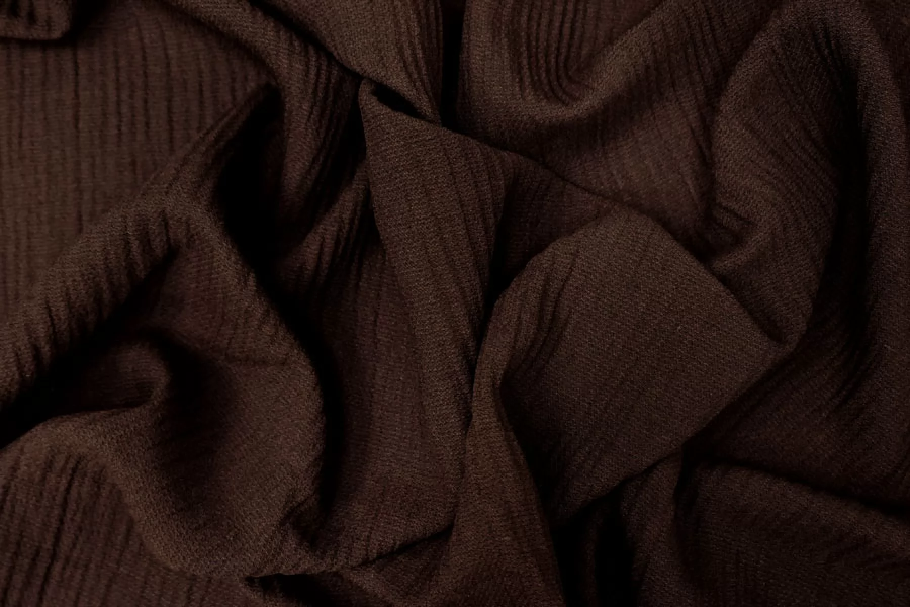 Интересная позиций - крешированная креповая шерсть с вискозой в коричневом цвете. Тактильно шероховатая, фактурная Обладает красивым блеском. Просвечивает. Пластичный, форму держит. Немного тянется. Не мнется. Шьем платья, блузки или юбки. Обязательно учитывайте усадку 5-10%.