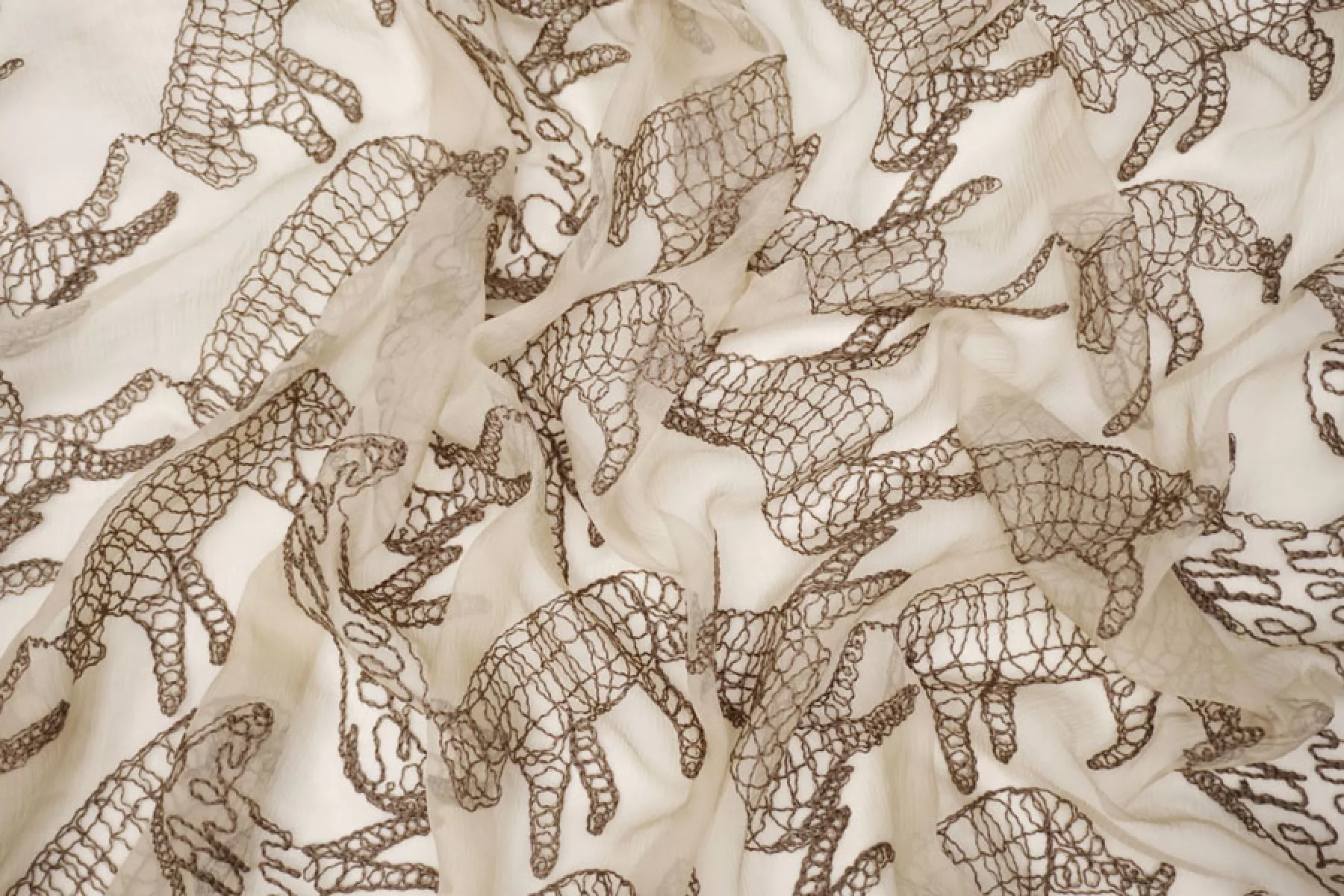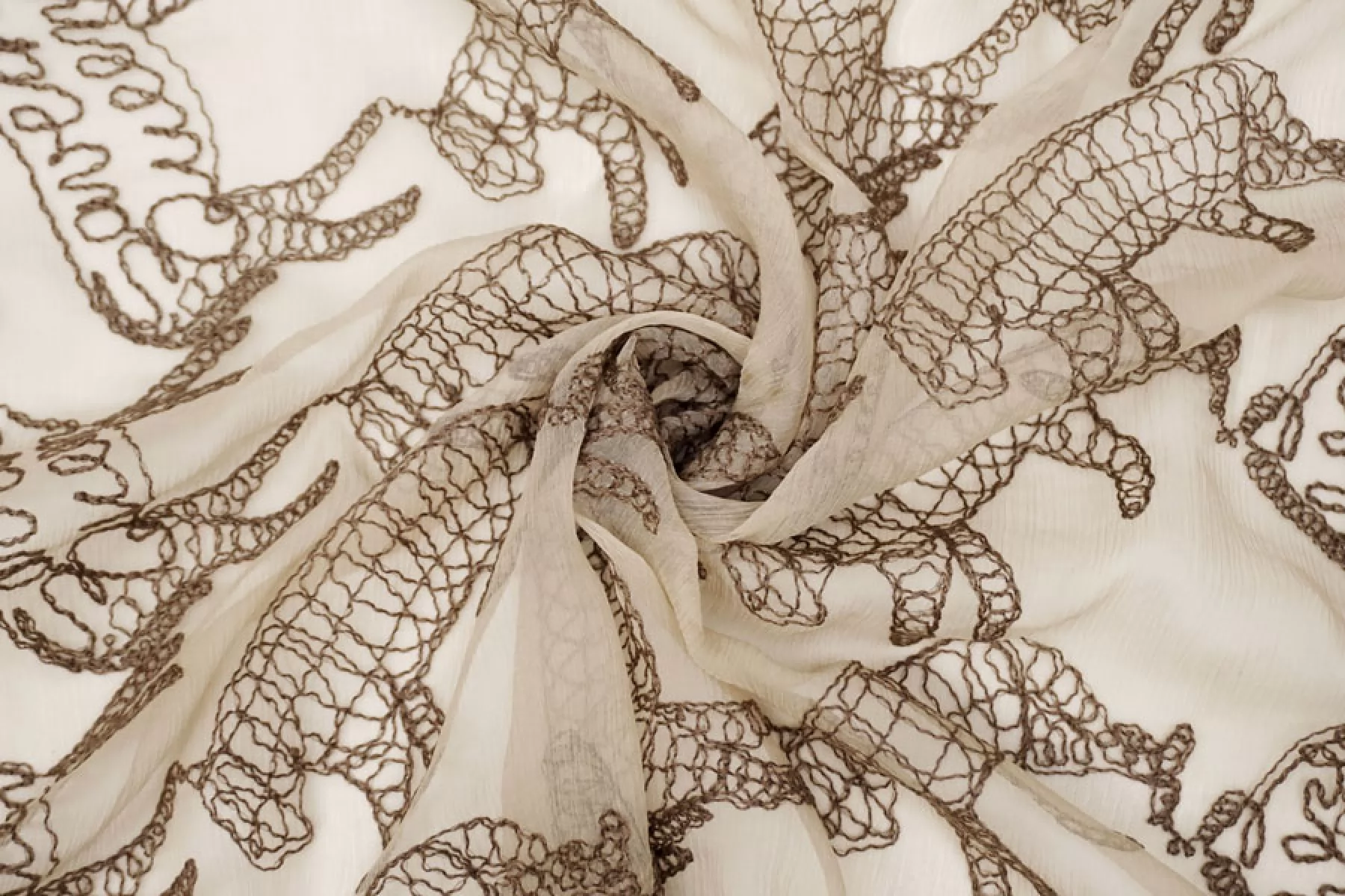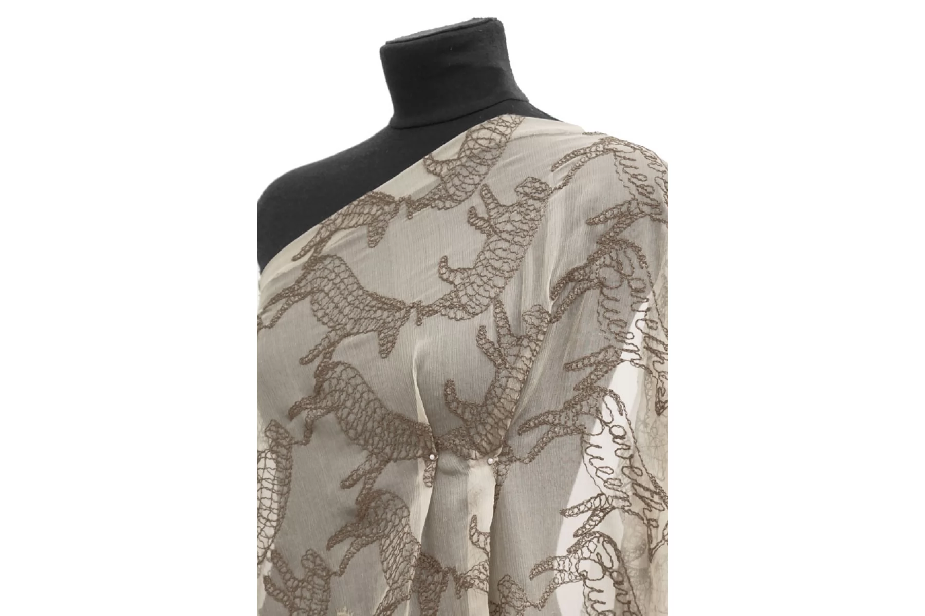 Очень интересный крешированный шелковый шифон бежевого цвета с вышивкой в виде лошадей и тигров коричневыми хлопковыми нитями. Струящийся, летящий, воздушный, шероховатый, отлично тянется за счет жатой фактуры. Прозрачный. Подойдет на платье, блузку, юбку. Уход, как и за любым шелком, деликатный.