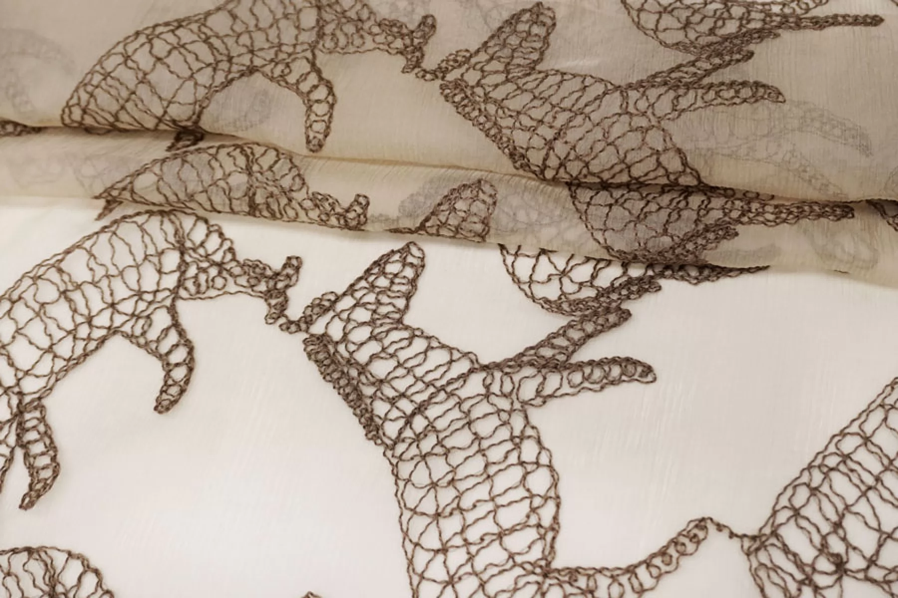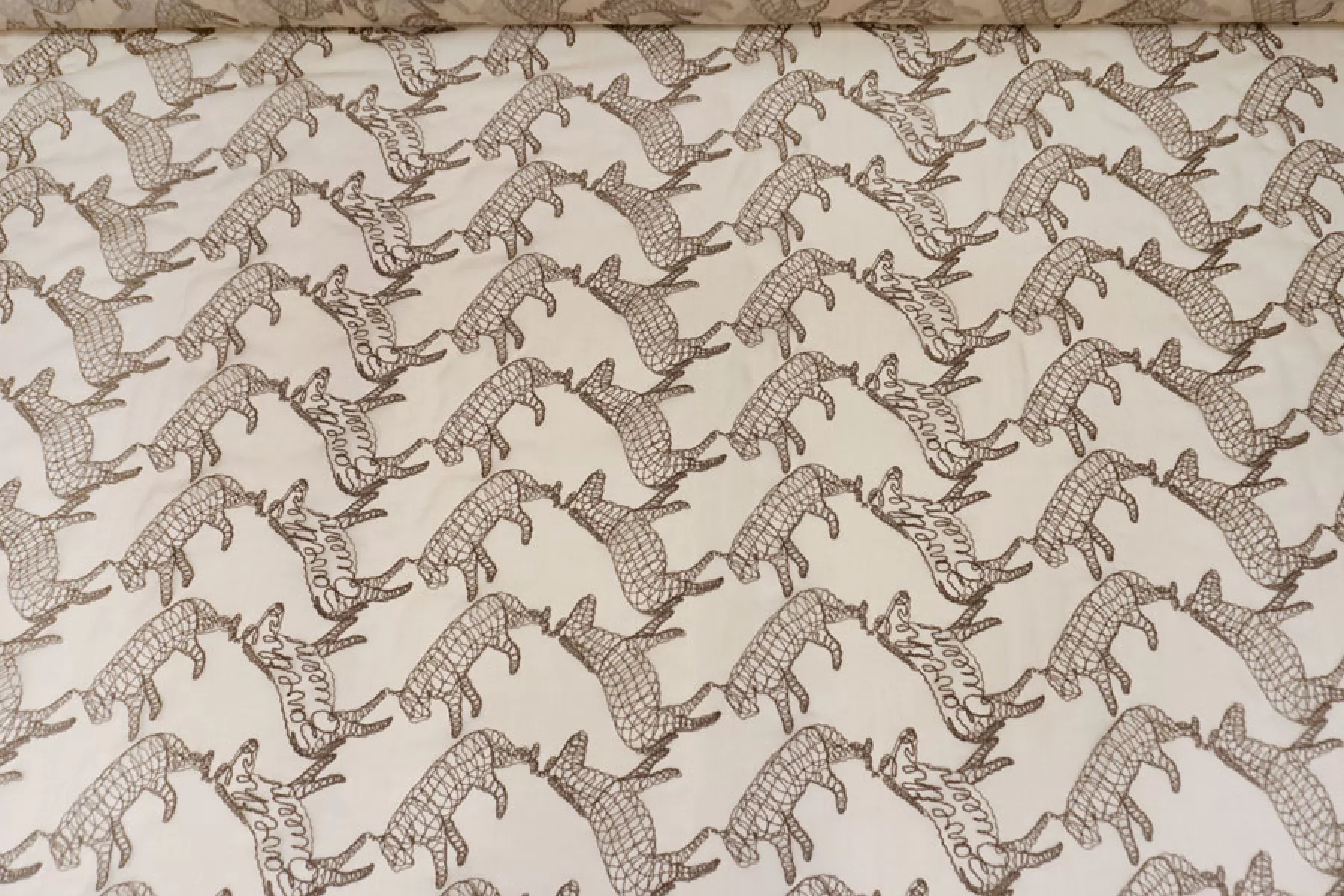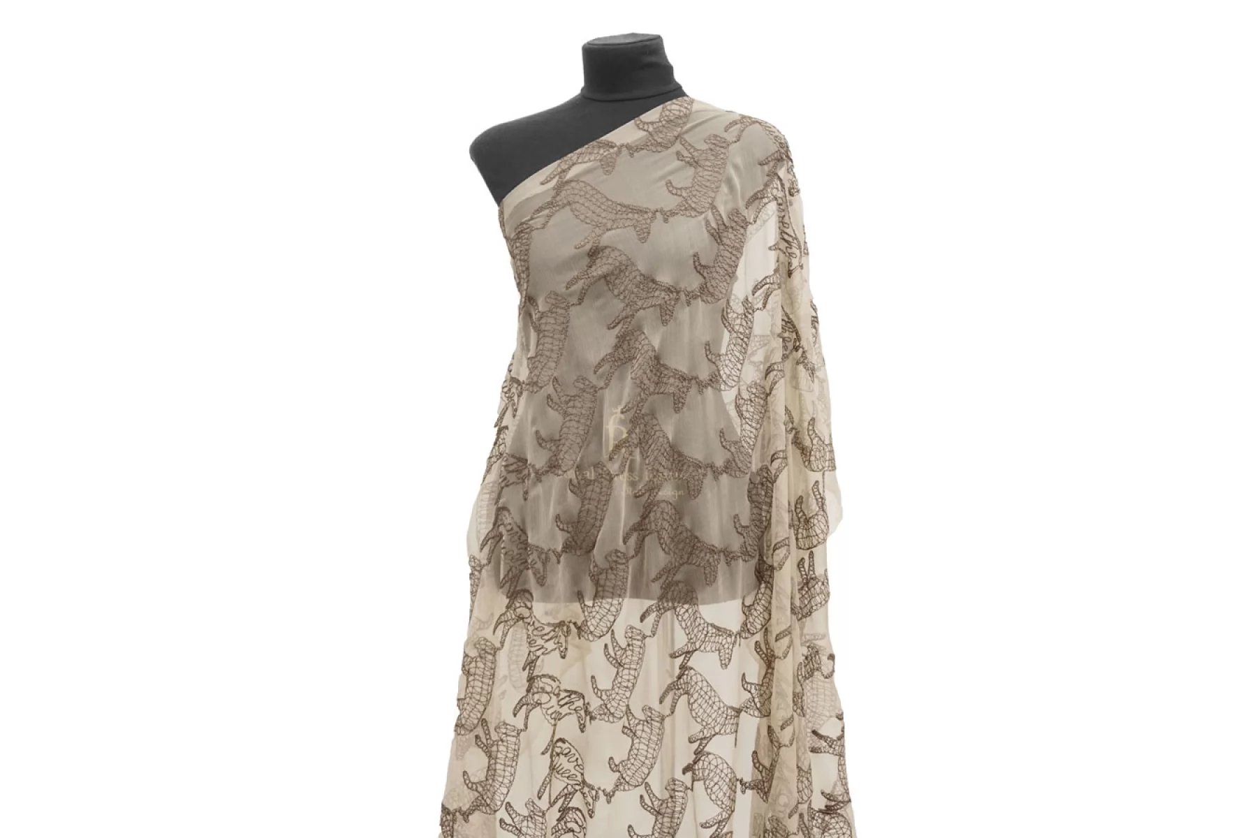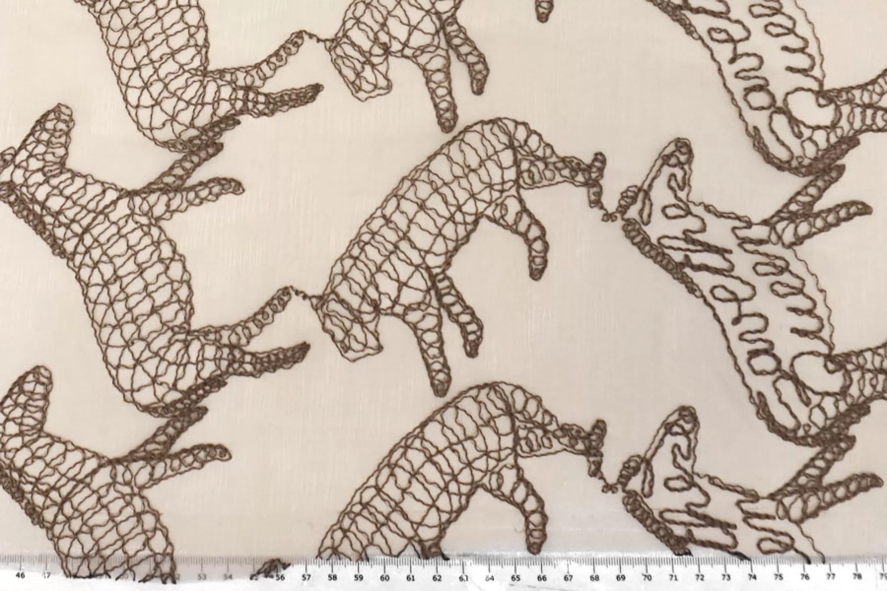 Очень интересный крешированный шелковый шифон бежевого цвета с вышивкой в виде лошадей и тигров коричневыми хлопковыми нитями. Струящийся, летящий, воздушный, шероховатый, отлично тянется за счет жатой фактуры. Прозрачный. Подойдет на платье, блузку, юбку. Уход, как и за любым шелком, деликатный.