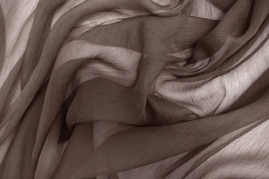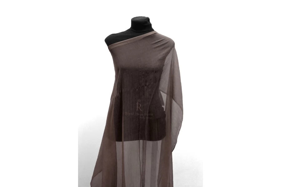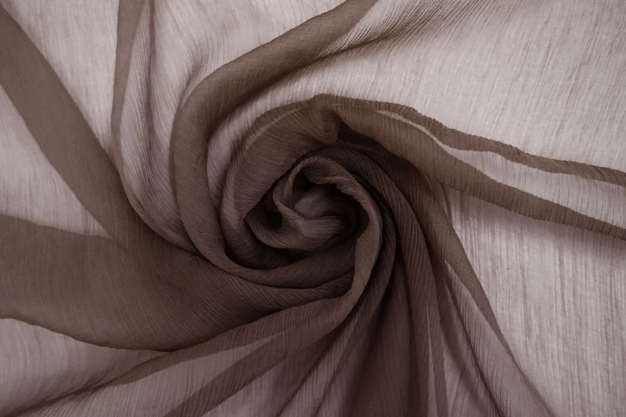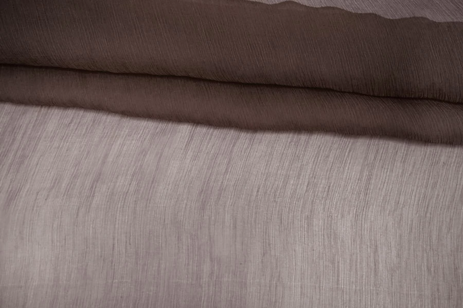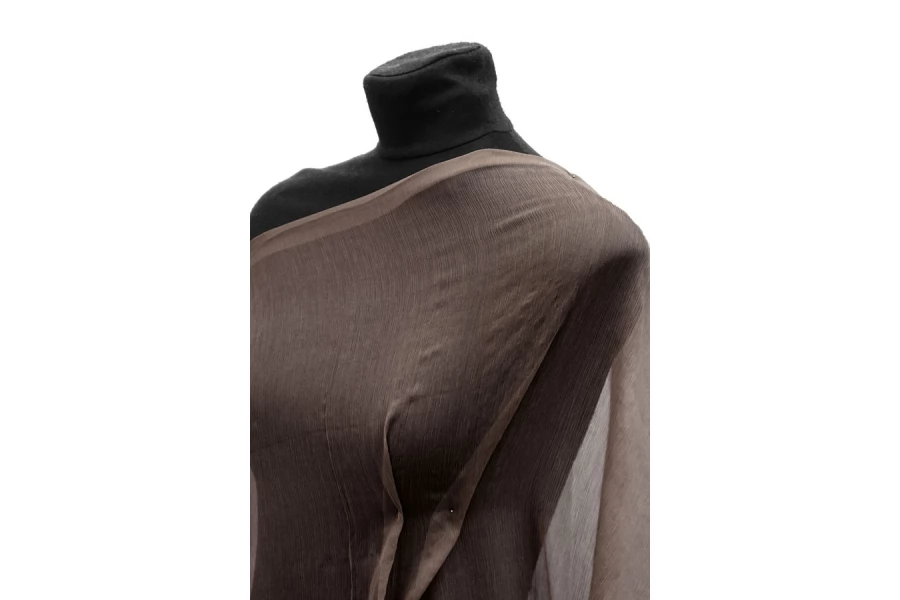 Шелковый крешированный шифон в красивом, дымчато-коричневом оттенке. Струящийся, летящий, воздушный, шероховатый, тянется за счет жатой фактуры. Прозрачный. Подойдет на платье, блузку, юбку. Уход, как и за любым шелком, деликатный.