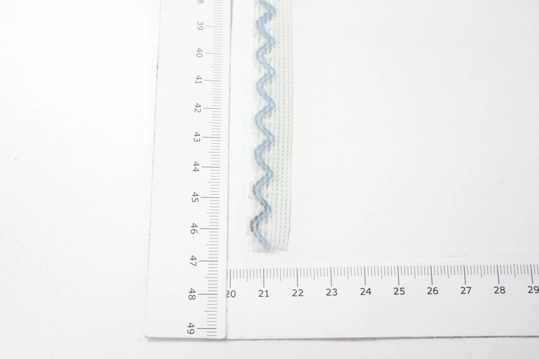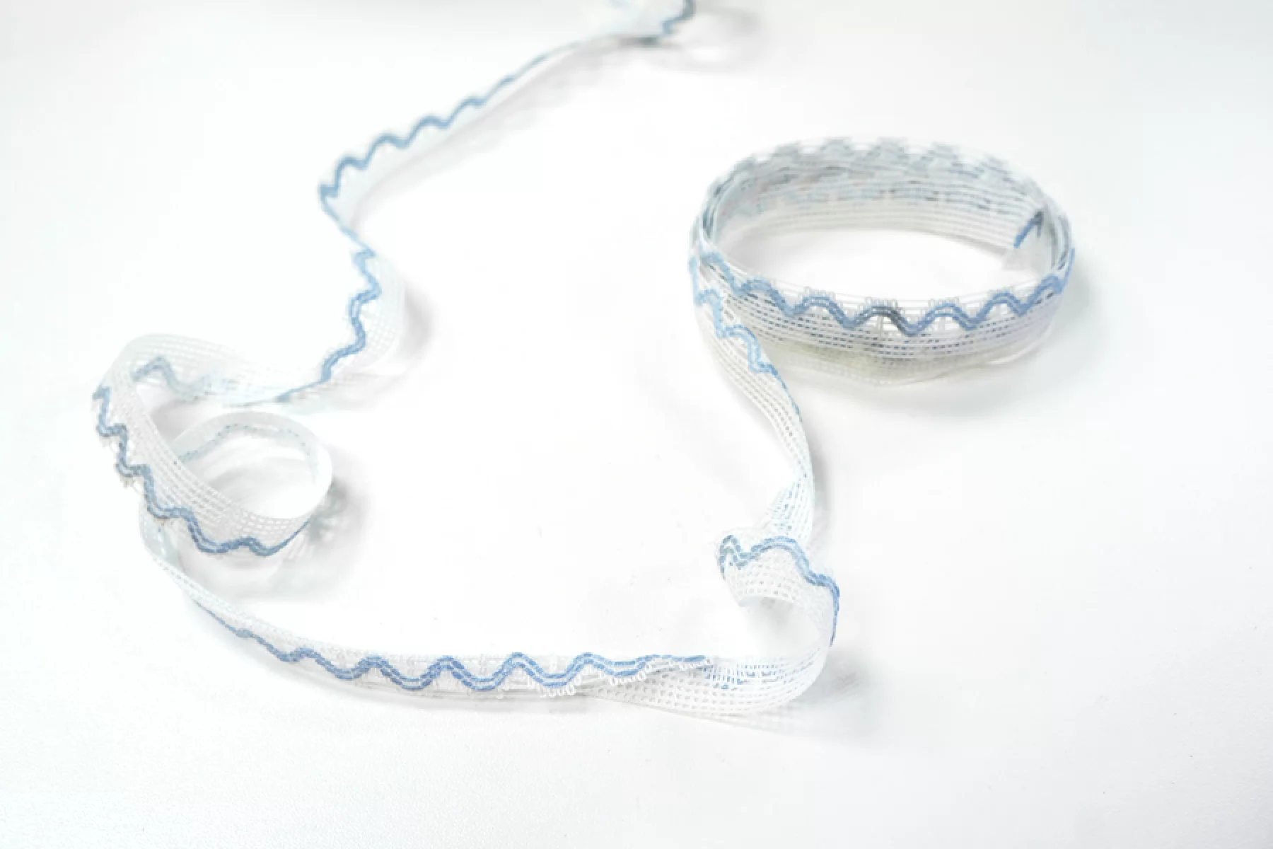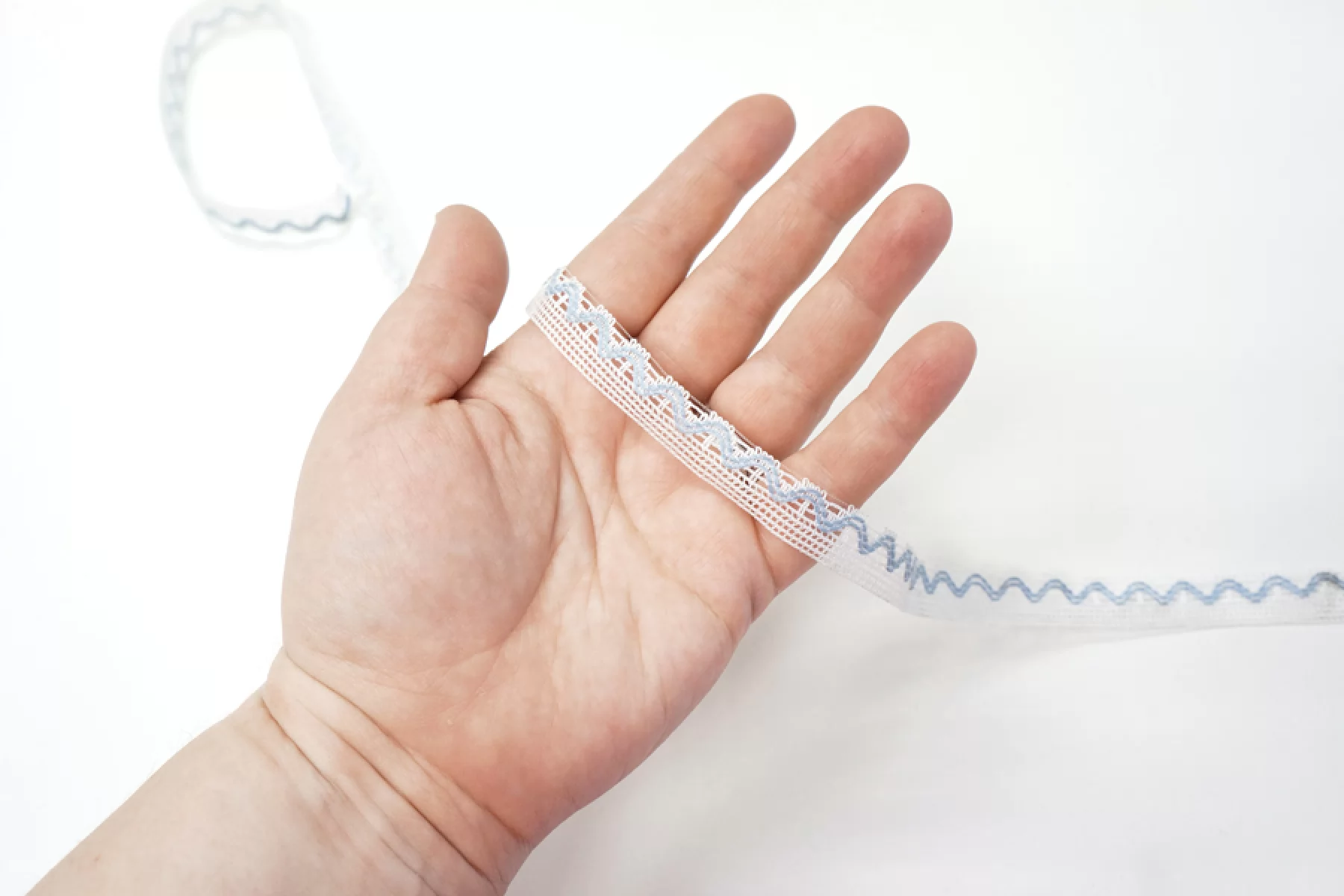 Итальянское кружево белого цвета с голубой хлопковой нитью. Жестковатое, пластичное. Отлично подойдет для пошива нижнего белья, отделки одежды и аксессуаров.