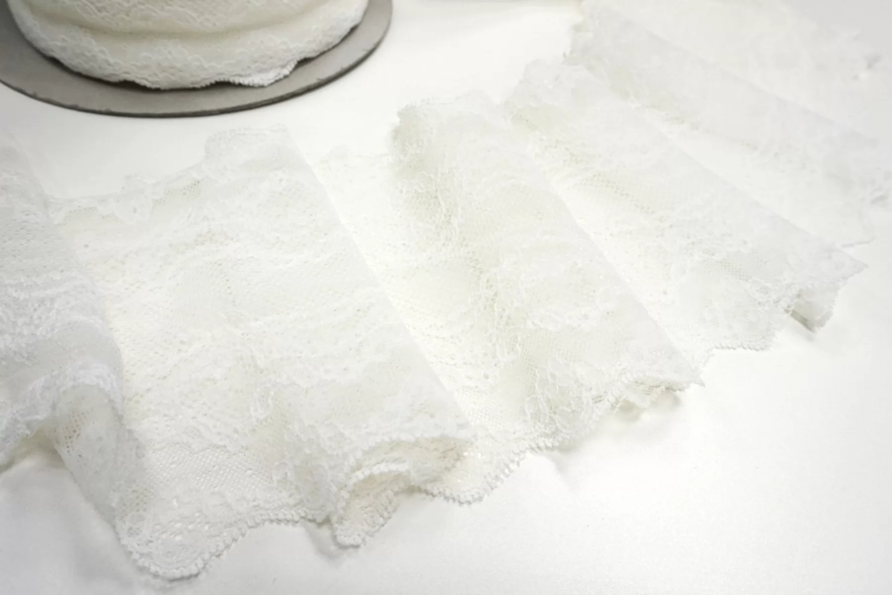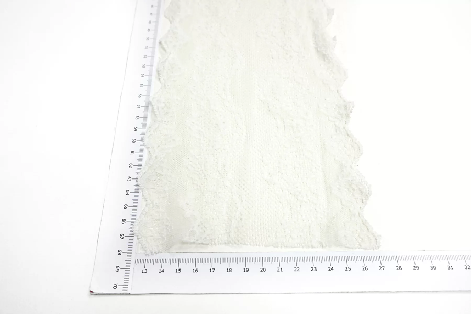 Итальянское кружево белого цвета с молочным оттенком из хлопка. Слегка жесткое, пластичное. Отлично подойдет для пошива нижнего белья, отделки одежды и аксессуаров.