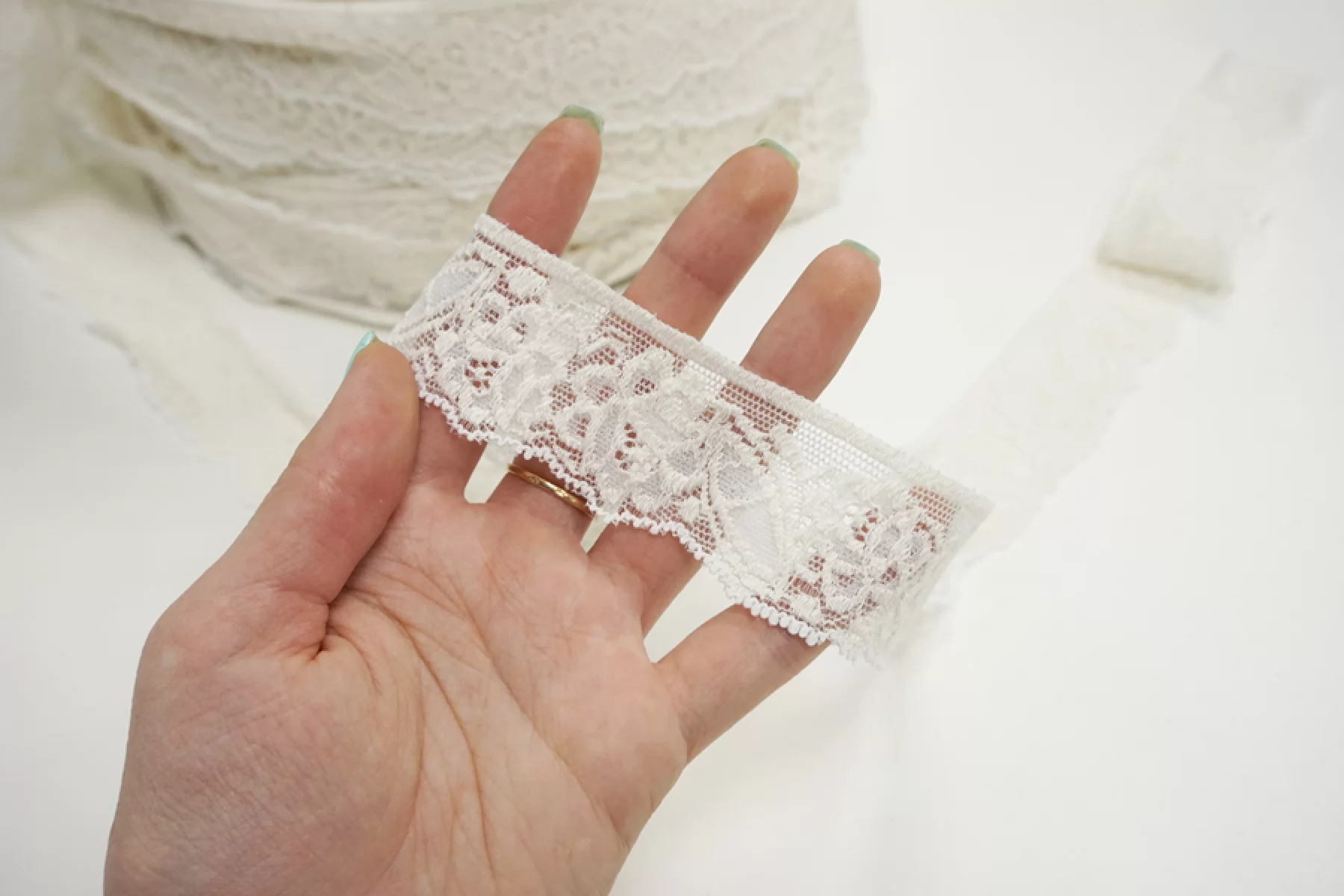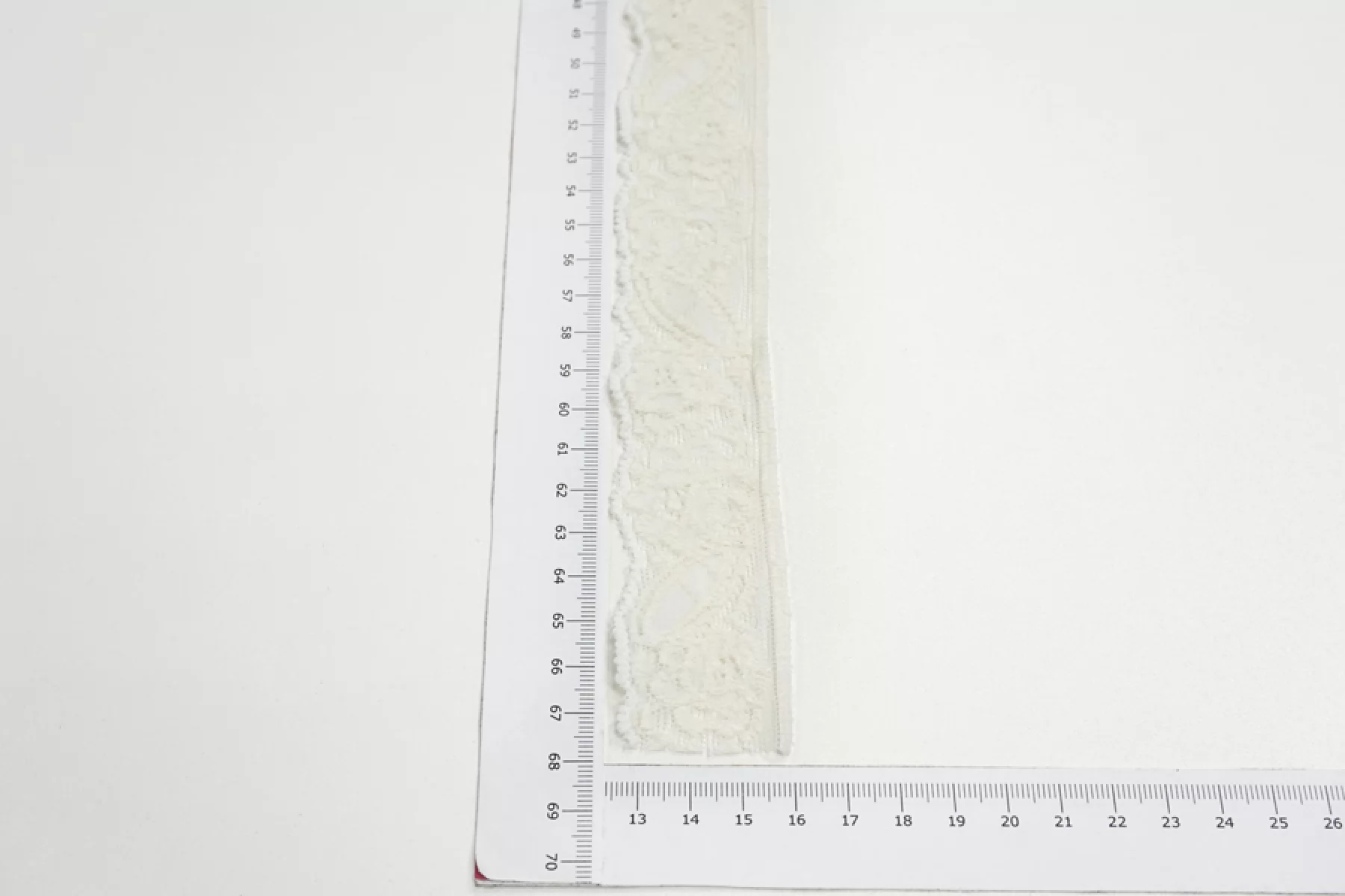 Итальянское кружево бело-молочного цвета. Мягкое, пластичное. Отлично подойдет для пошива нижнего белья, отделки одежды и аксессуаров.