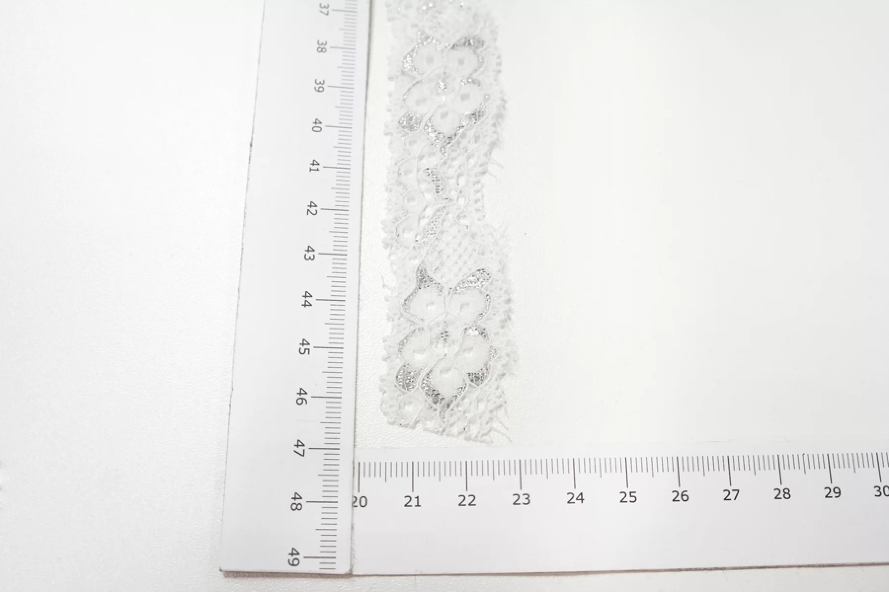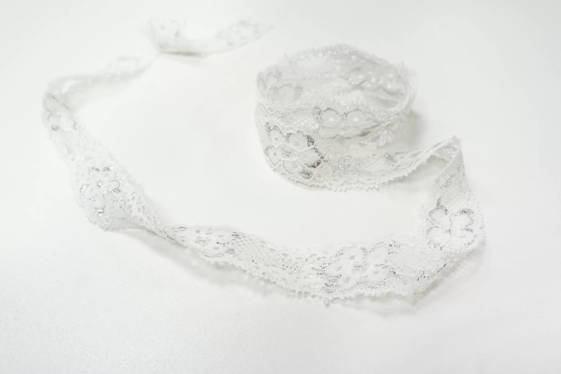 Итальянское кружево белого цвета с серебряной нитью. Мягкое, пластичное, хорошо держит форму. Отлично подойдет для пошива нижнего белья, отделки одежды и аксессуаров.