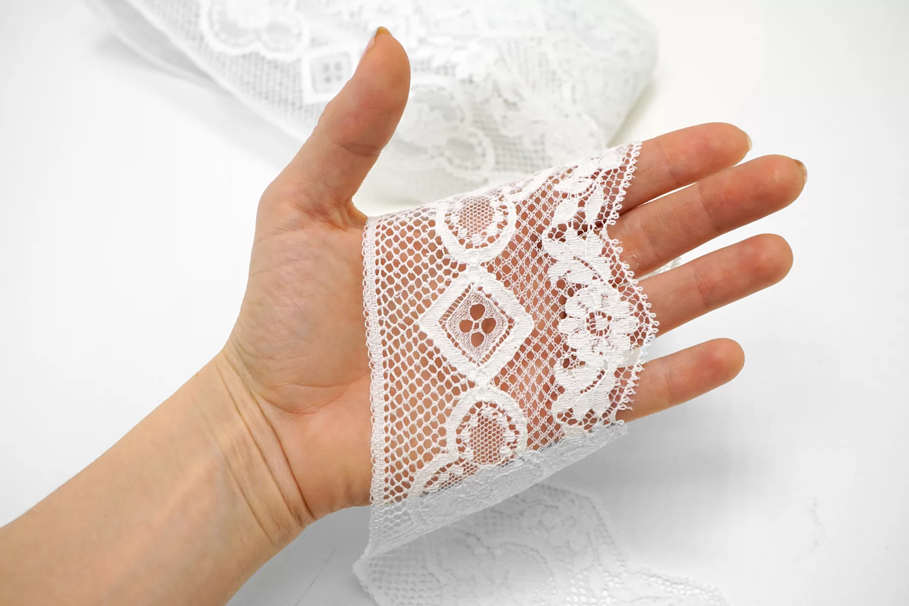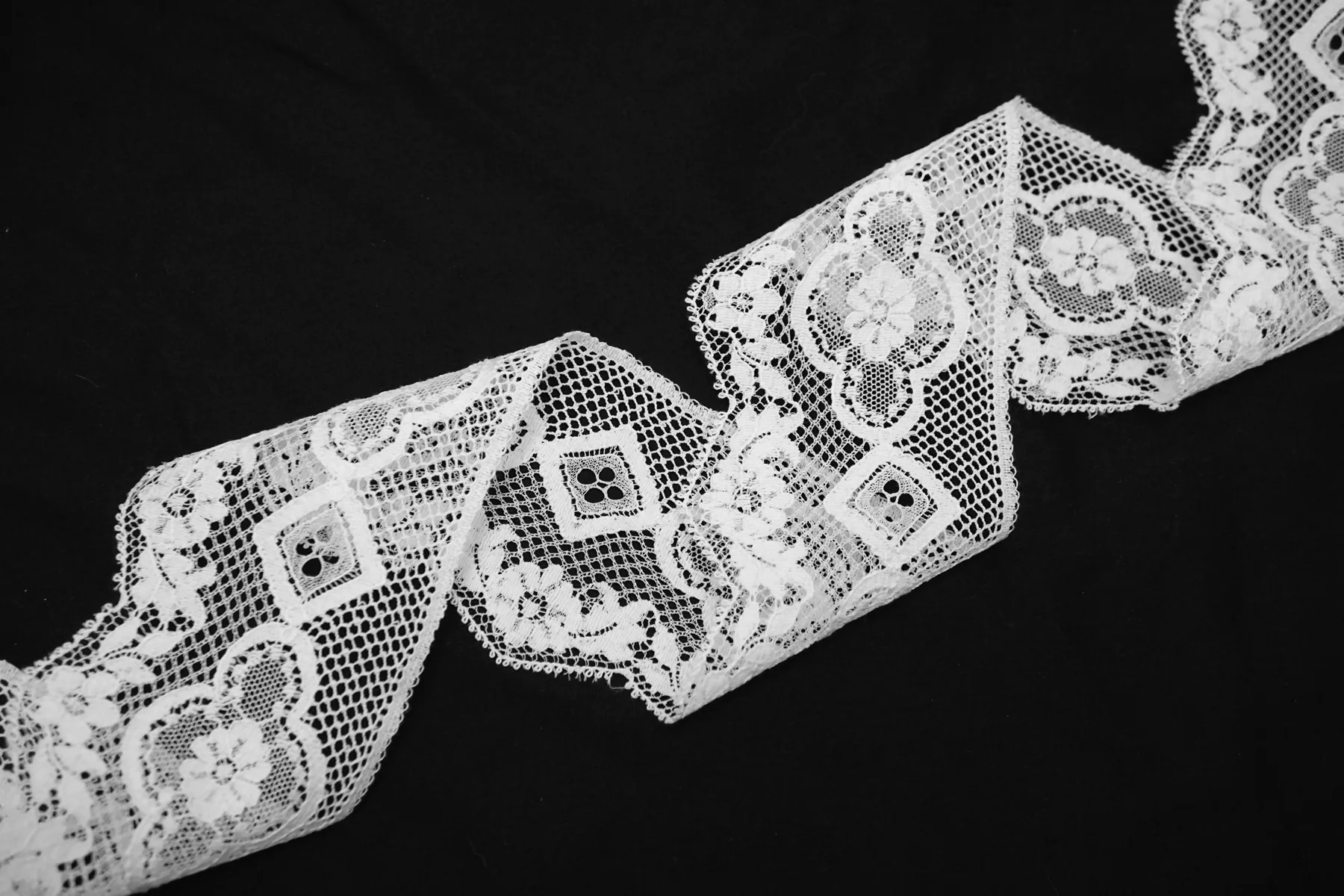 Итальянское кружево белого цвета. Мягкое, пластичное. Не тянется. Отлично подойдет для пошива нижнего белья, отделки одежды и аксессуаров.