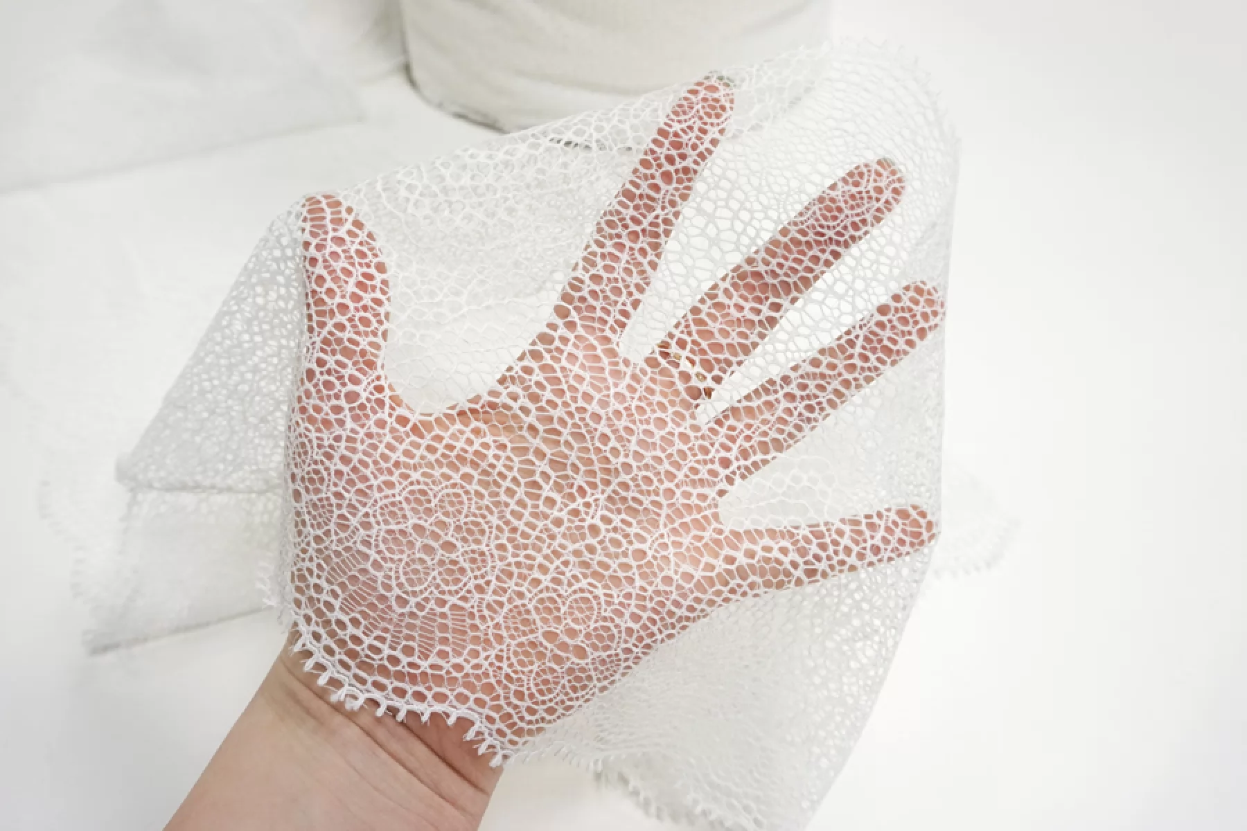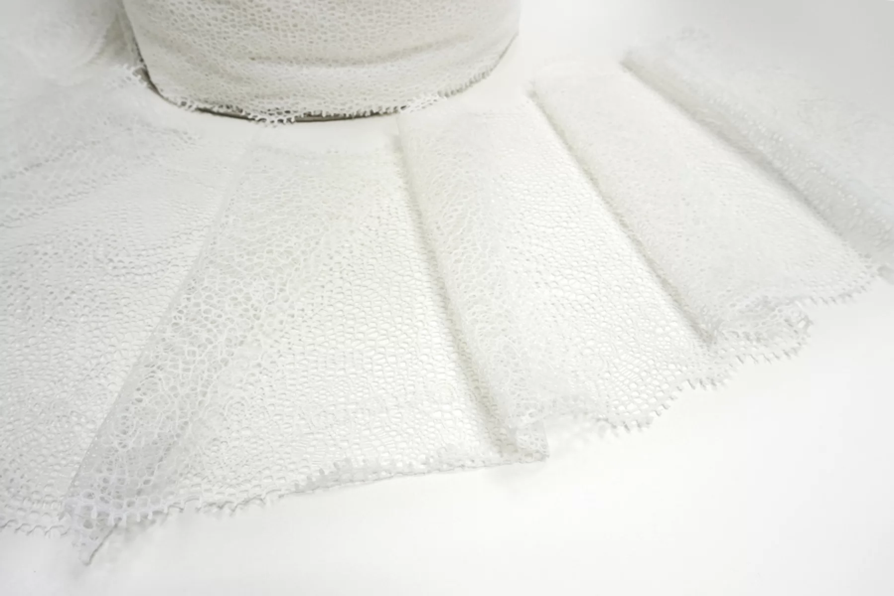 Итальянское ажурное кружево белого цвета с желтоватым оттенком. Мягкое, пластичное. Отлично подойдет для пошива нижнего белья, отделки одежды и аксессуаров.
