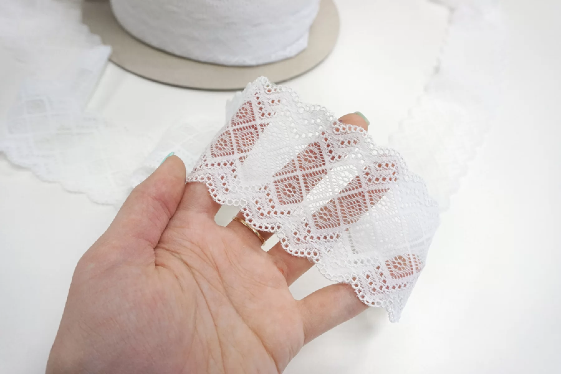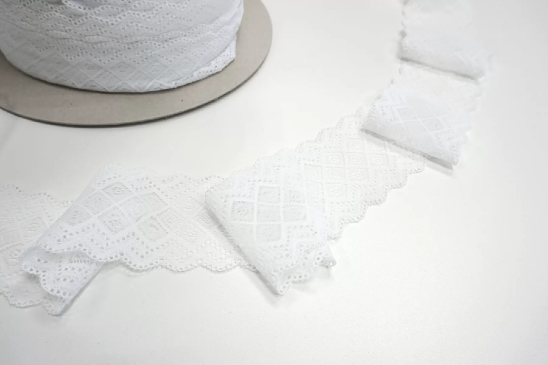 Итальянское кружево белого цвета. Мягкое, пластичное. Отлично подойдет для пошива нижнего белья, отделки одежды и аксессуаров.