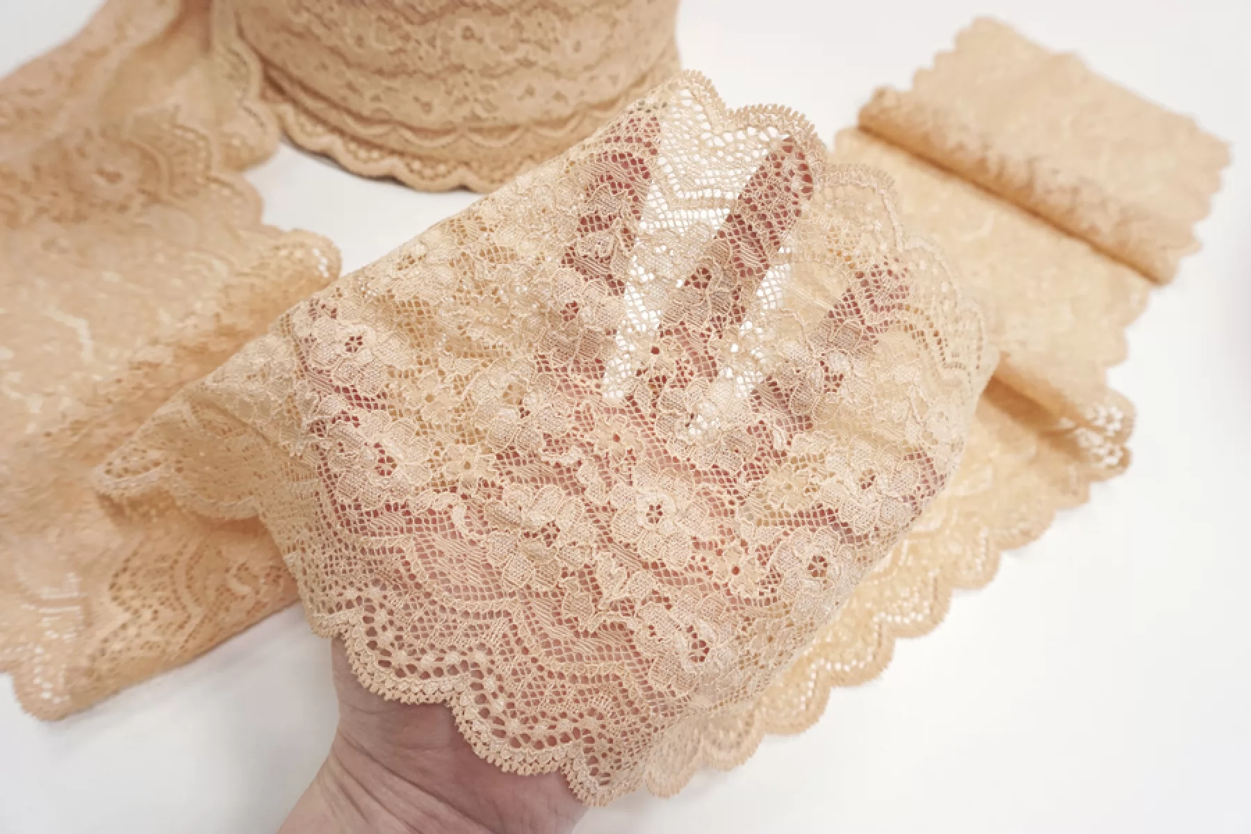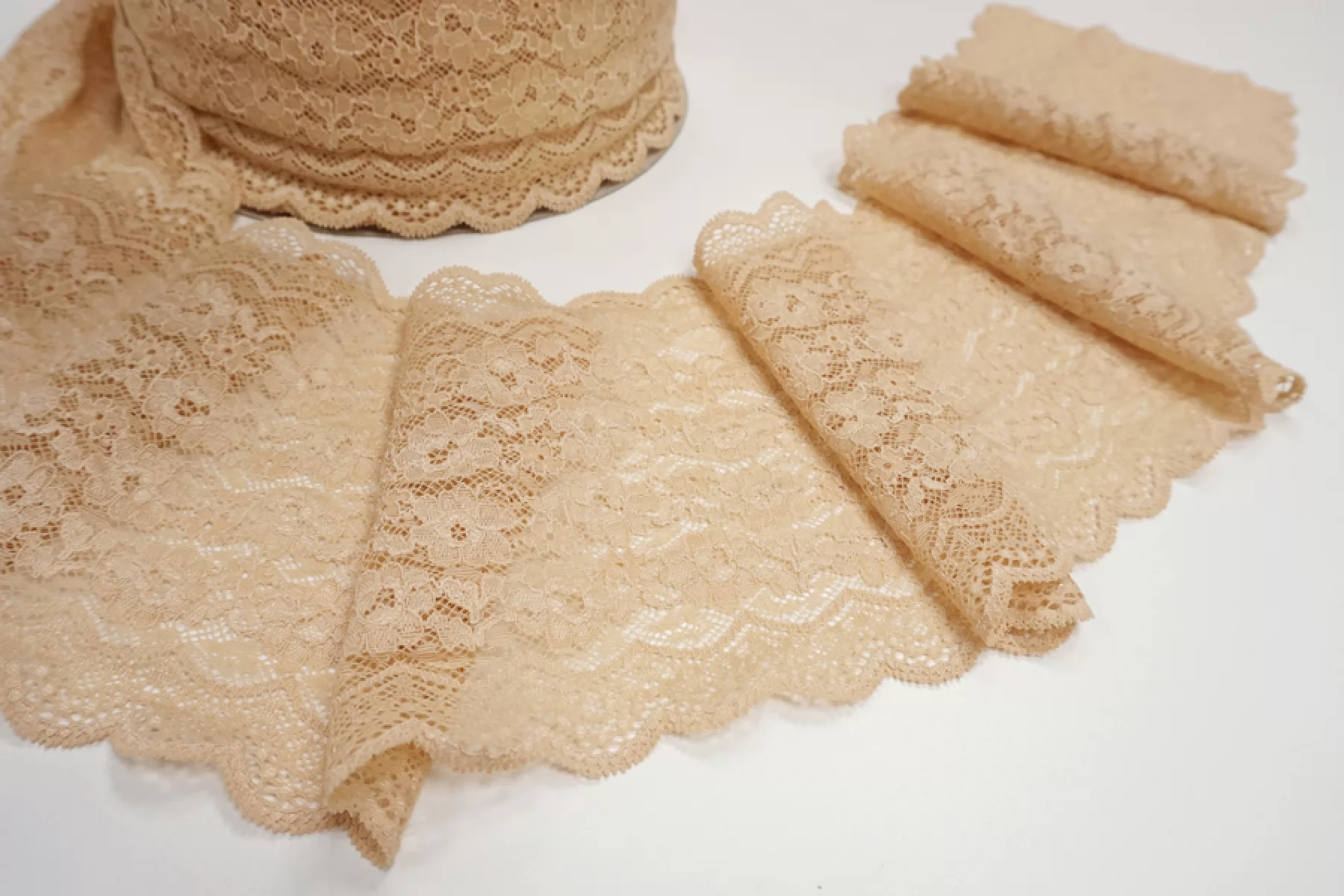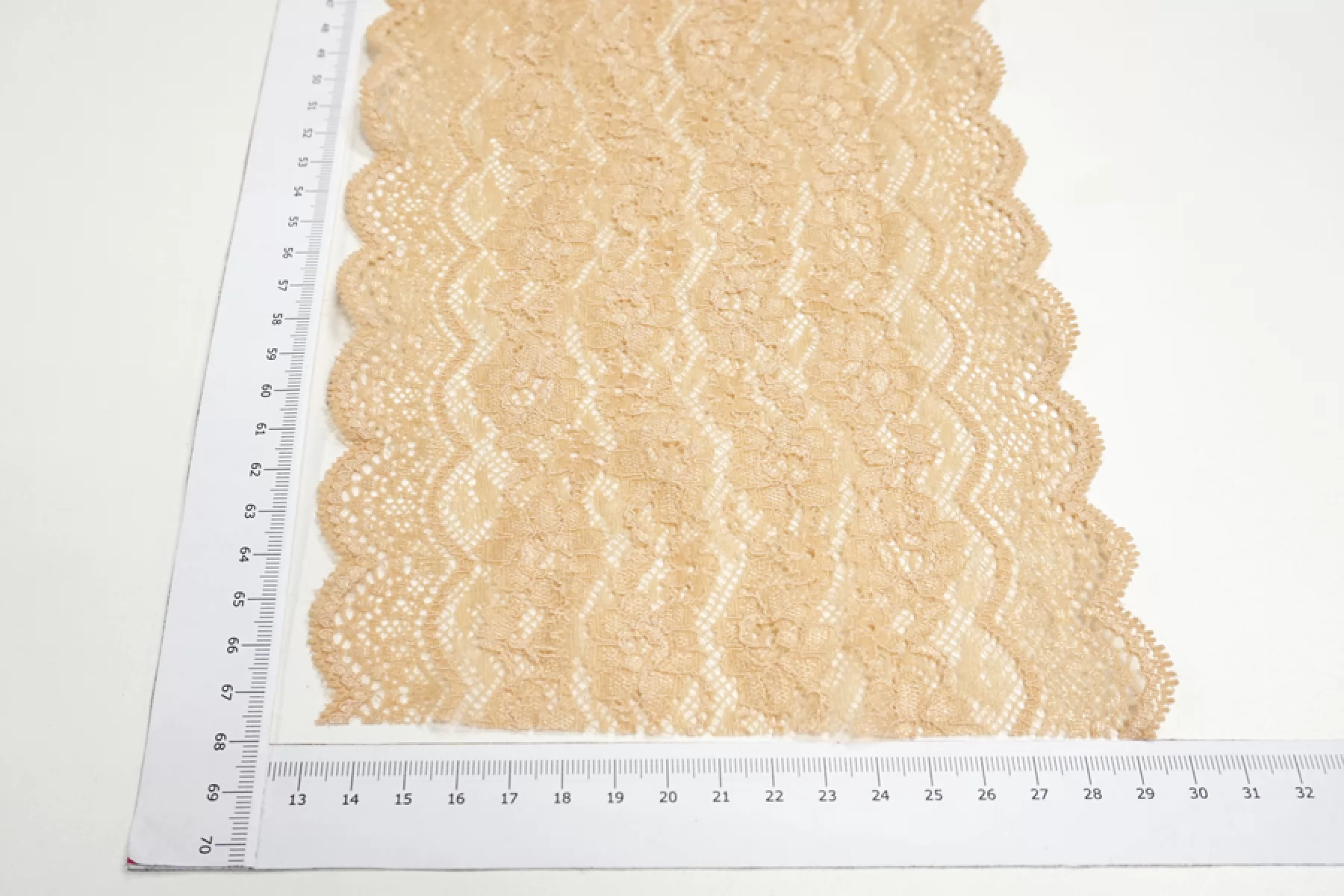 Итальянское кружево бежево-золотистого цвета с блеском. Мягкое, пластичное. Отлично подойдет для пошива нижнего белья, отделки одежды и аксессуаров.