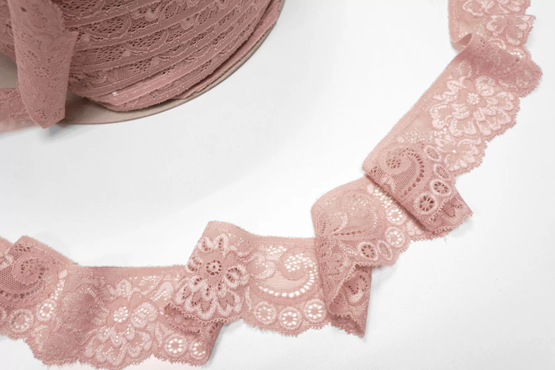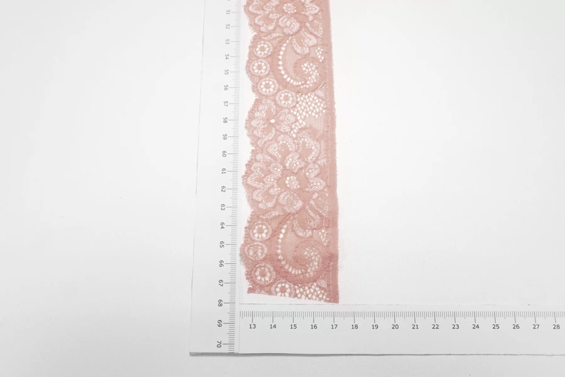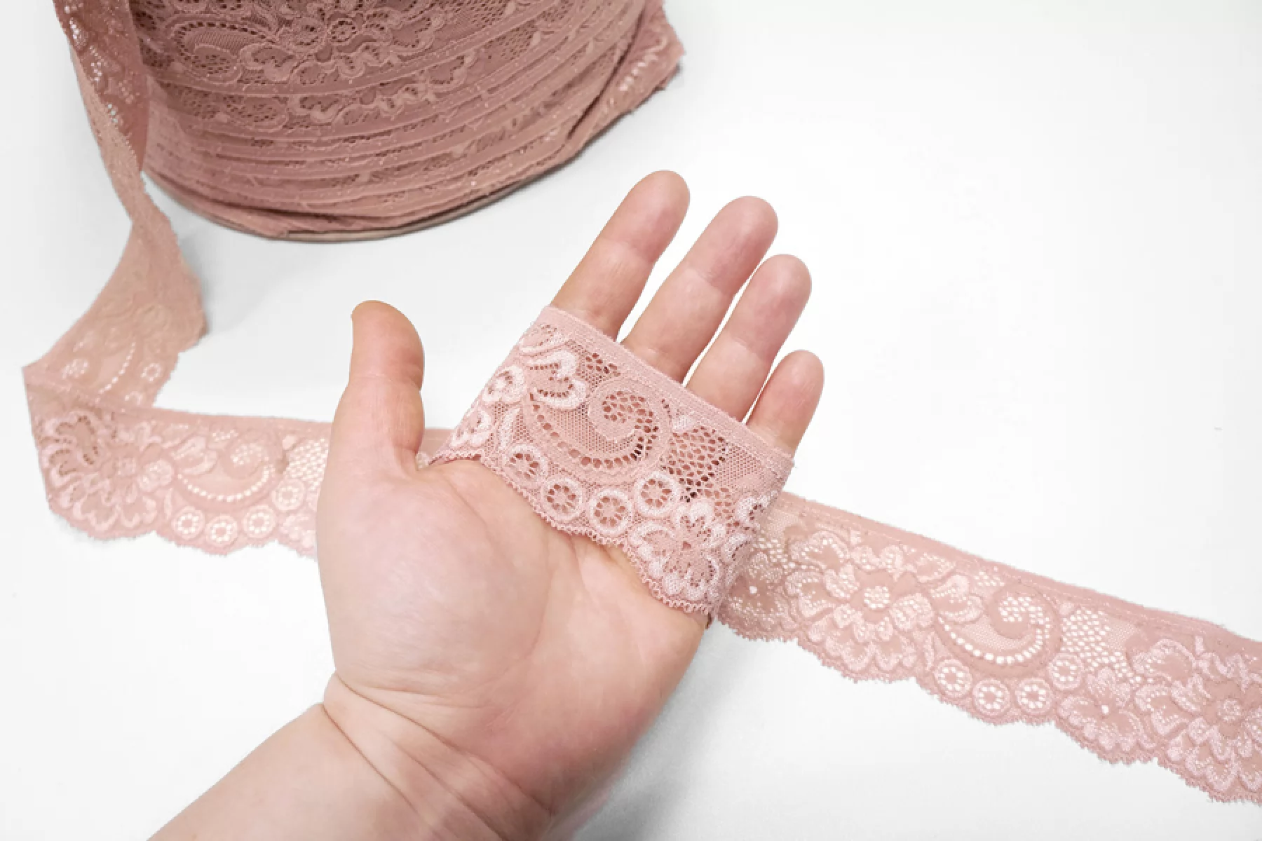 Итальянское кружево телесного цвета с блеском. Мягкое, пластичное. Отлично подойдет для пошива нижнего белья, отделки одежды и аксессуаров.