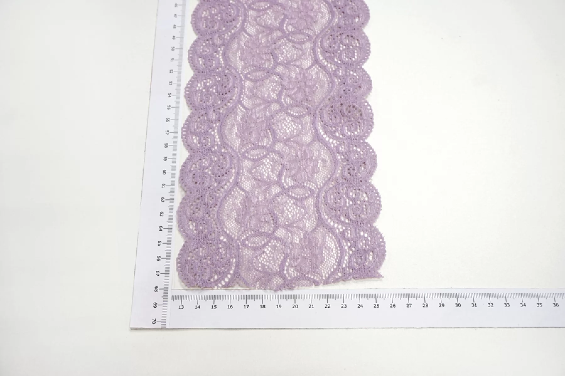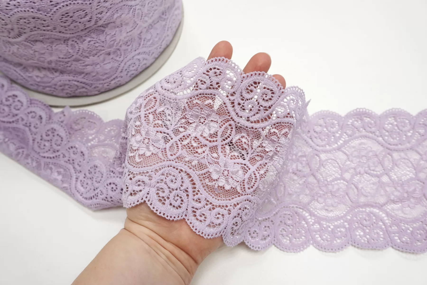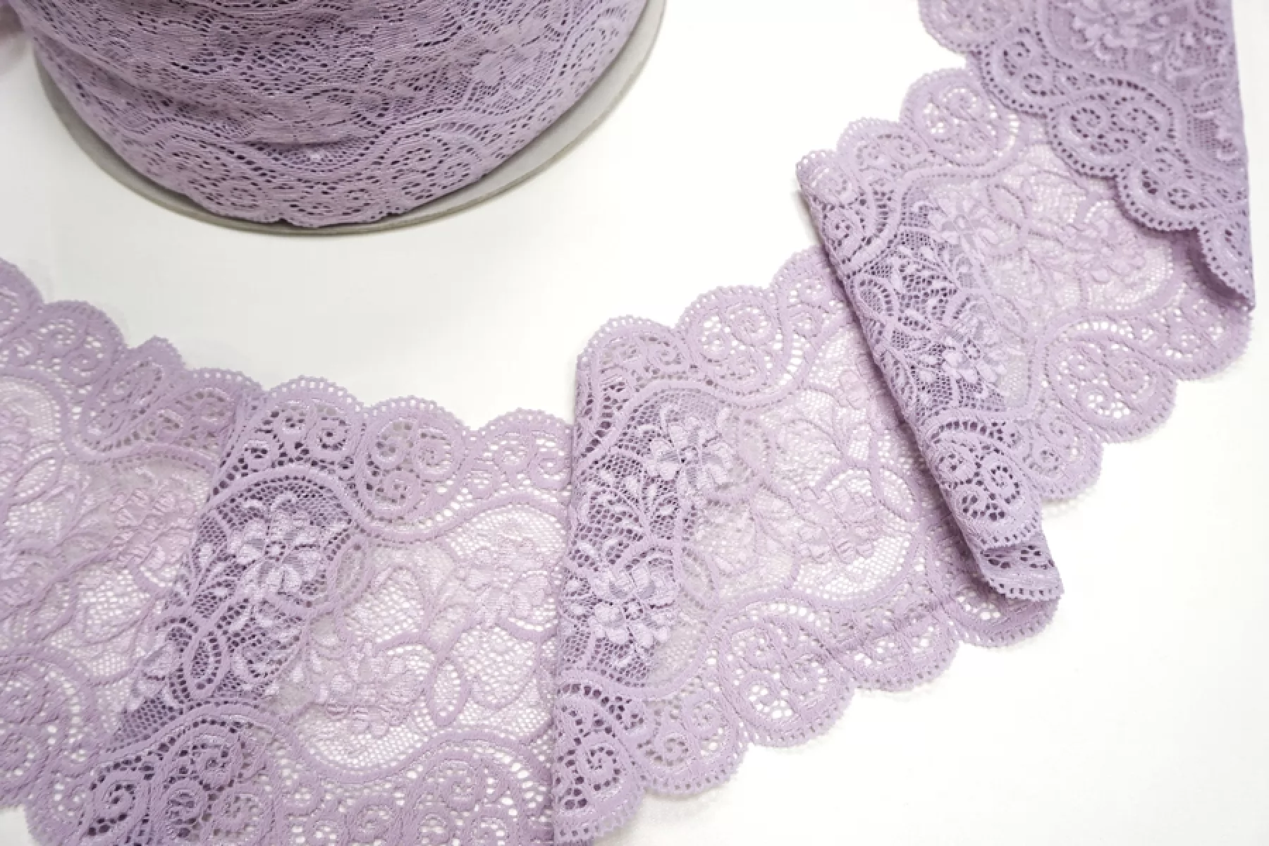 Итальянское кружево бледно-лилового цвета с блеском. Мягкое, пластичное. Отлично подойдет для пошива нижнего белья, отделки одежды и аксессуаров.