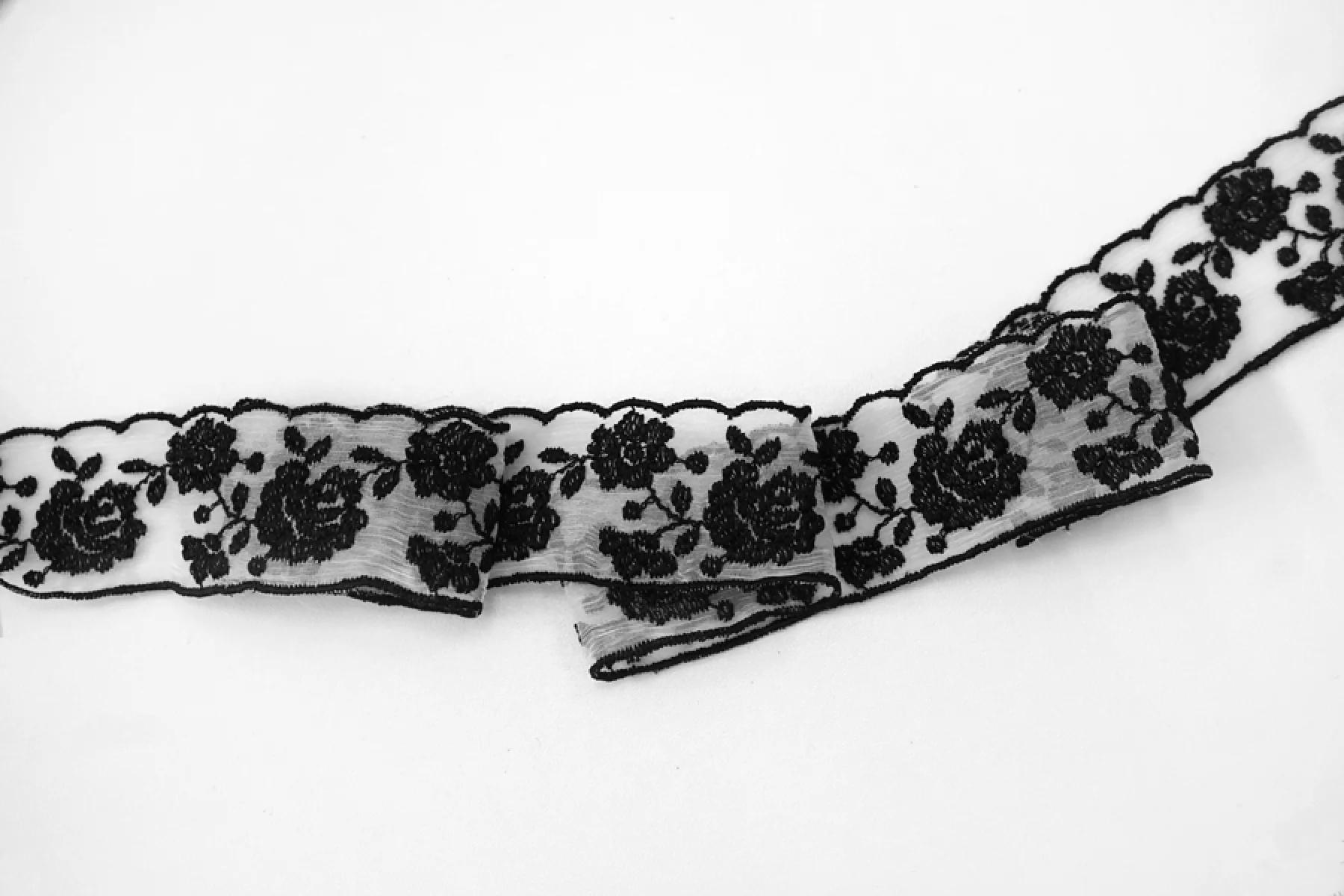 Итальянское кружево черного цвета на белом шелке. Мягкое, пластичное. Отлично подойдет для пошива нижнего белья, отделки одежды и аксессуаров.