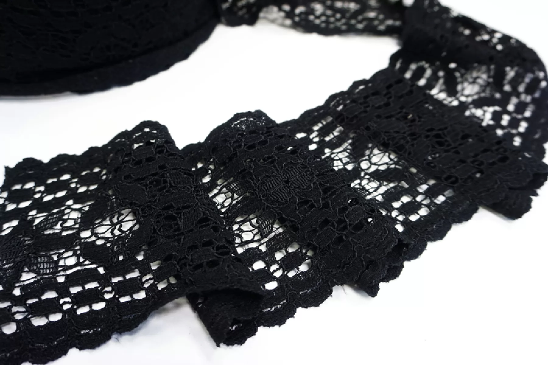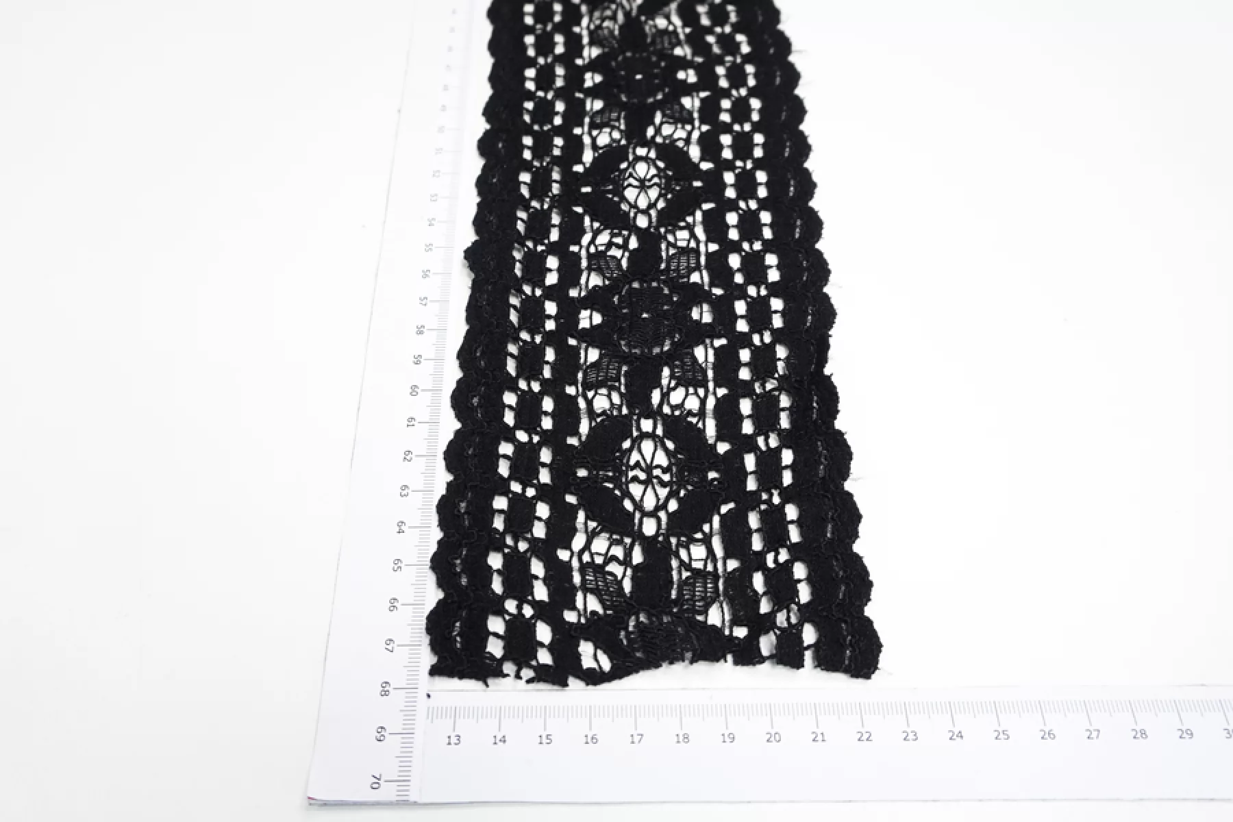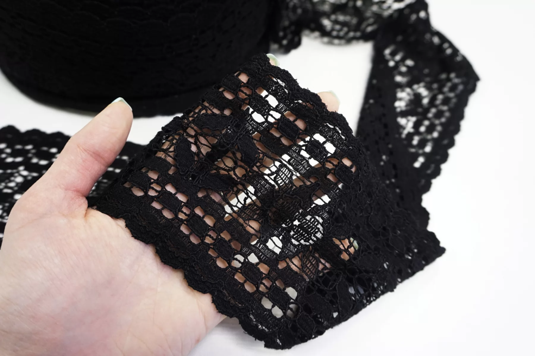 Итальянское кружево черного цвета. Мягкое, пластичное. Отлично подойдет для пошива нижнего белья, отделки одежды и аксессуаров.