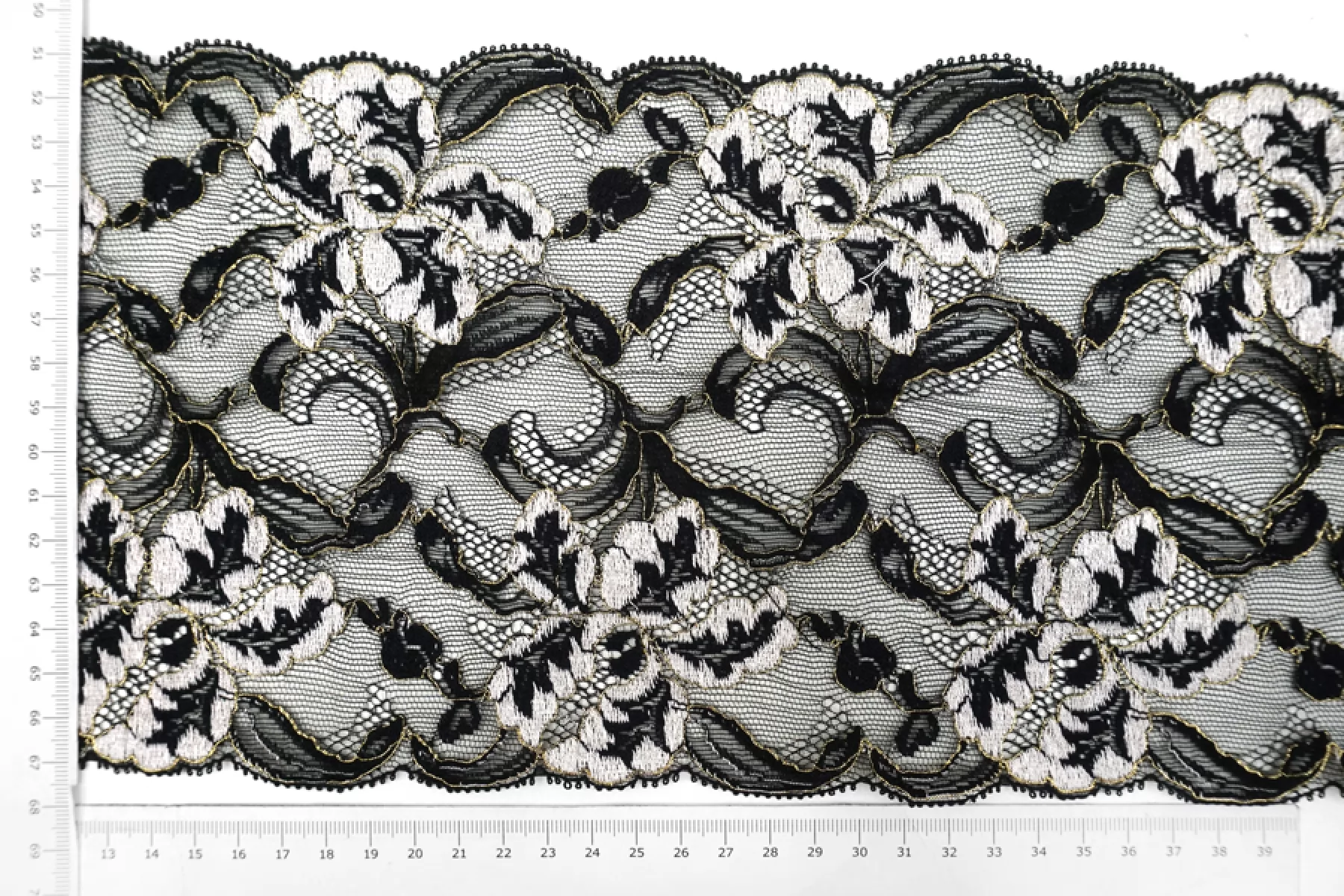 Итальянское эластичное кружево в черно-сероых цветах с металлизированной золотой нитью. Мягкое, пластичное. Отлично подойдет для пошива нижнего белья, отделки одежды и аксессуаров.
