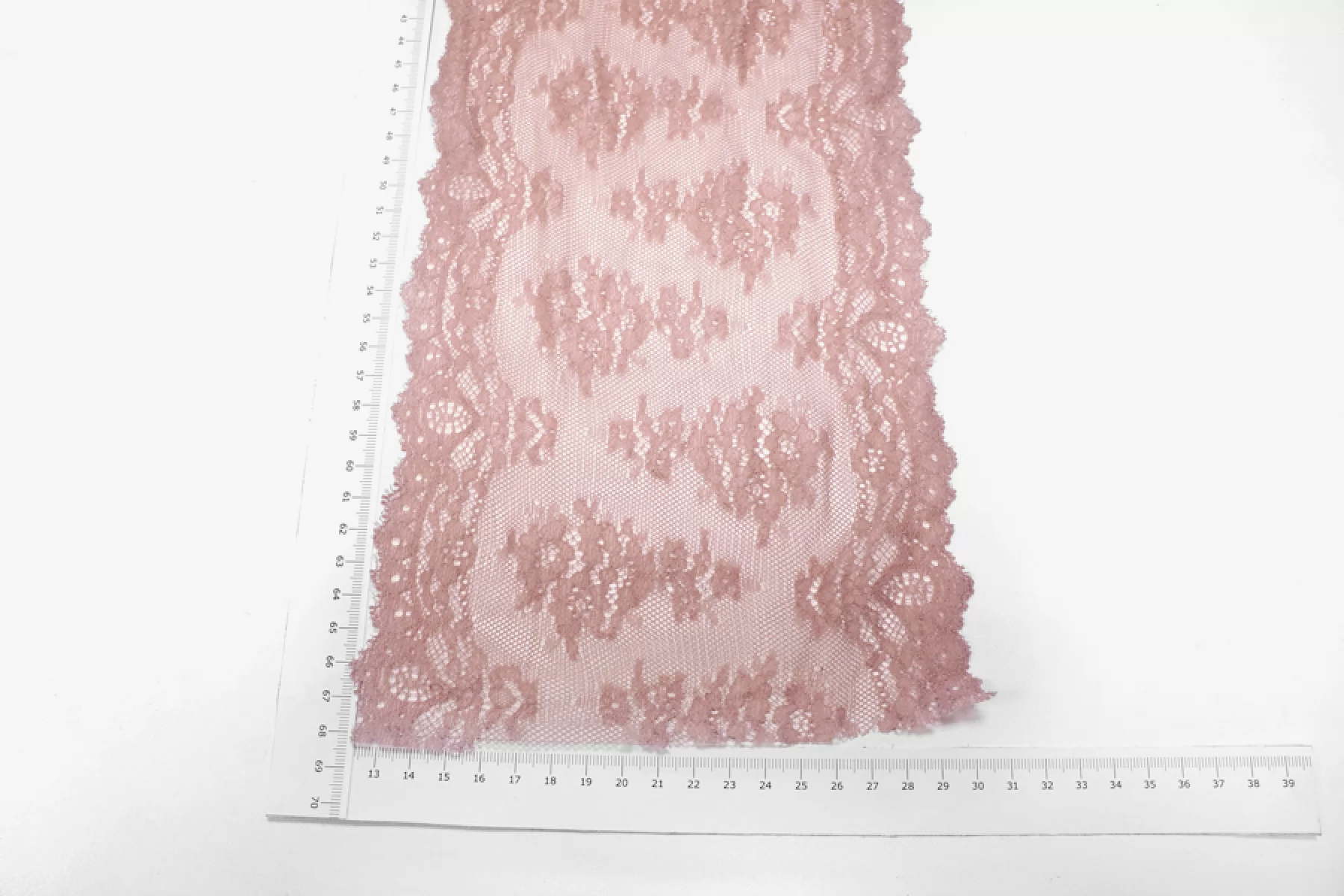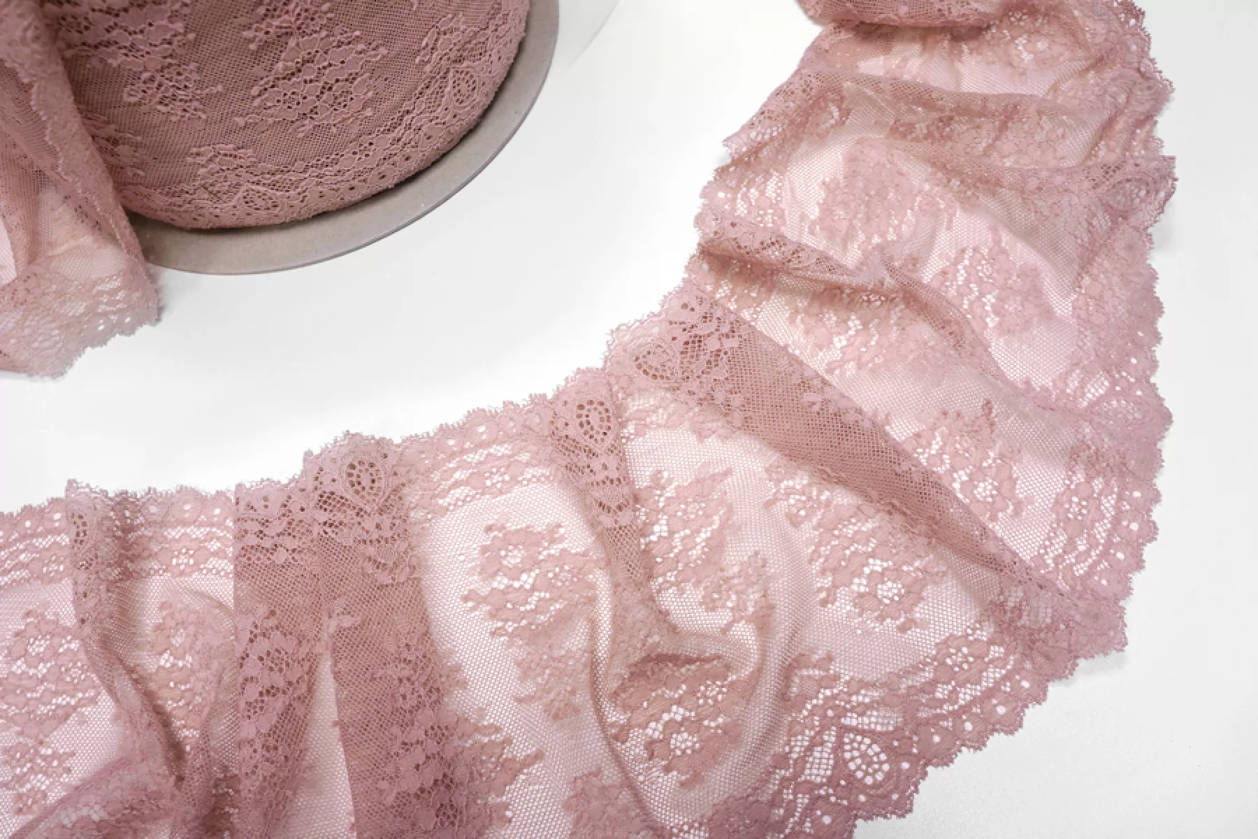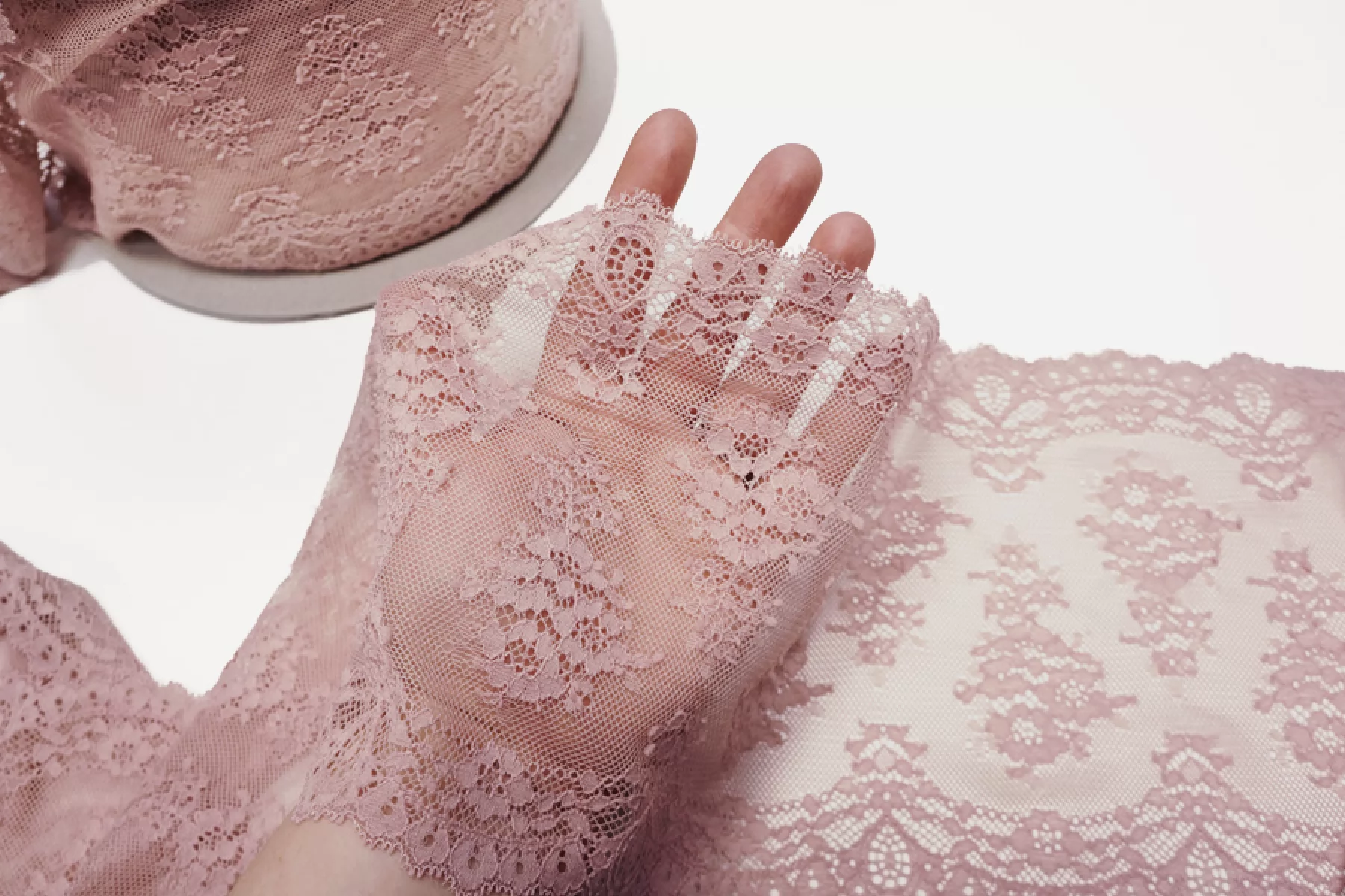 Итальянское кружево припыленно-розовое. Мягкое, пластичное. Отлично подойдет для пошива нижнего белья, отделки одежды и аксессуаров.