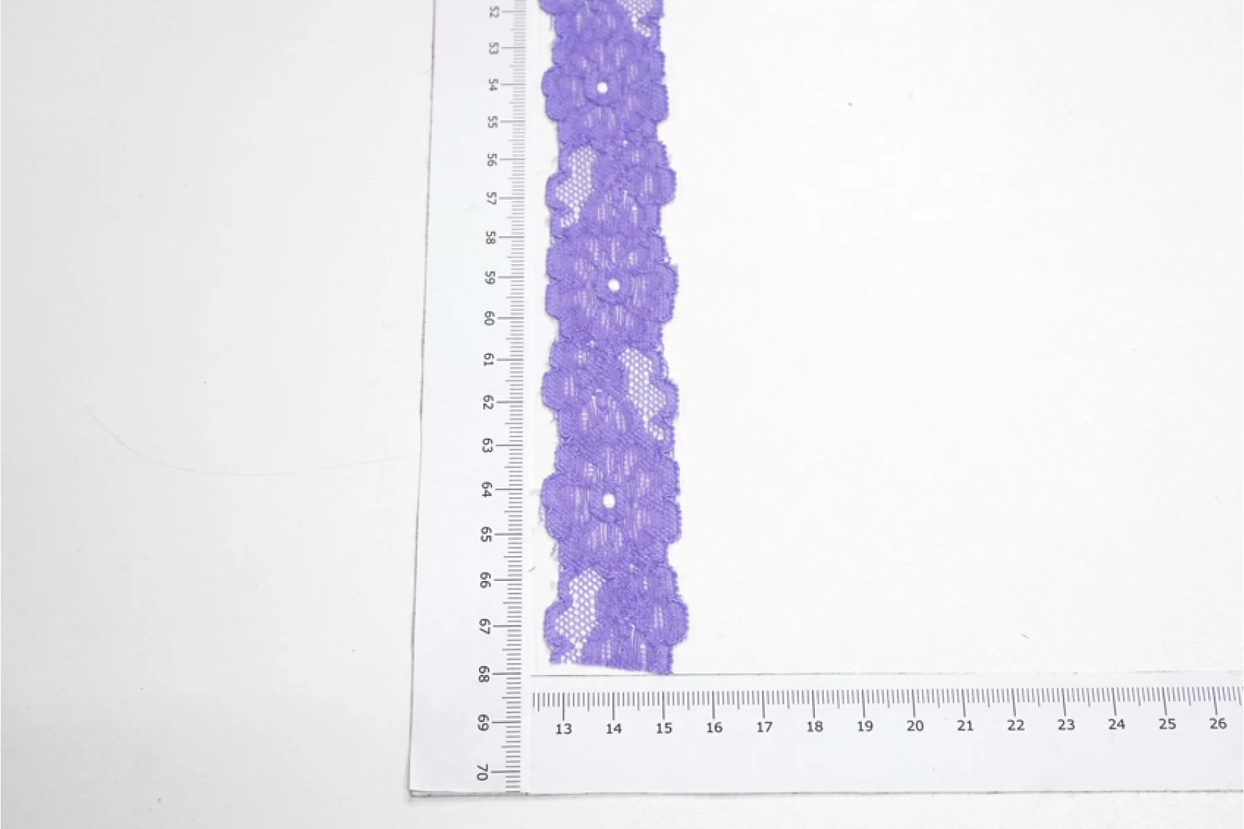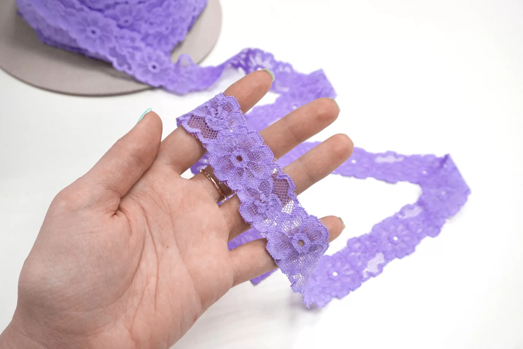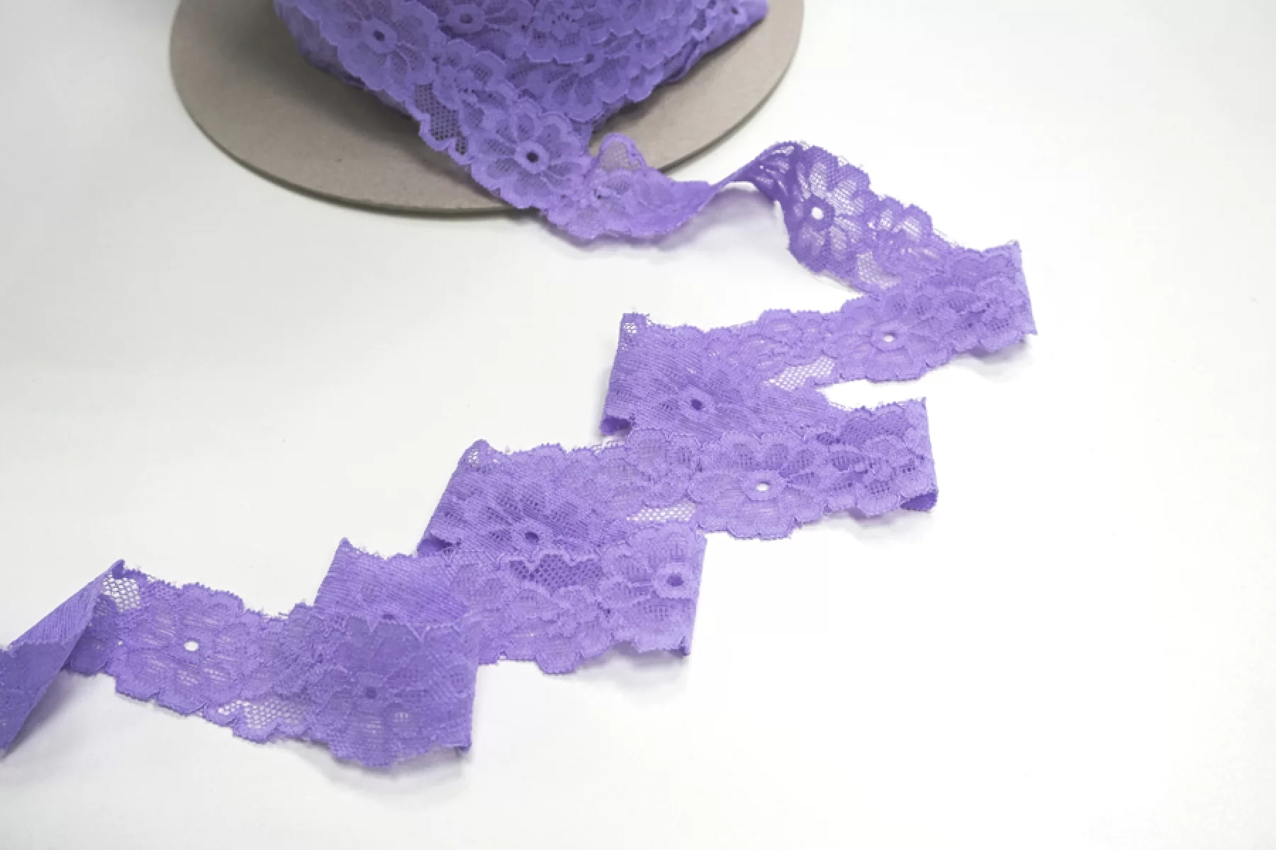 Итальянское кружево фиалкового цвета. Мягкое, пластичное. Отлично подойдет для пошива нижнего белья, отделки одежды и аксессуаров.