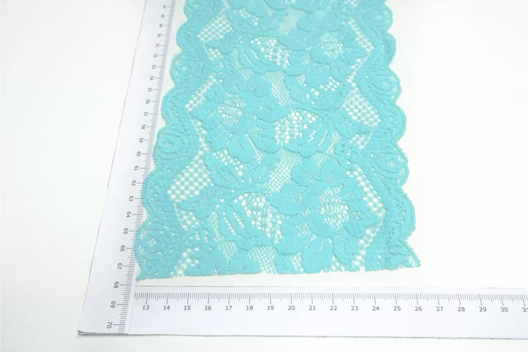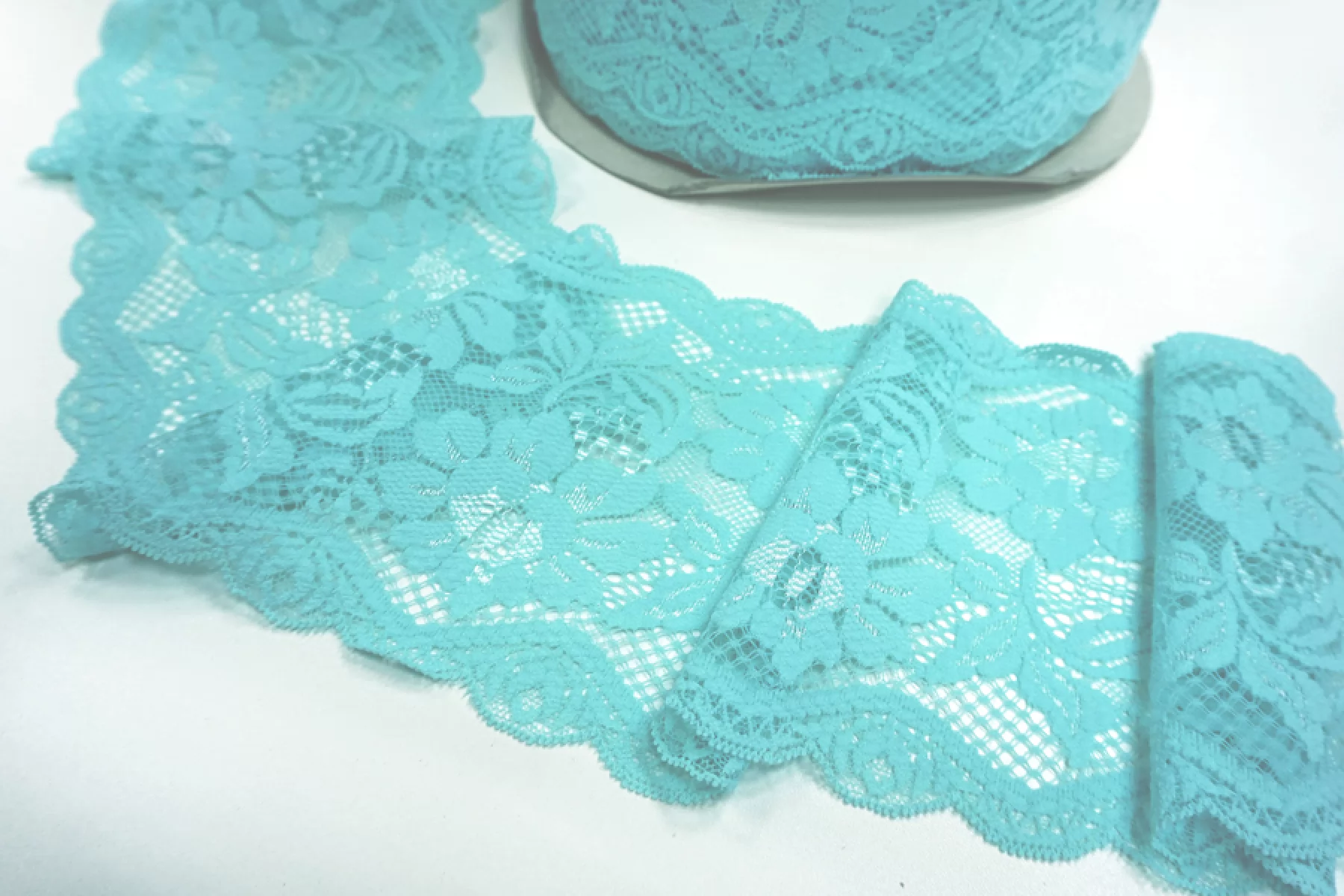 Итальянское кружево голубого цвета. Мягкое, пластичное. Отлично подойдет для пошива нижнего белья, отделки одежды и аксессуаров.
