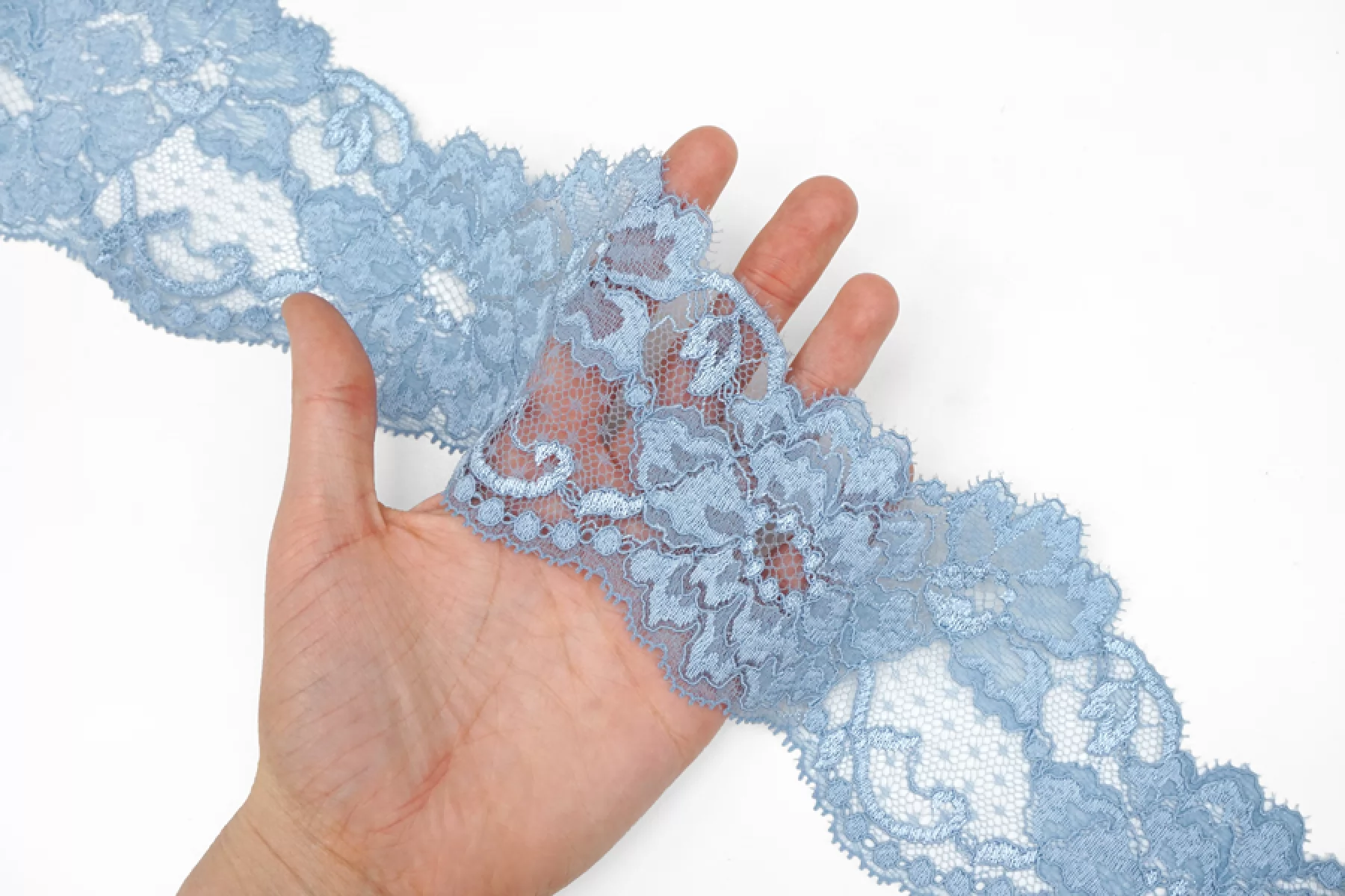 Итальянское эластичное голубого цвета. Мягкое, пластичное. Отлично подойдет для пошива нижнего белья, отделки одежды и аксессуаров.