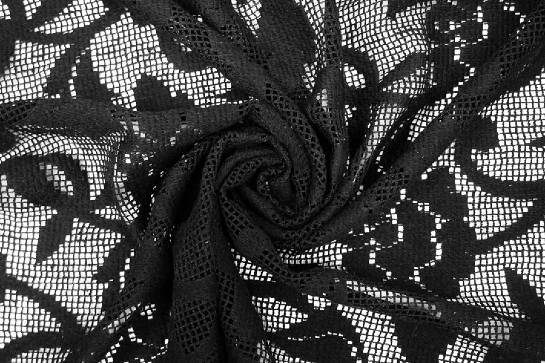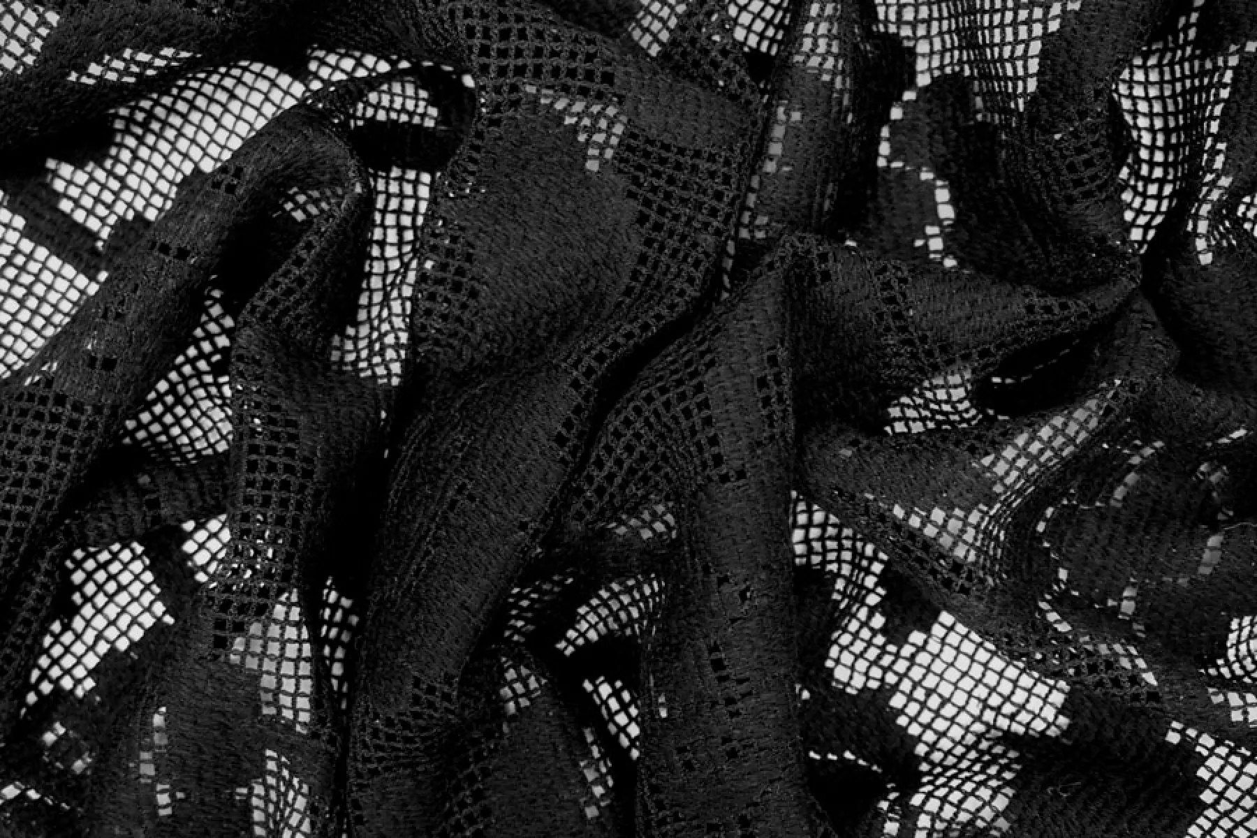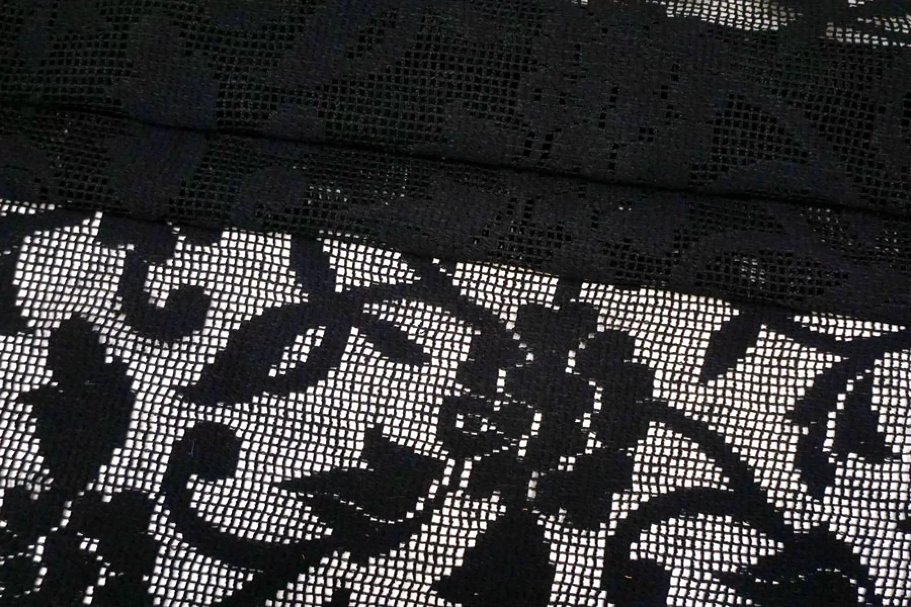 Итальянское хлопковое кружево с крупным цветочным узором черного цвета. Основа из полиэстера, сами цветы из хлопка. Приятный, мягкий и немного суховатый наощупь. Немного тянется. Форму держит. Просвечивает. Не мнется. Отлично подойдет для пошива самостоятельного изделия (на подкладе), или отделки отдельных элементов одежды.