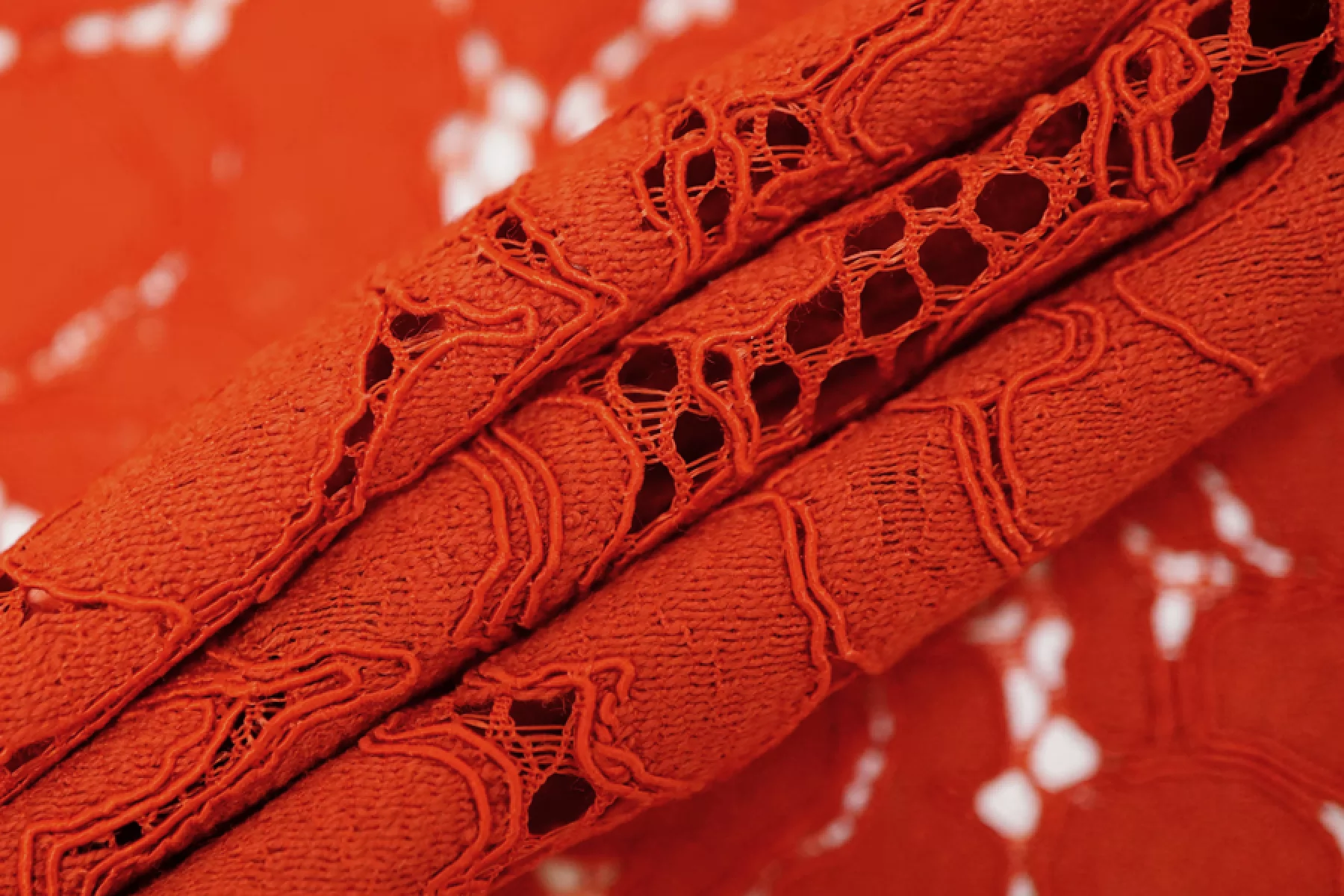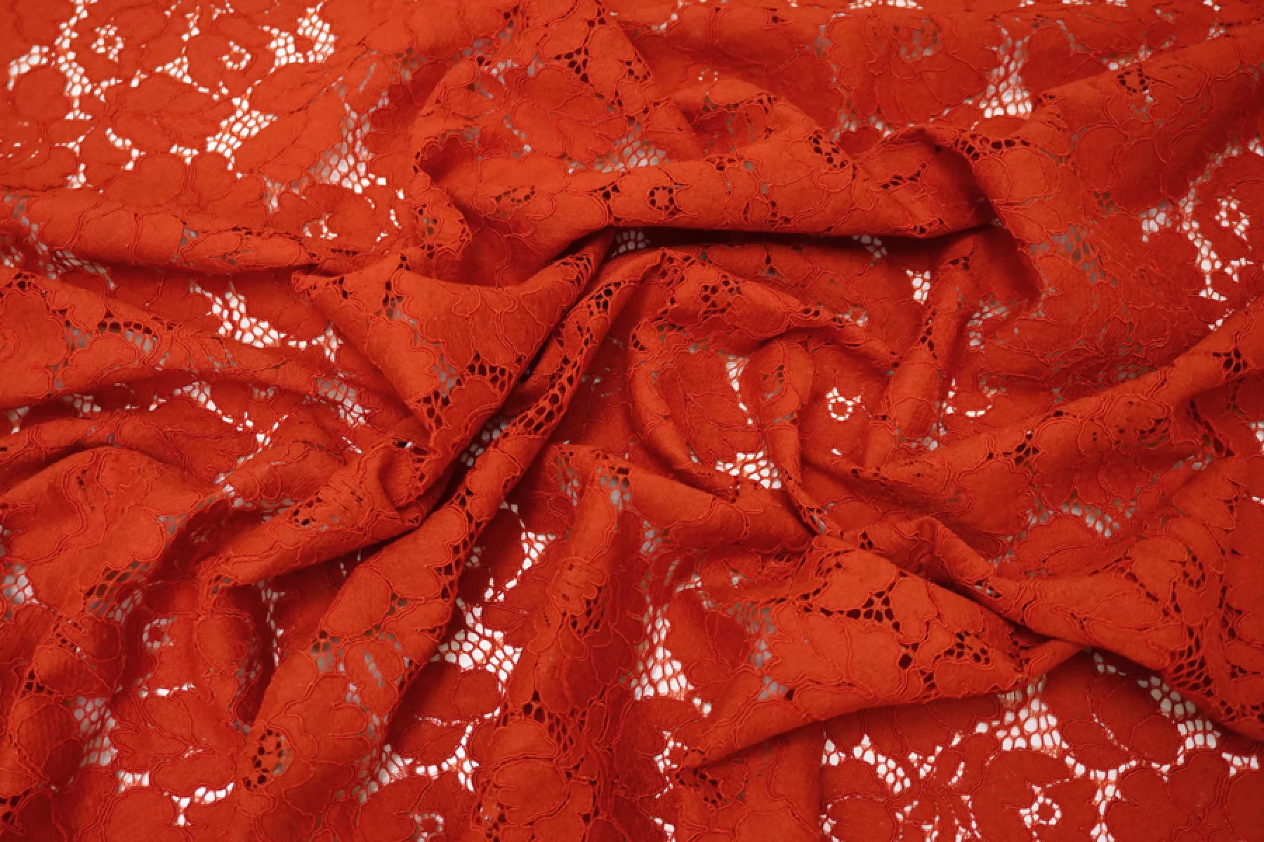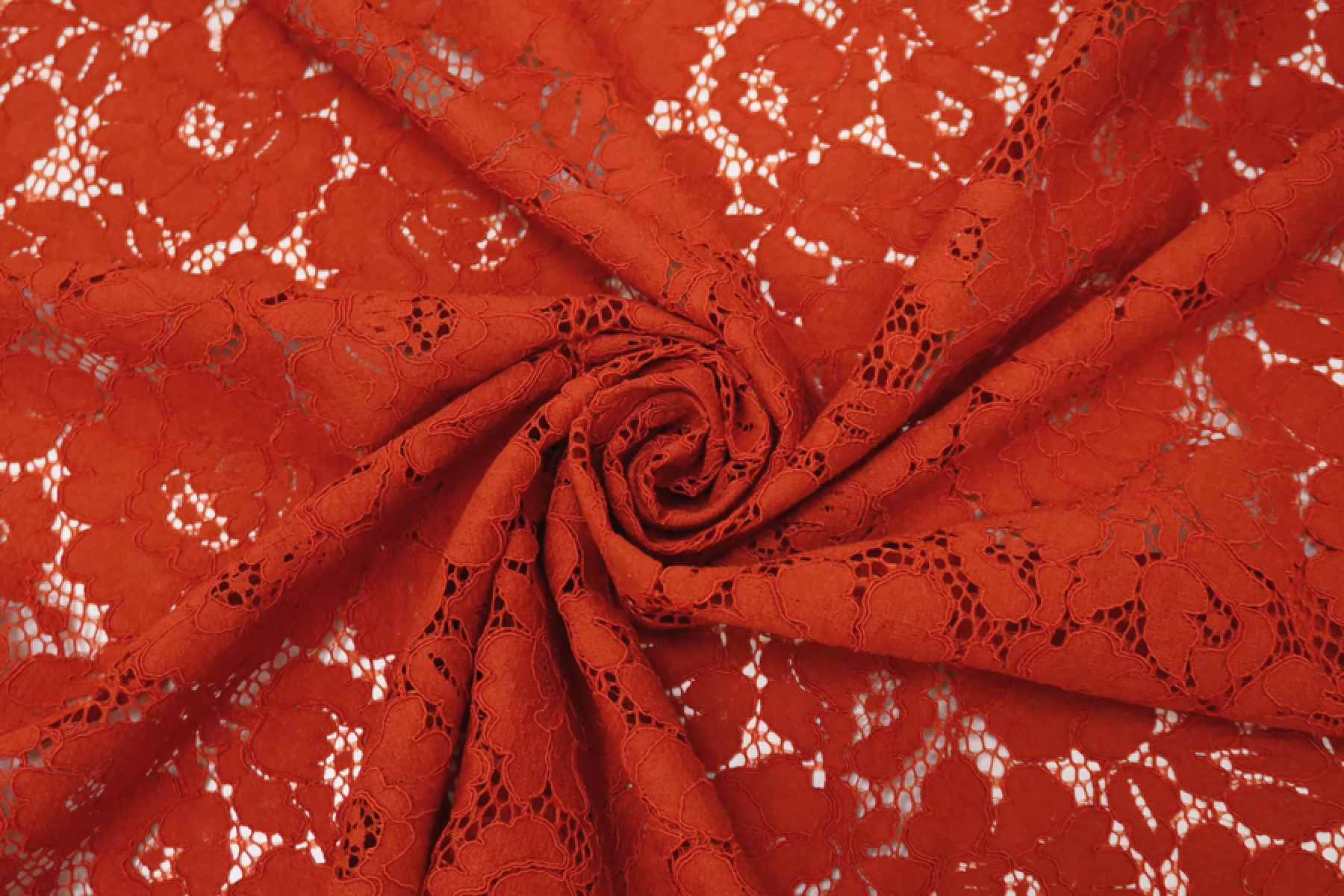 Очень красивое итальянское хлопковое кружево красного цвета (с тёплым, рыжеватым подтоном) с цветочной выработкой и кордовым шнуром. Цветы среднего размера. Тактильно материал приятный, мягкий, ощущается выработка. Прекрасен в своей пластике. Подойдет для пошива нарядного самостоятельного изделия (на подкладе ) или отделки отдельных элементов одежды.