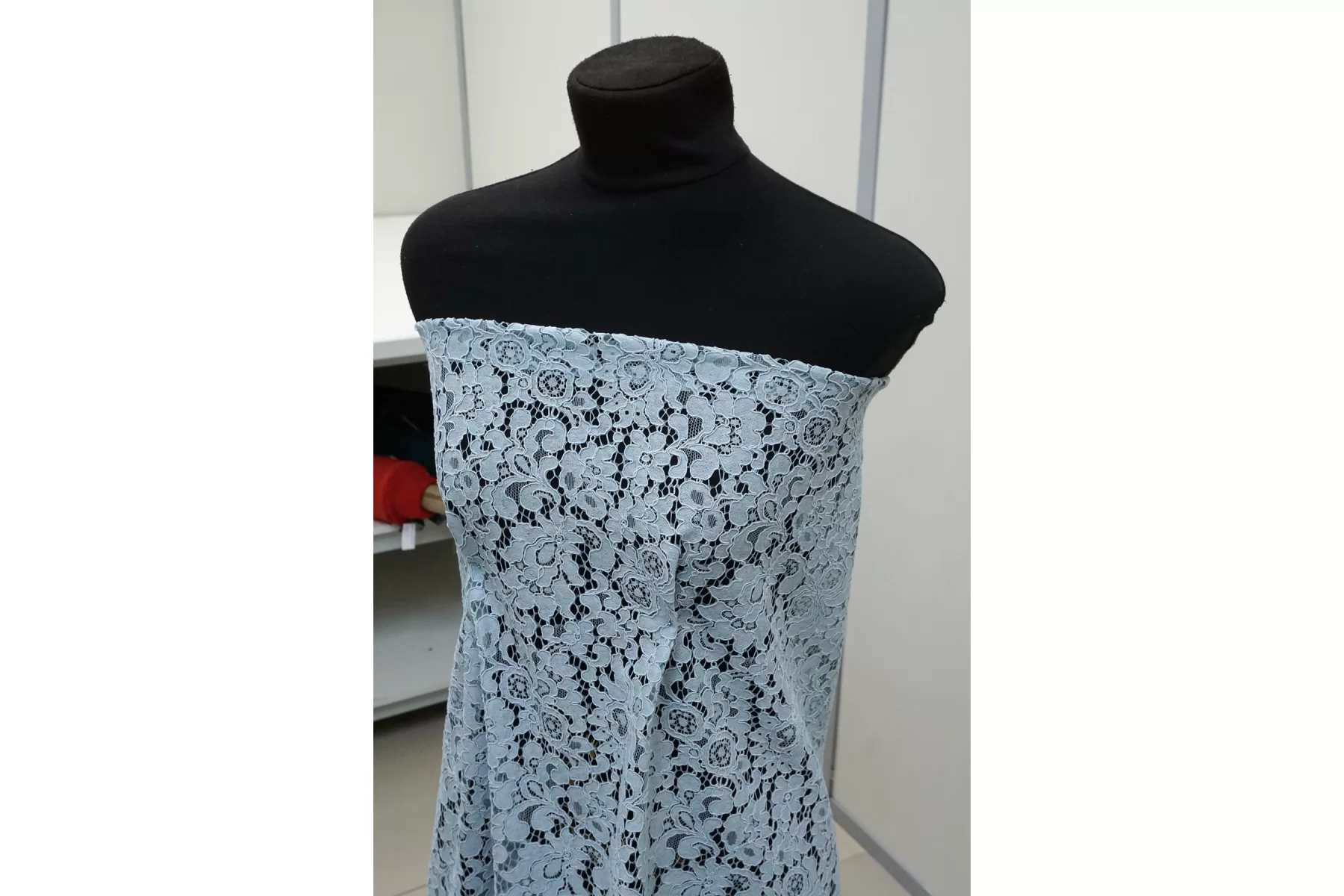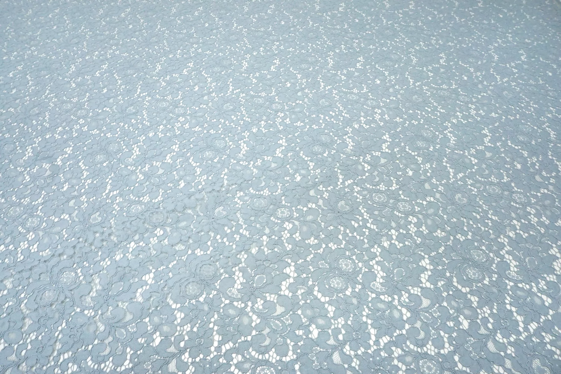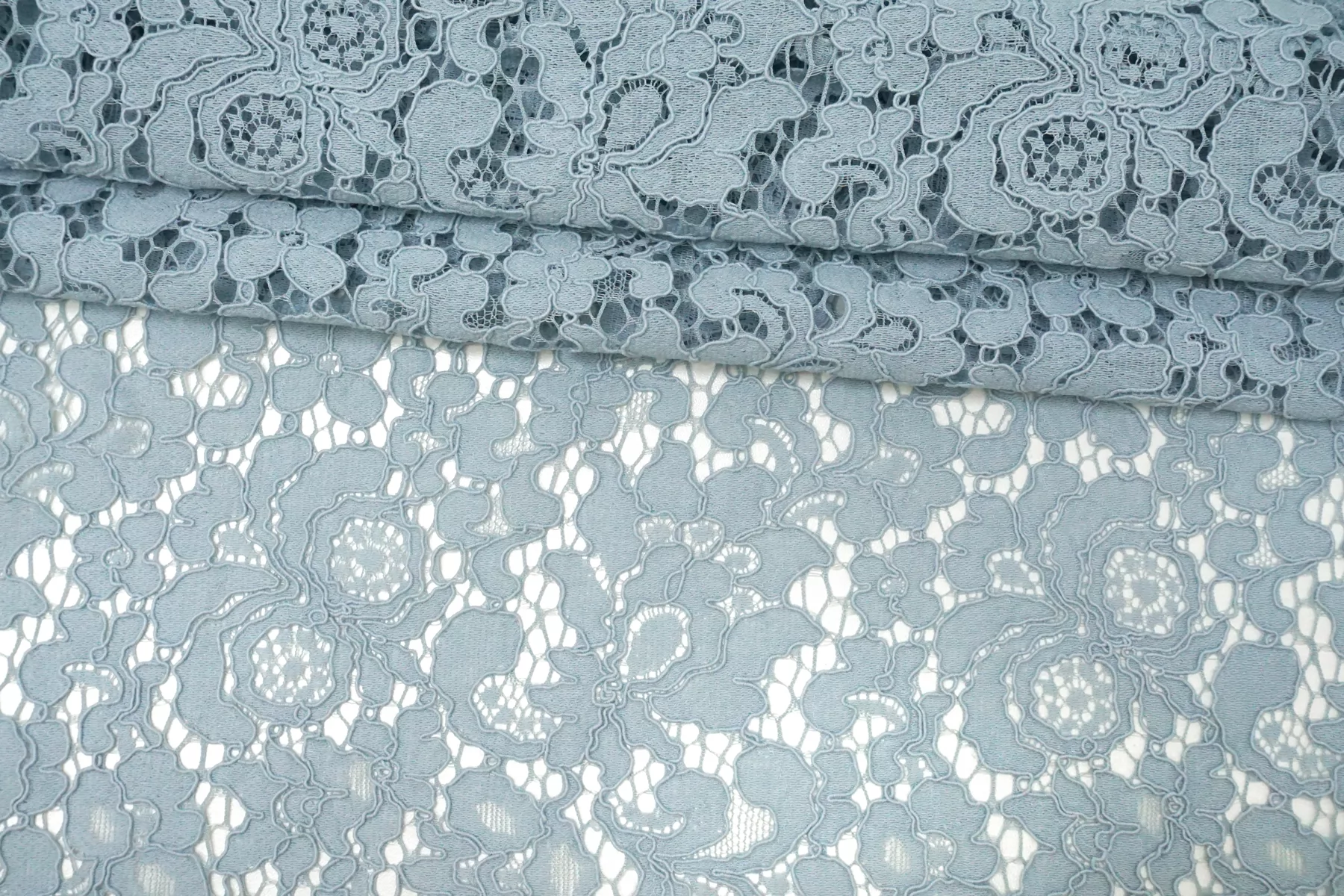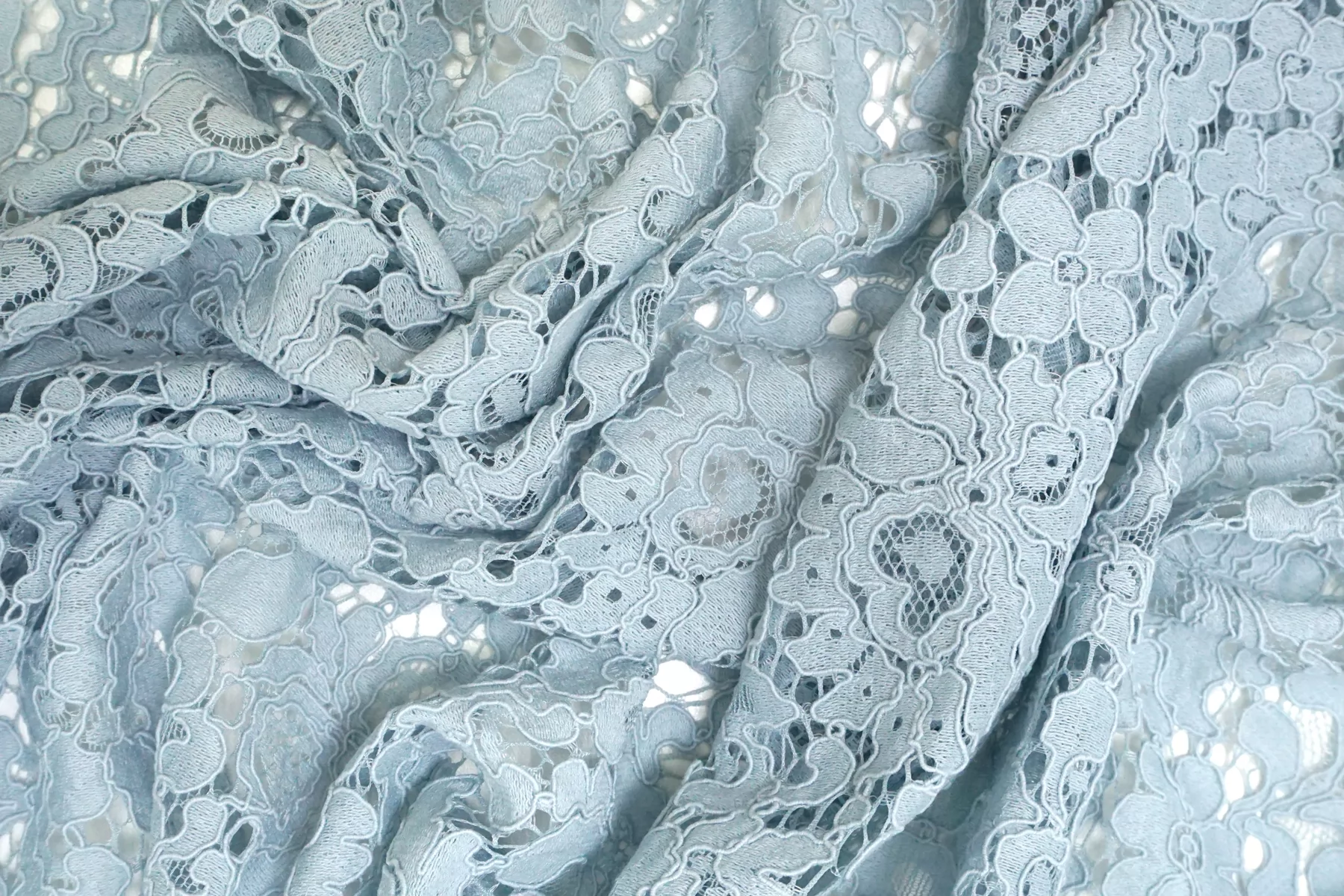 Очень красивое итальянское хлопковое кружево красивого серого цвета с голубым подтоном с цветочной выработкой и кордовым шнуром. Тактильно материал приятный, мягкий, ощущается выработка. Прекрасен в своей пластике. Подойдет для пошива нарядного самостоятельного изделия (на подкладе ) или отделки отдельных элементов одежды.