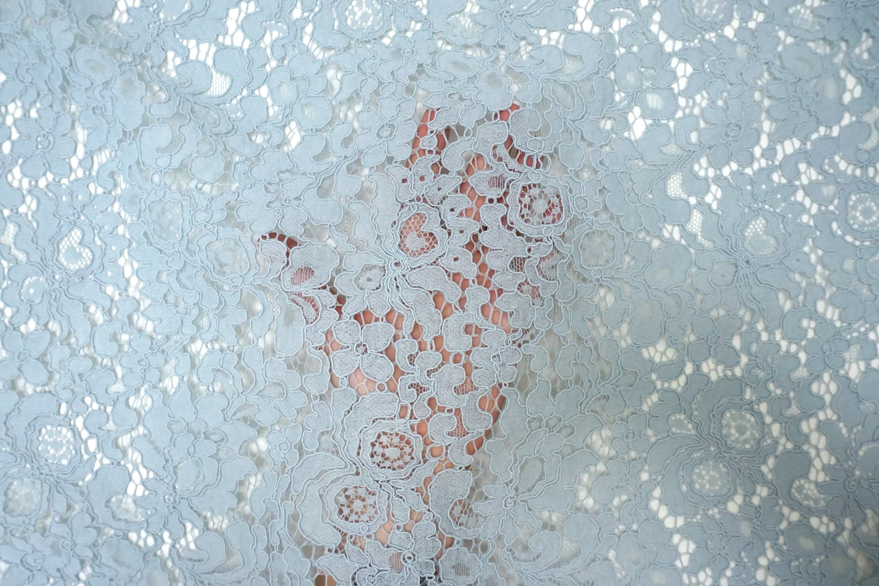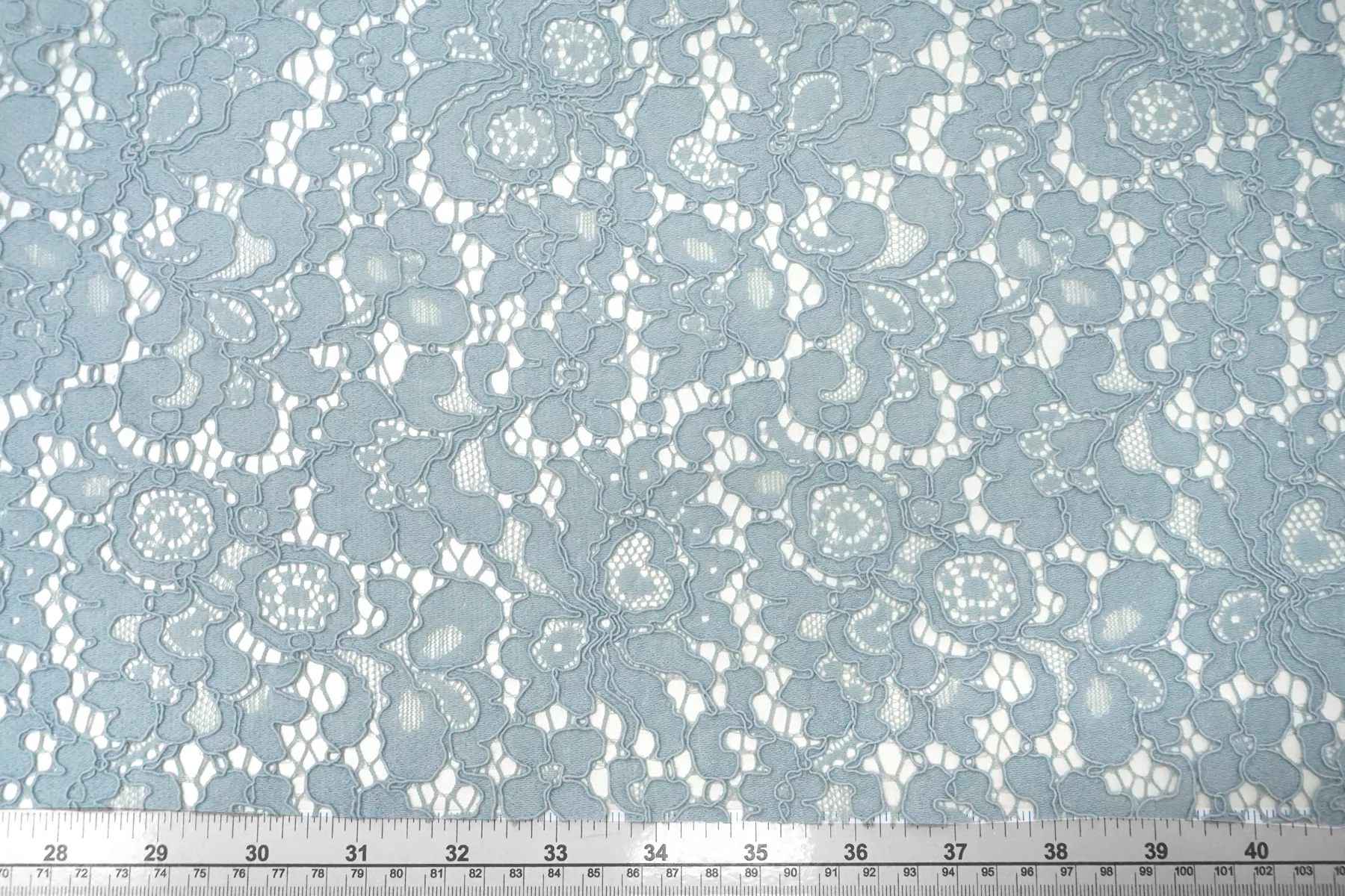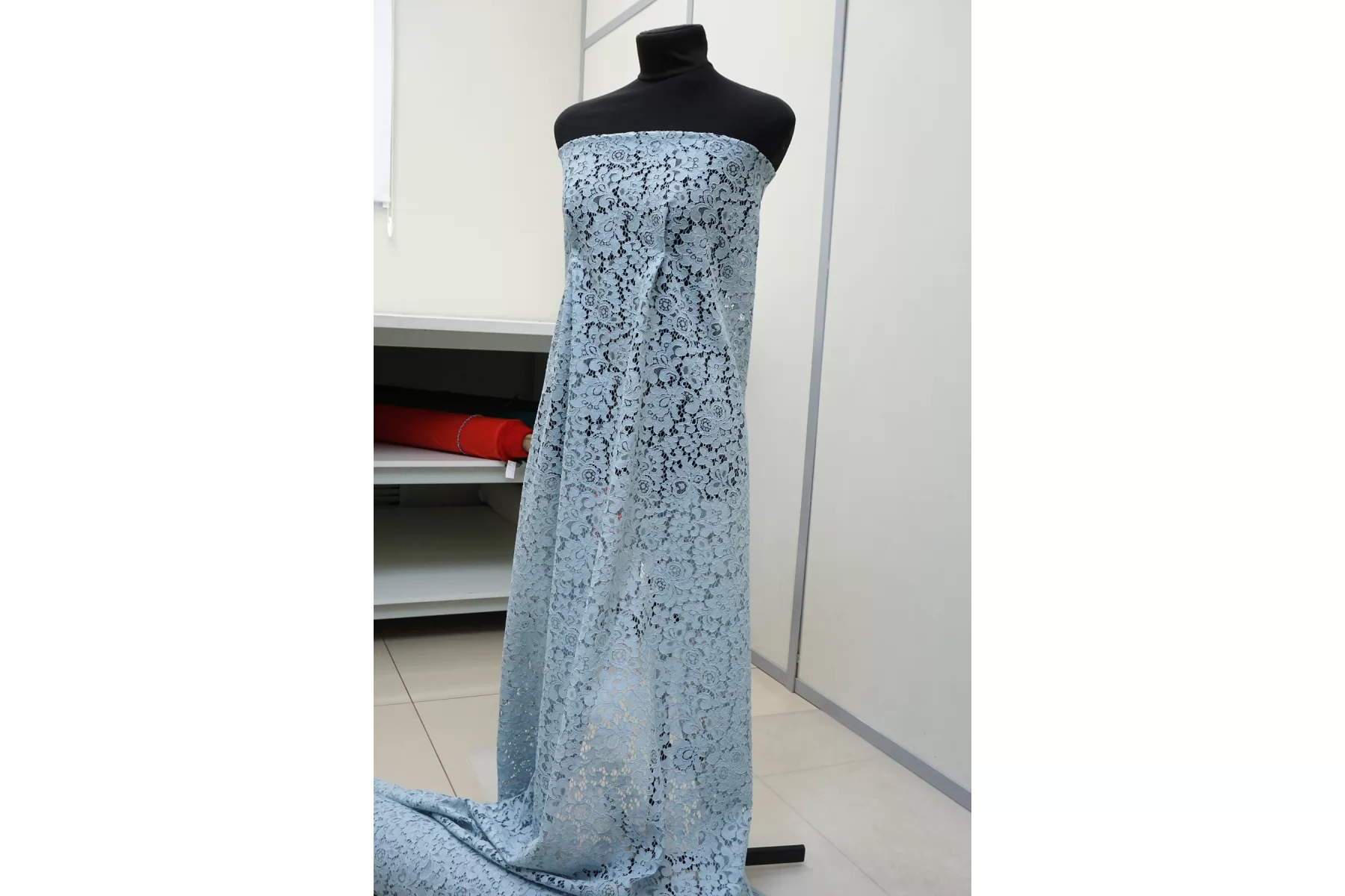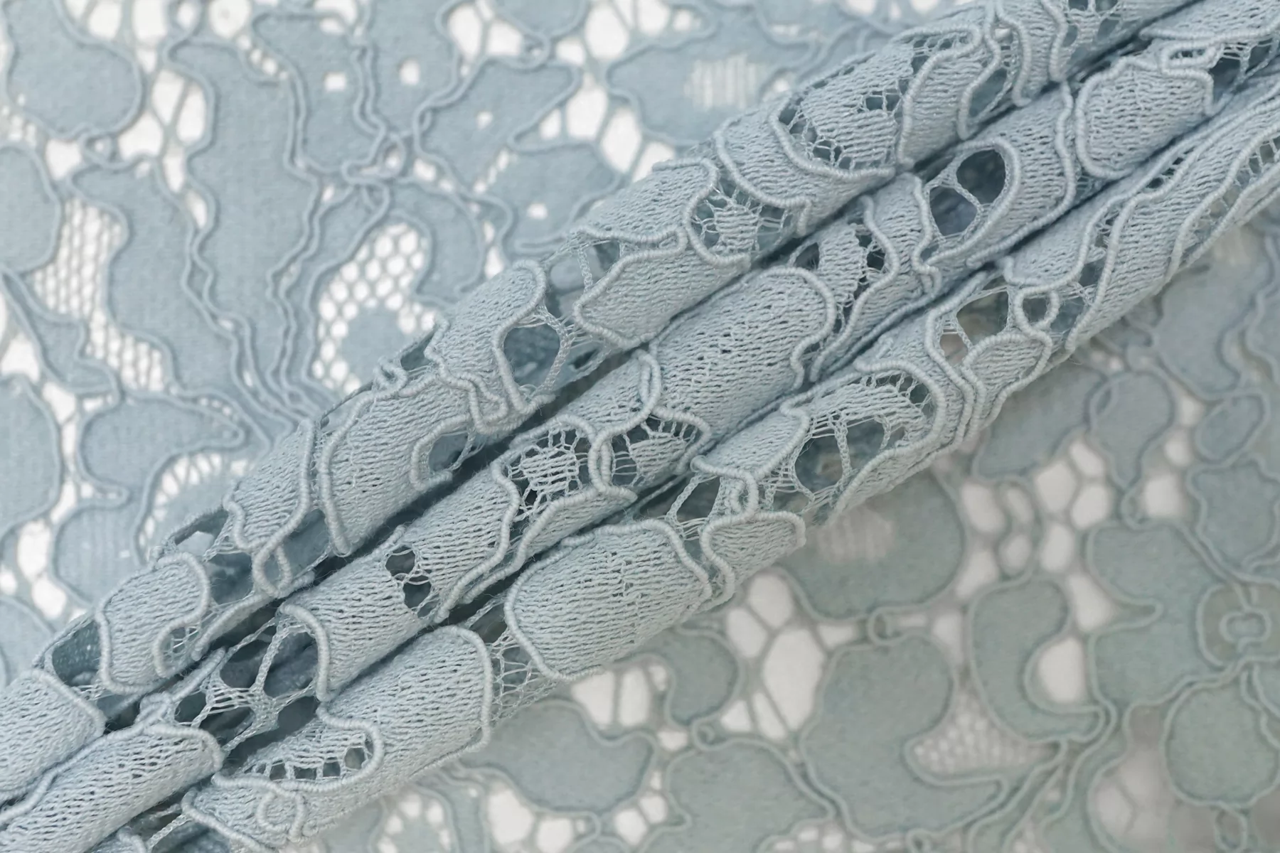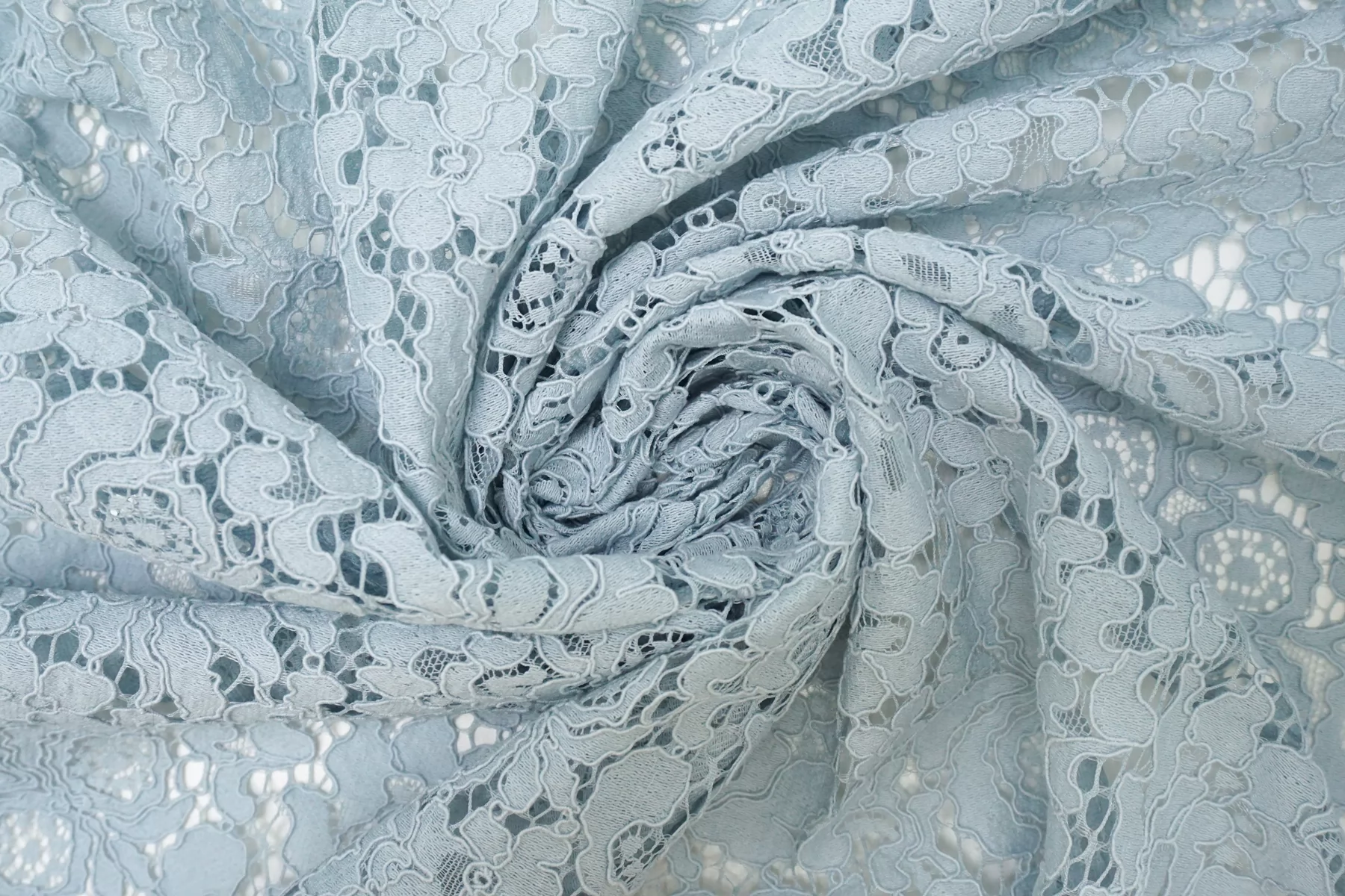 Очень красивое итальянское хлопковое кружево красивого серого цвета с голубым подтоном с цветочной выработкой и кордовым шнуром. Тактильно материал приятный, мягкий, ощущается выработка. Прекрасен в своей пластике. Подойдет для пошива нарядного самостоятельного изделия (на подкладе ) или отделки отдельных элементов одежды.