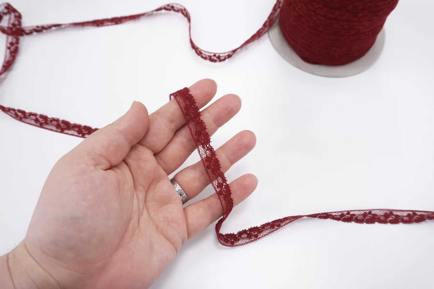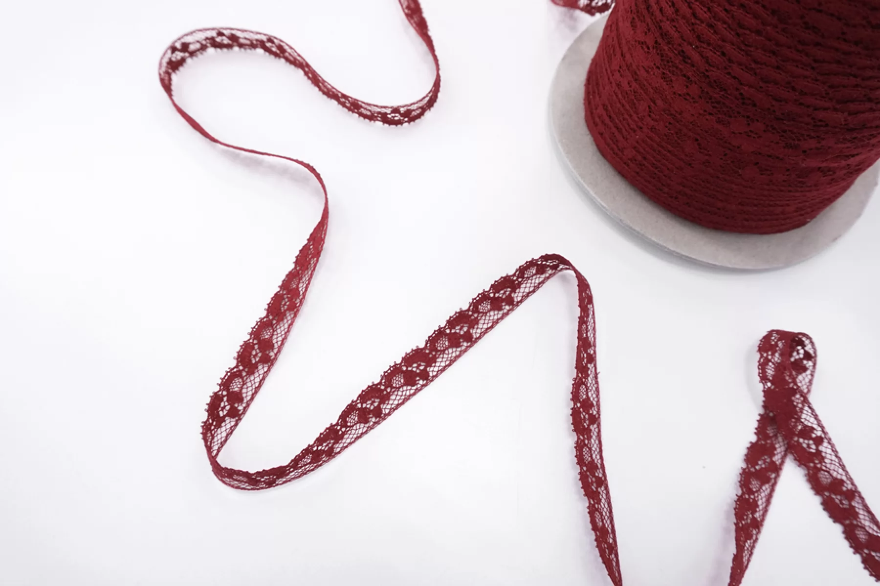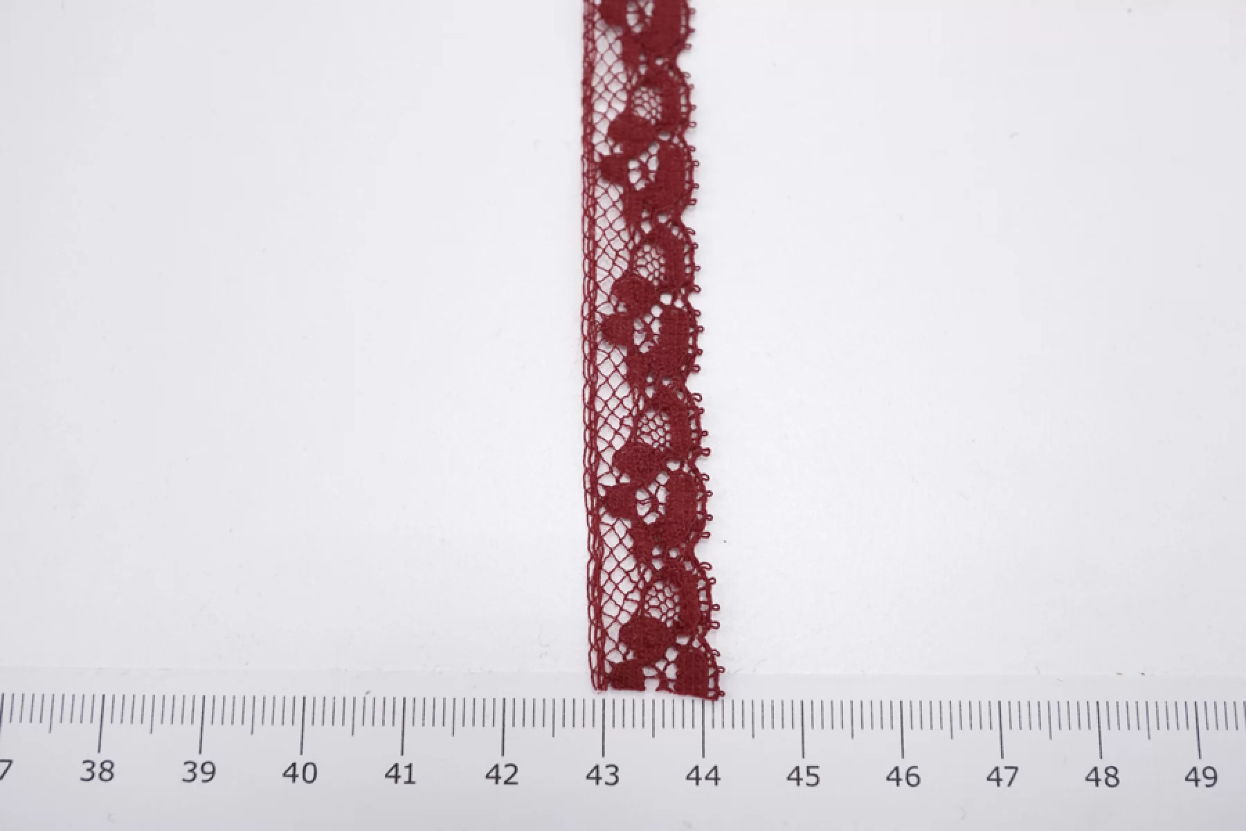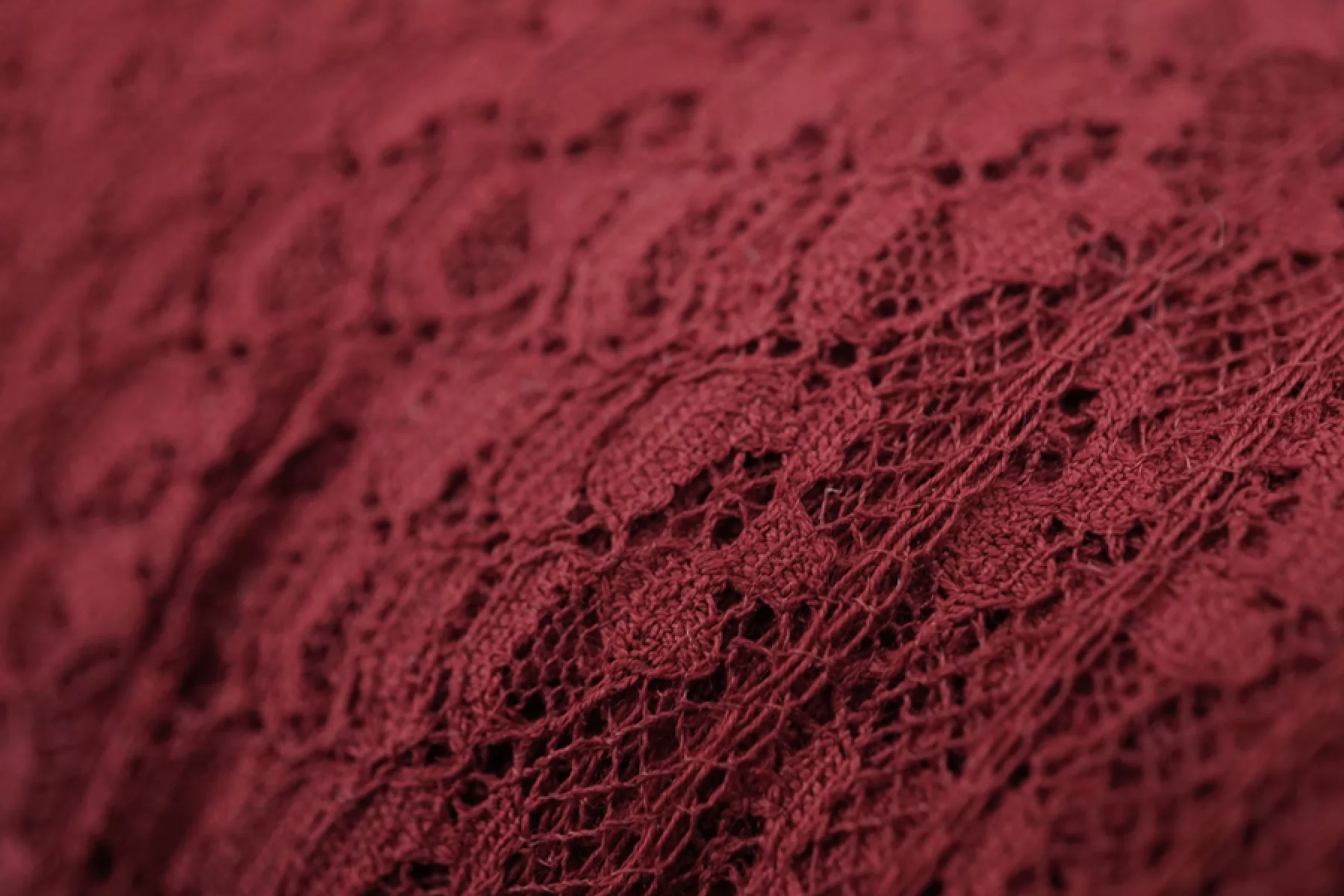 Итальянское хлопковое кружево темно-красного цвета. Жестковатое, не тянется. Отлично подойдет для пошива нижнего белья, отделки одежды и аксессуаров.