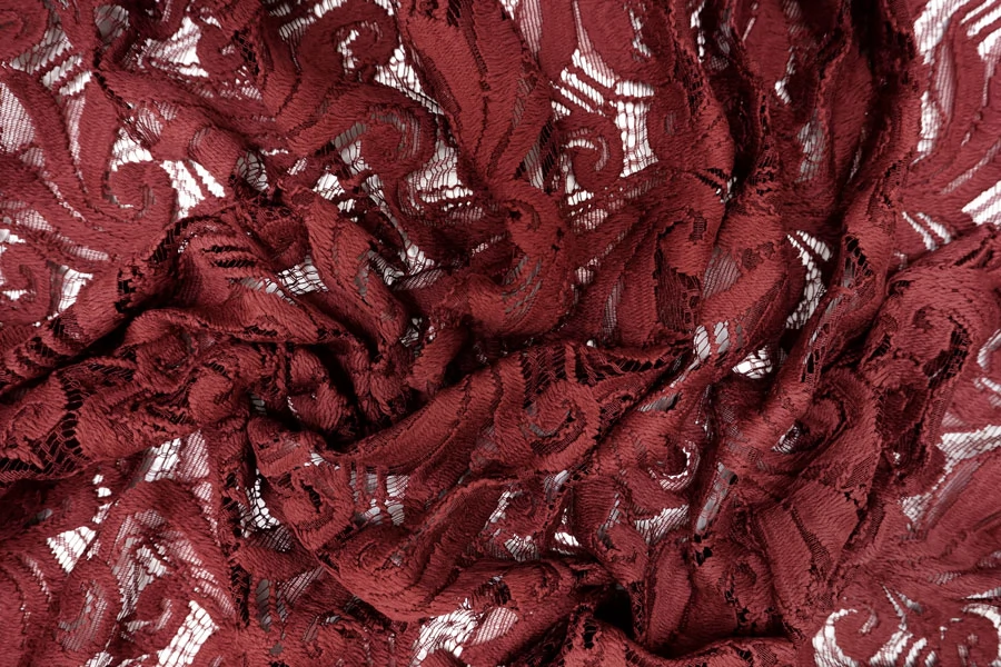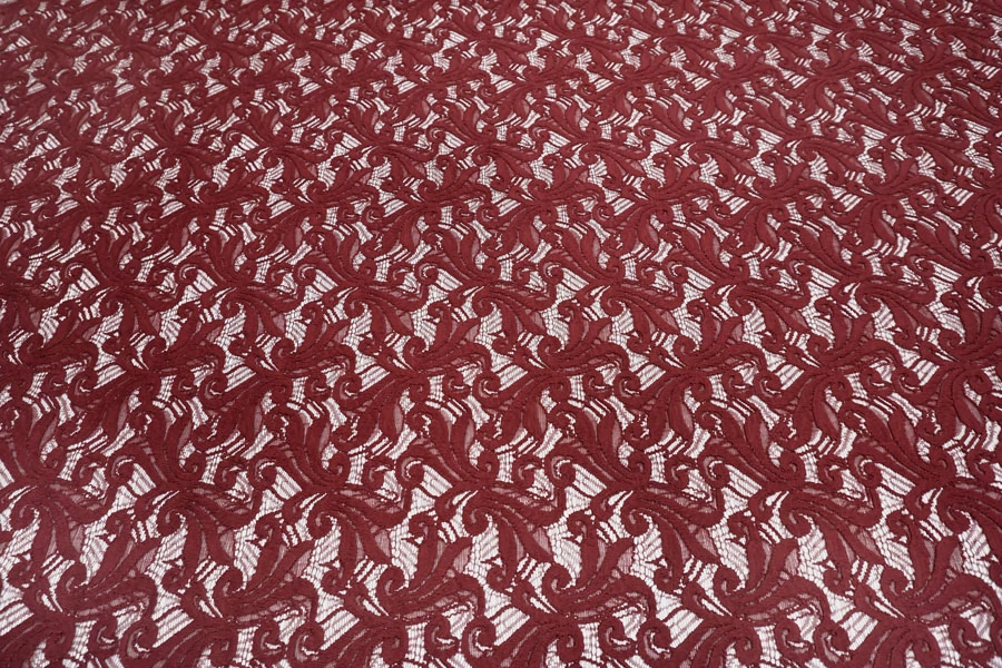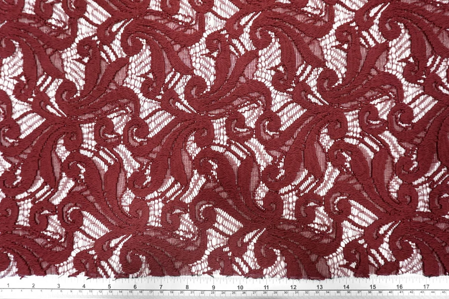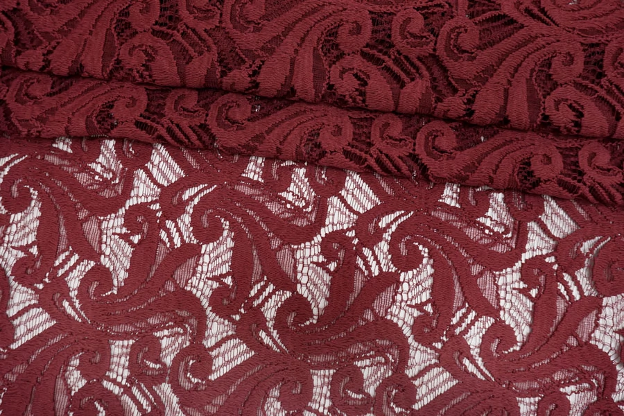 Очень красивое итальянское хлопковое кружево от Max Mara с абстрактным узором, в бордовом цвете. Смотрится очень красиво и дорого! Тактильно материал приятный, мягкий, ощущается выработка. Прекрасен в своей пластике. Подойдет для пошива нарядного самостоятельного изделия (на подкладе ) или отделки отдельных элементов одежды.