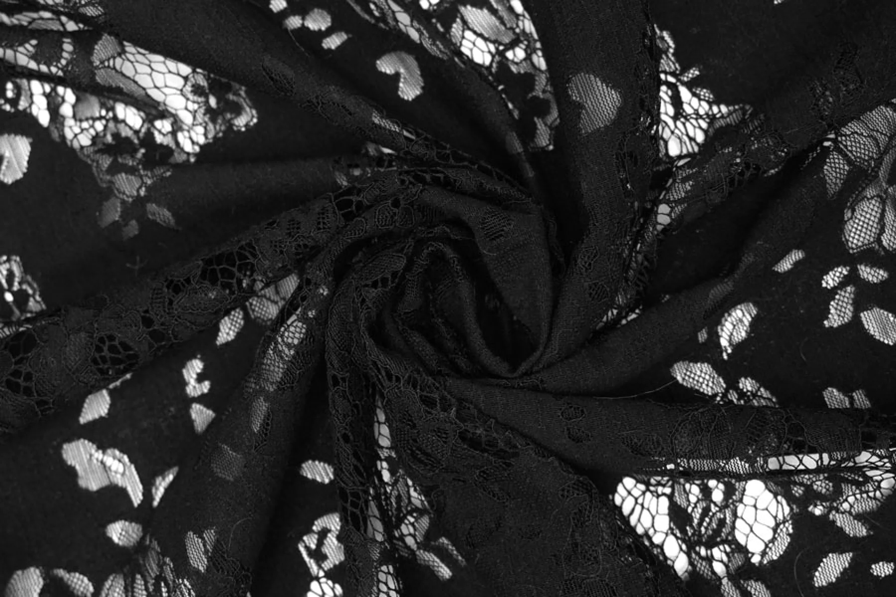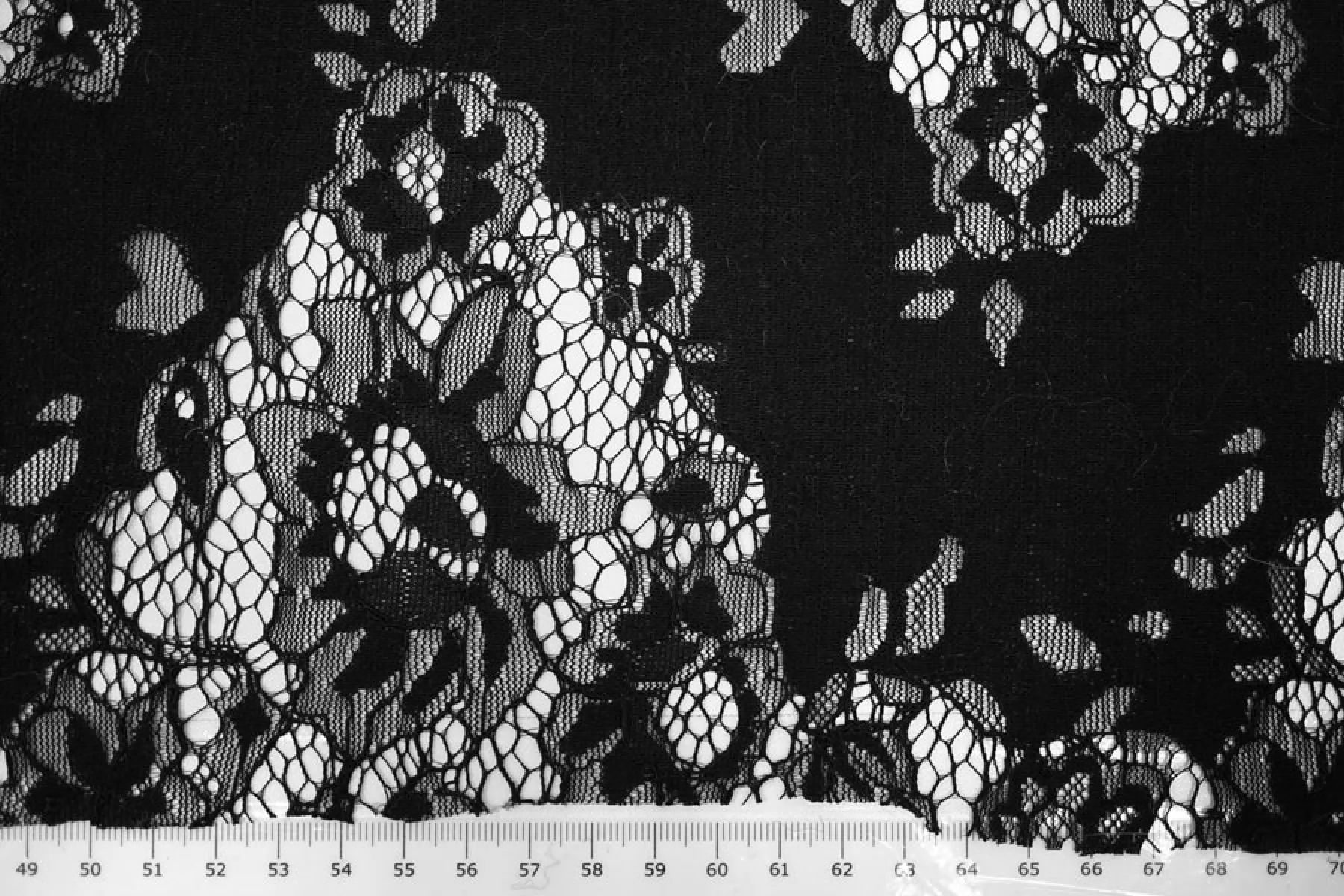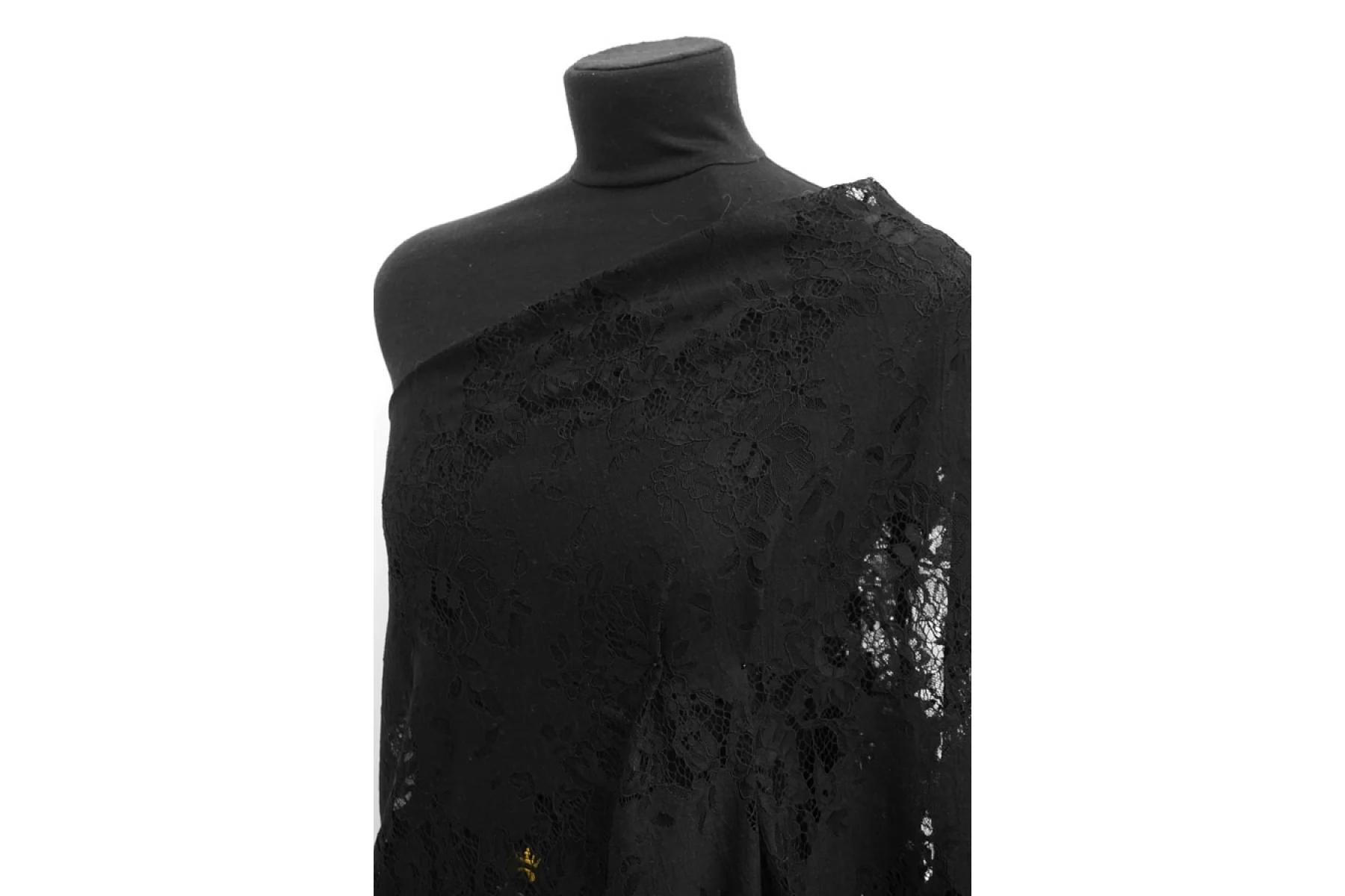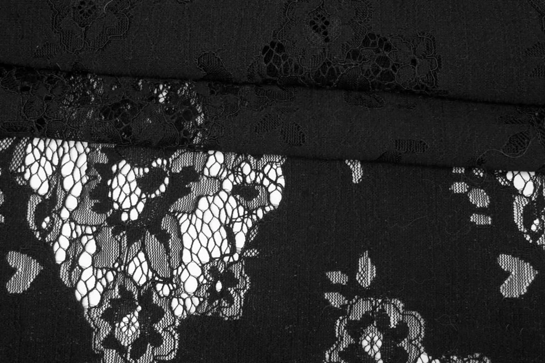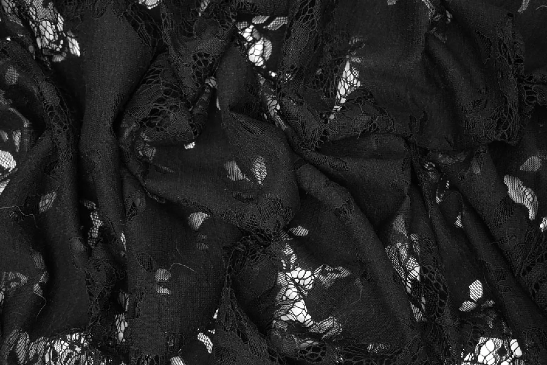 Очень красивое итальянское кружево черного оттенка с цветочным узором. Основа материала - нейлоновые нити, на которых расшито кружево кордовой хлопковой нитью. Тактильно материал приятный и мягкий, шероховатый. Тонкий, полупрозрачный. Практически не тянется. Смотрится очень красиво. Прекрасно для пошива нарядного самостоятельного изделия (на подкладе) или отделки отдельных элементов одежды.