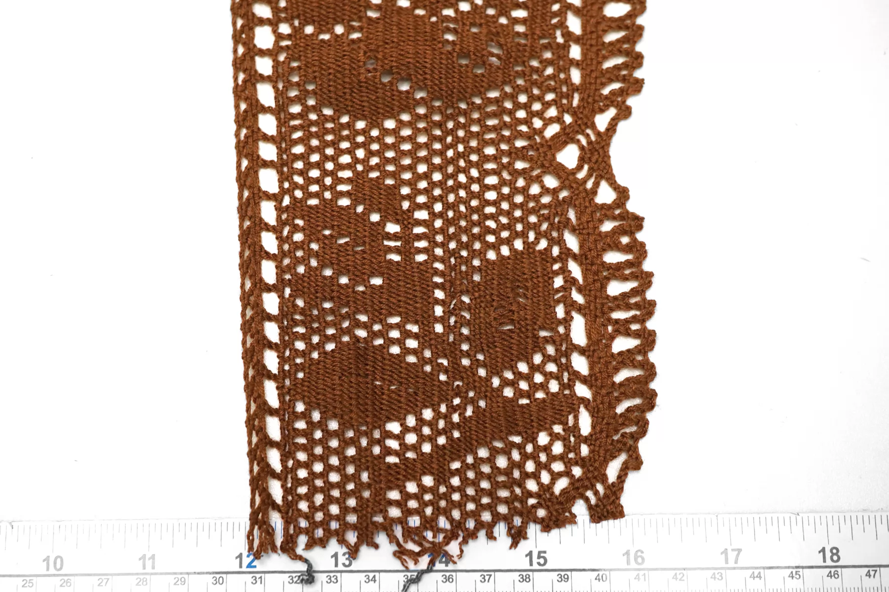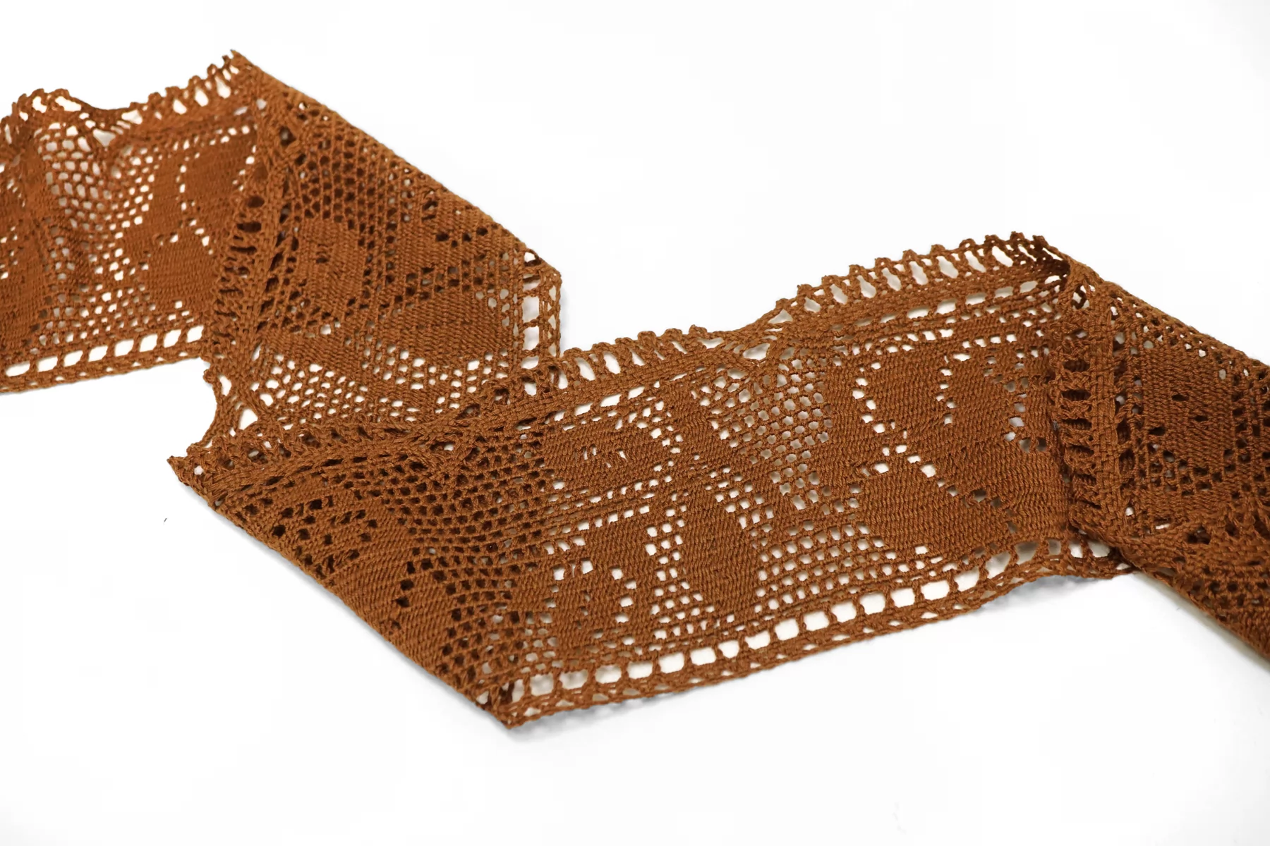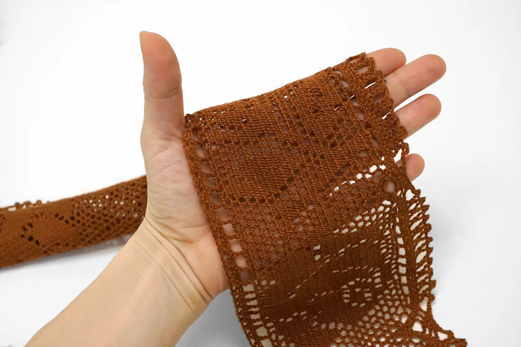Итальянское отделочное кружево-тесьма коричневого цвета из хлопка. Мягкое, пластичное. Не тянется. Отлично подойдет для отделки одежды и аксессуаров.