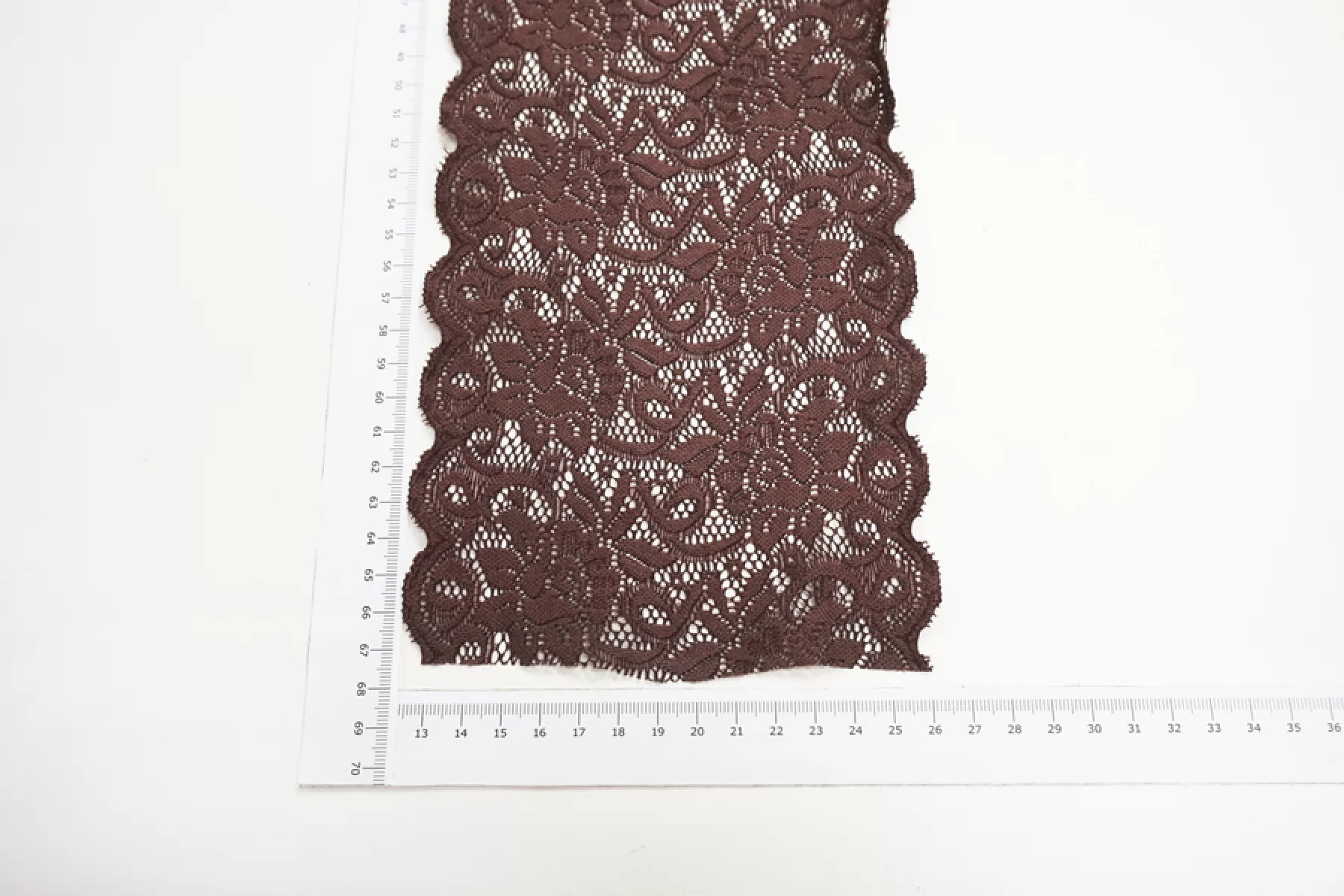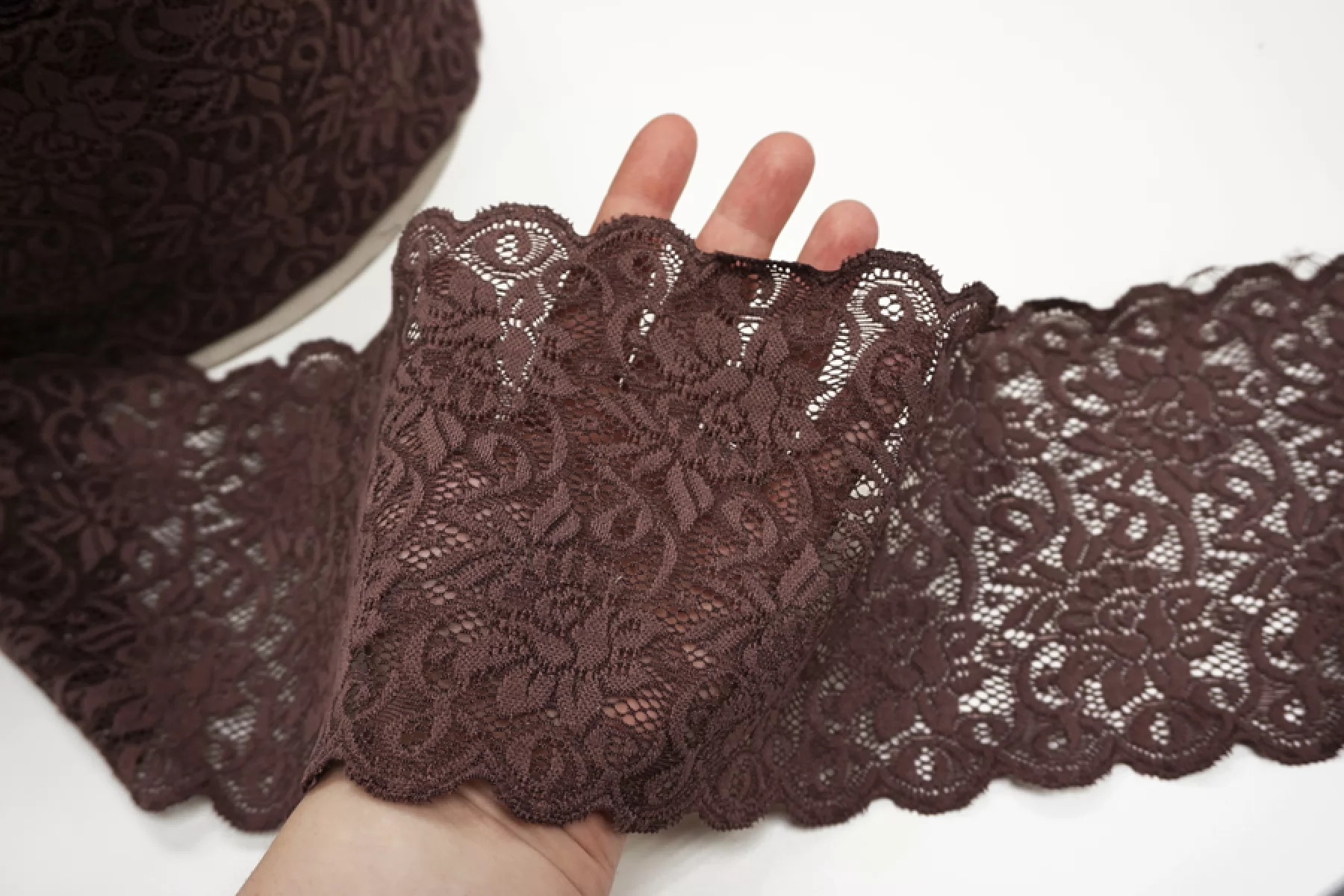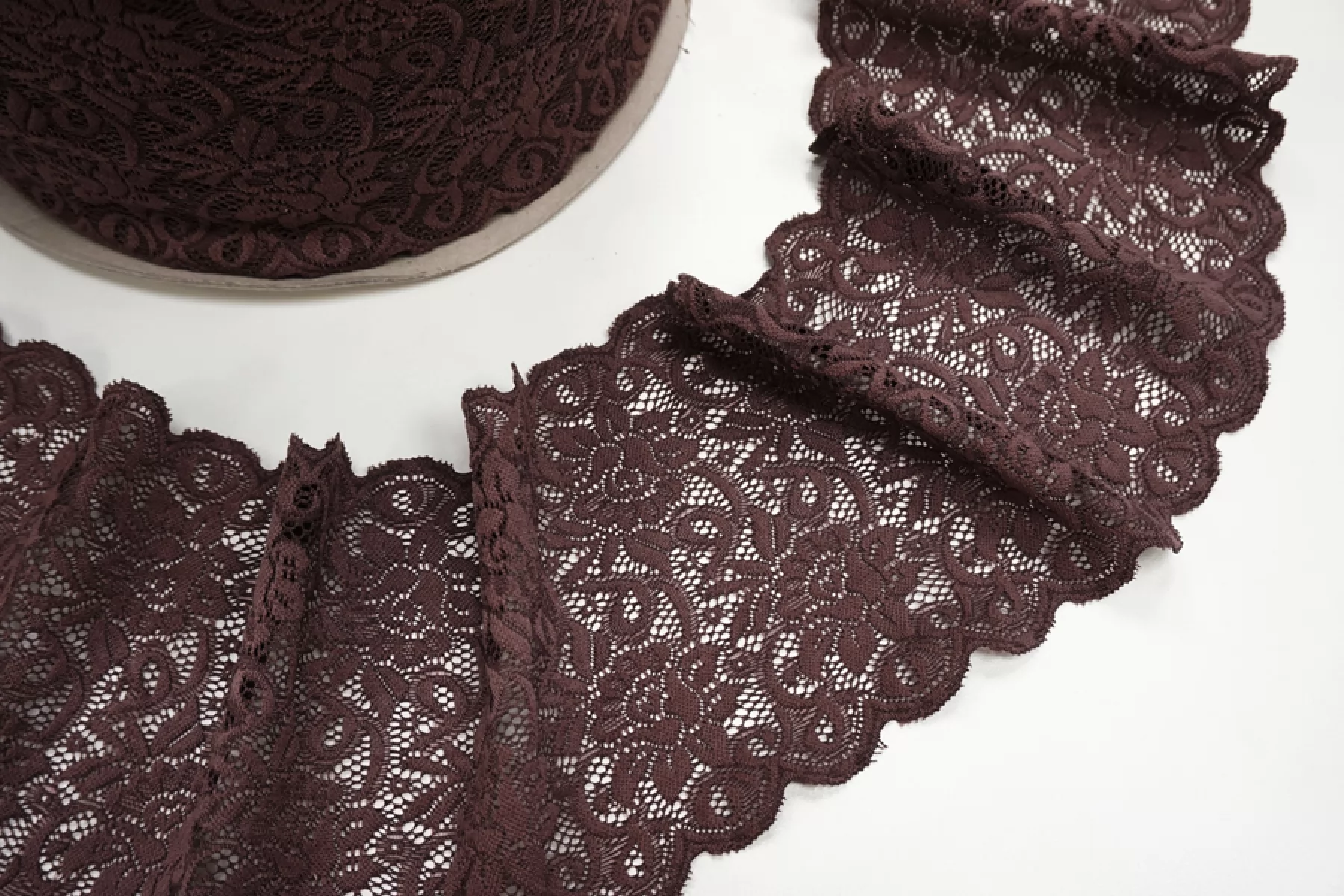 Итальянское кружево коричневого цвета с фиолетовым подтоном. Мягкое, пластичное. Отлично подойдет для пошива нижнего белья, отделки одежды и аксессуаров.